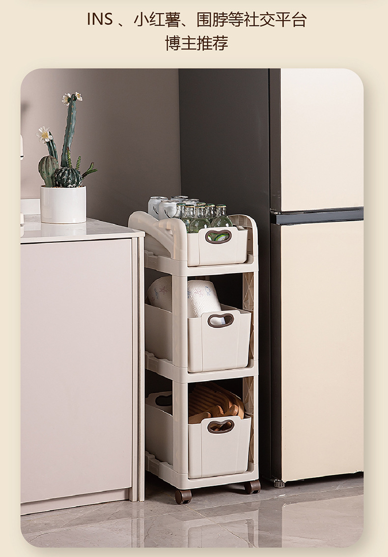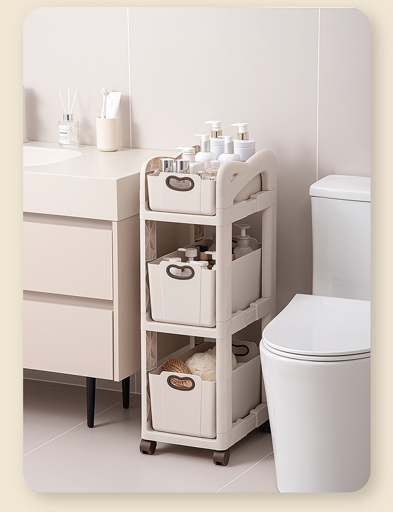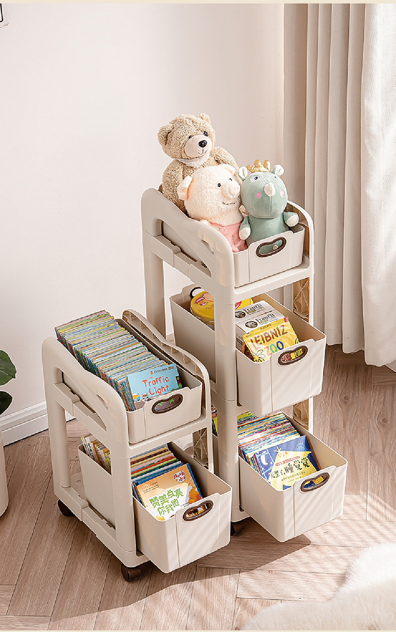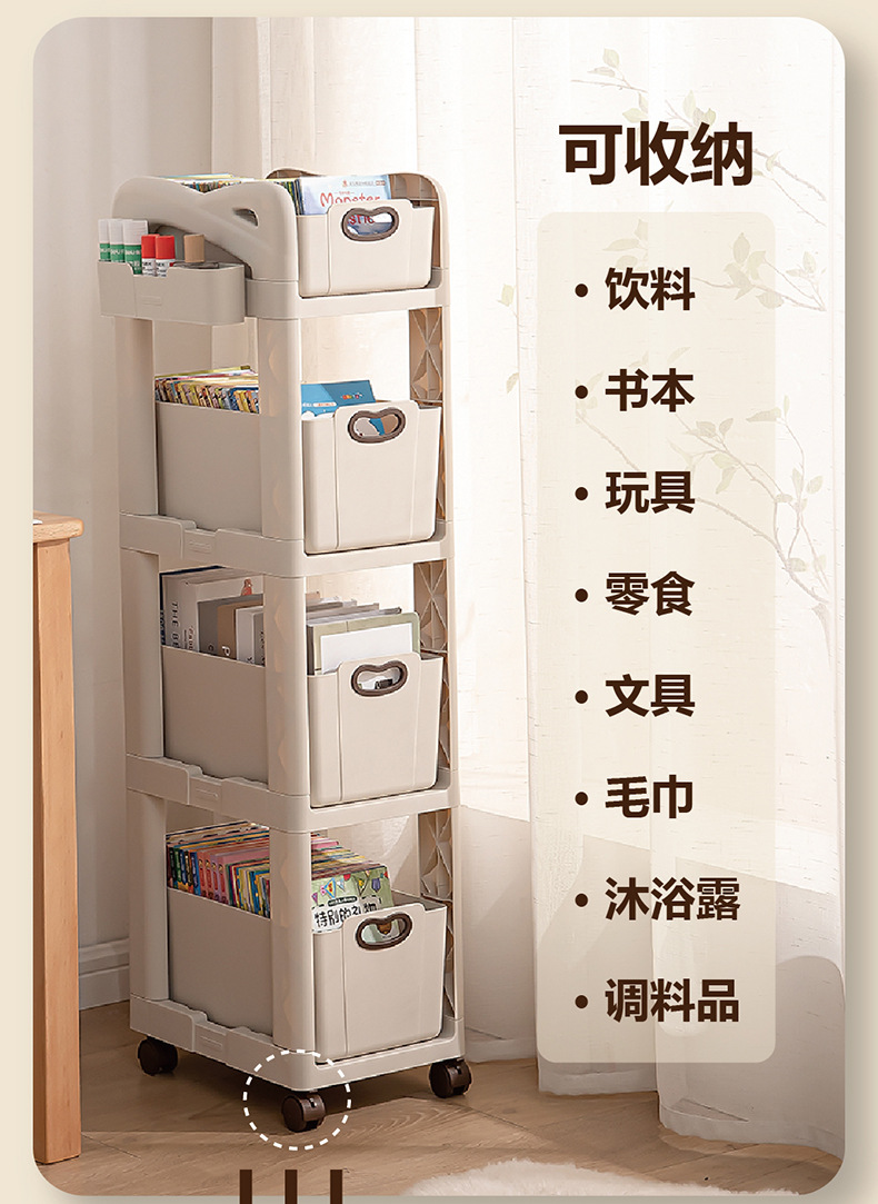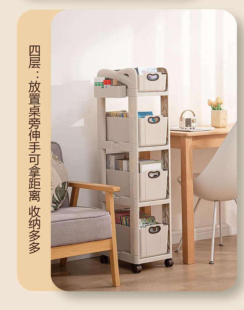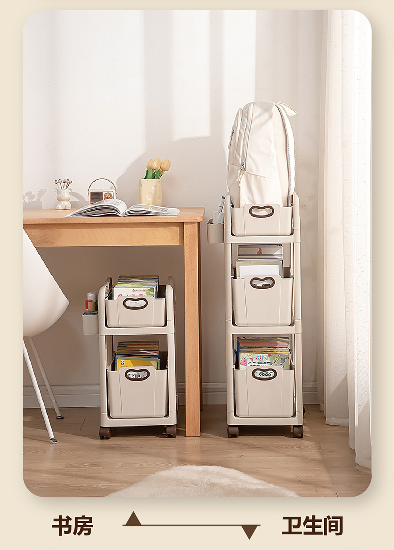제조사의 기성 플라스틱 수납선반, 이동식 수납선반, 좁은 간격의 바닥에서 천장까지 이어지는 책장, 잡다한 물품 수납스토어 가기