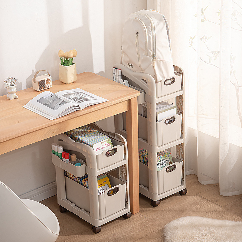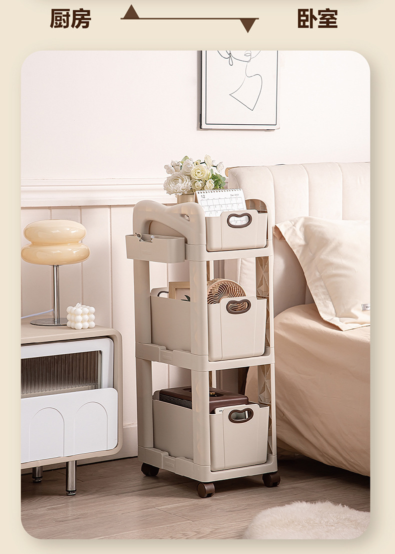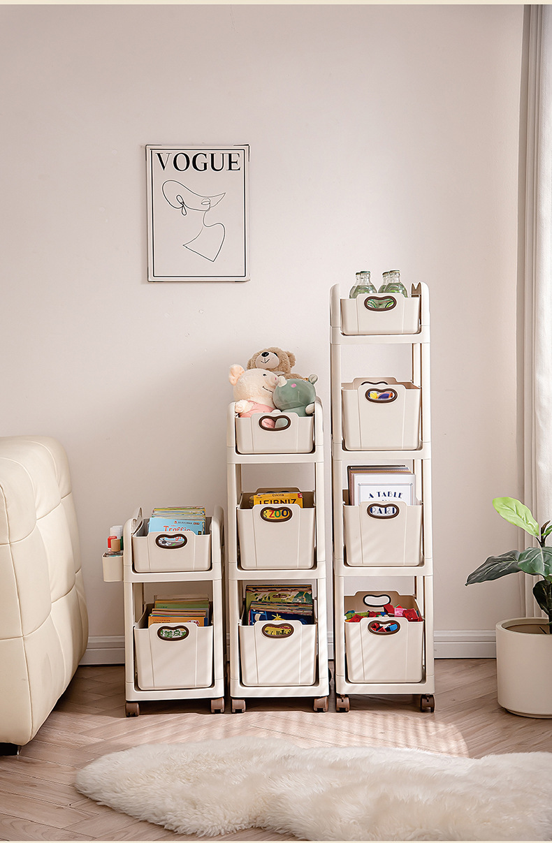 제조사의 기성 플라스틱 수납선반, 이동식 수납선반, 좁은 간격의 바닥에서 천장까지 이어지는 책장, 잡다한 물품 수납
