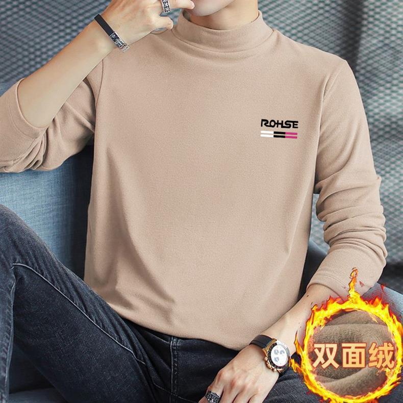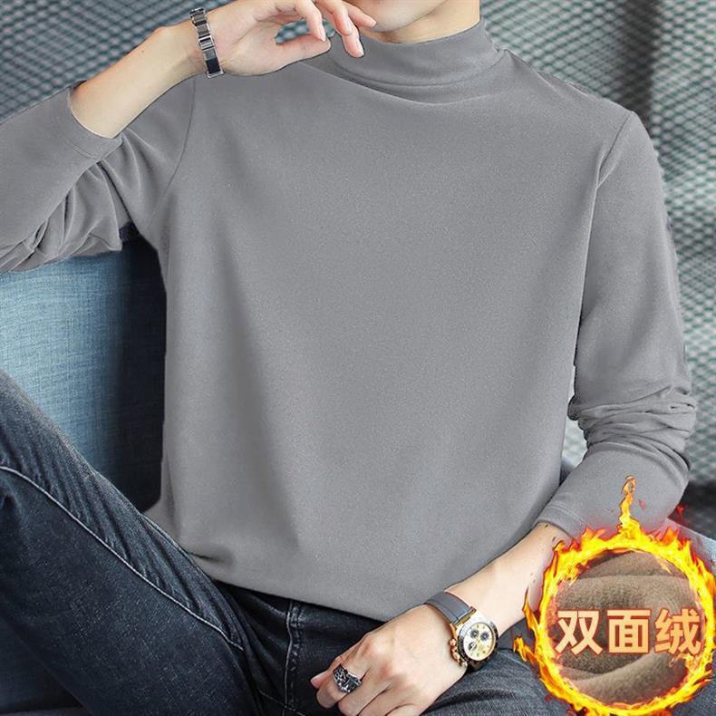 양면 벨벳베이스 셔츠 남성용 솔리드 컬러 반 하이 넥 긴팔 티셔츠 남성용 기모 두꺼운 내부 착용 일정한 온도 따뜻함