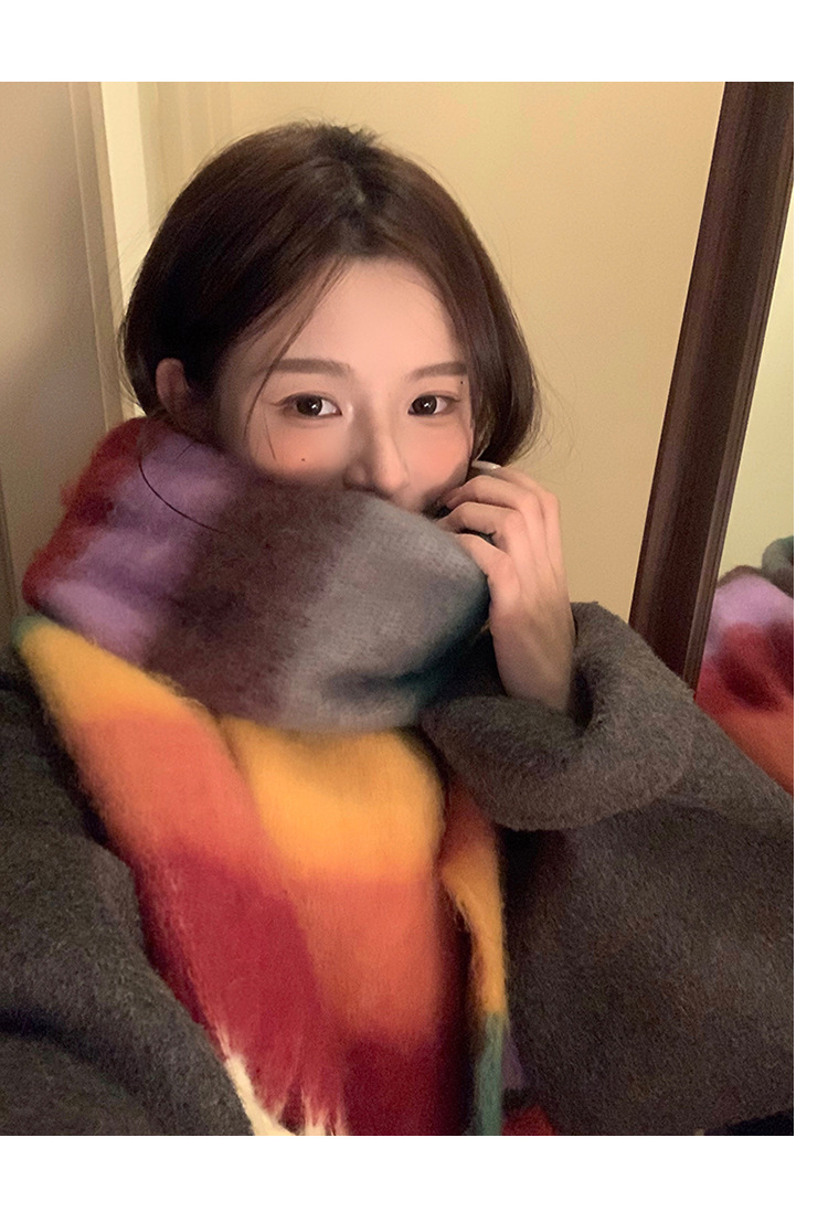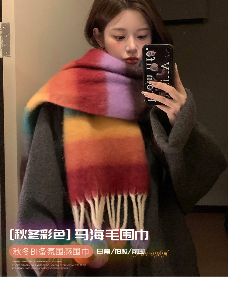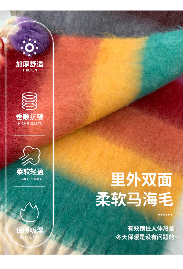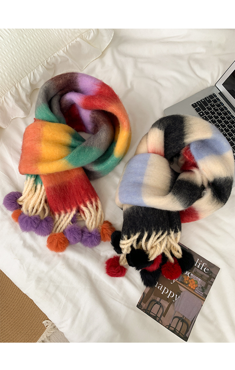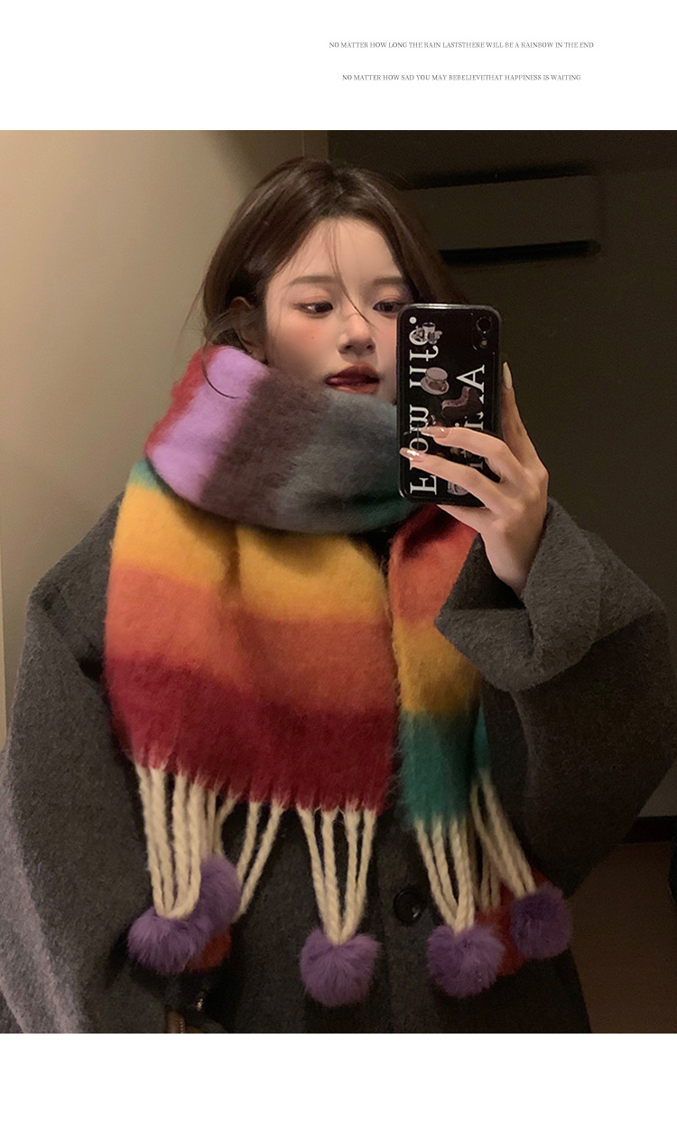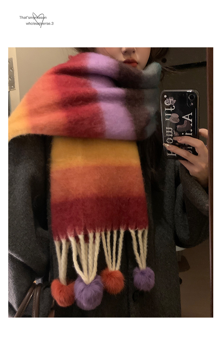 고급 스카프 여성용 겨울 모피 볼 따뜻한 도파민 스카프 소프트 왁스 레인보우 스트라이프 감기 방지 긴 목도리 트렌디스토어 가기