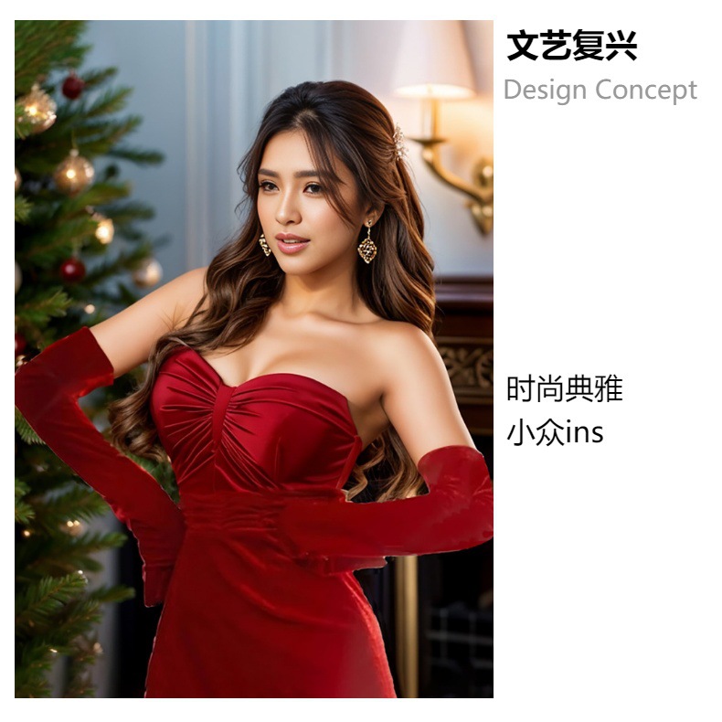 크리스마스 황금 벨벳 여성 따뜻한 긴 복고풍 댄스 무대 공연 대본 살해 사진 에티켓 장갑스토어 가기