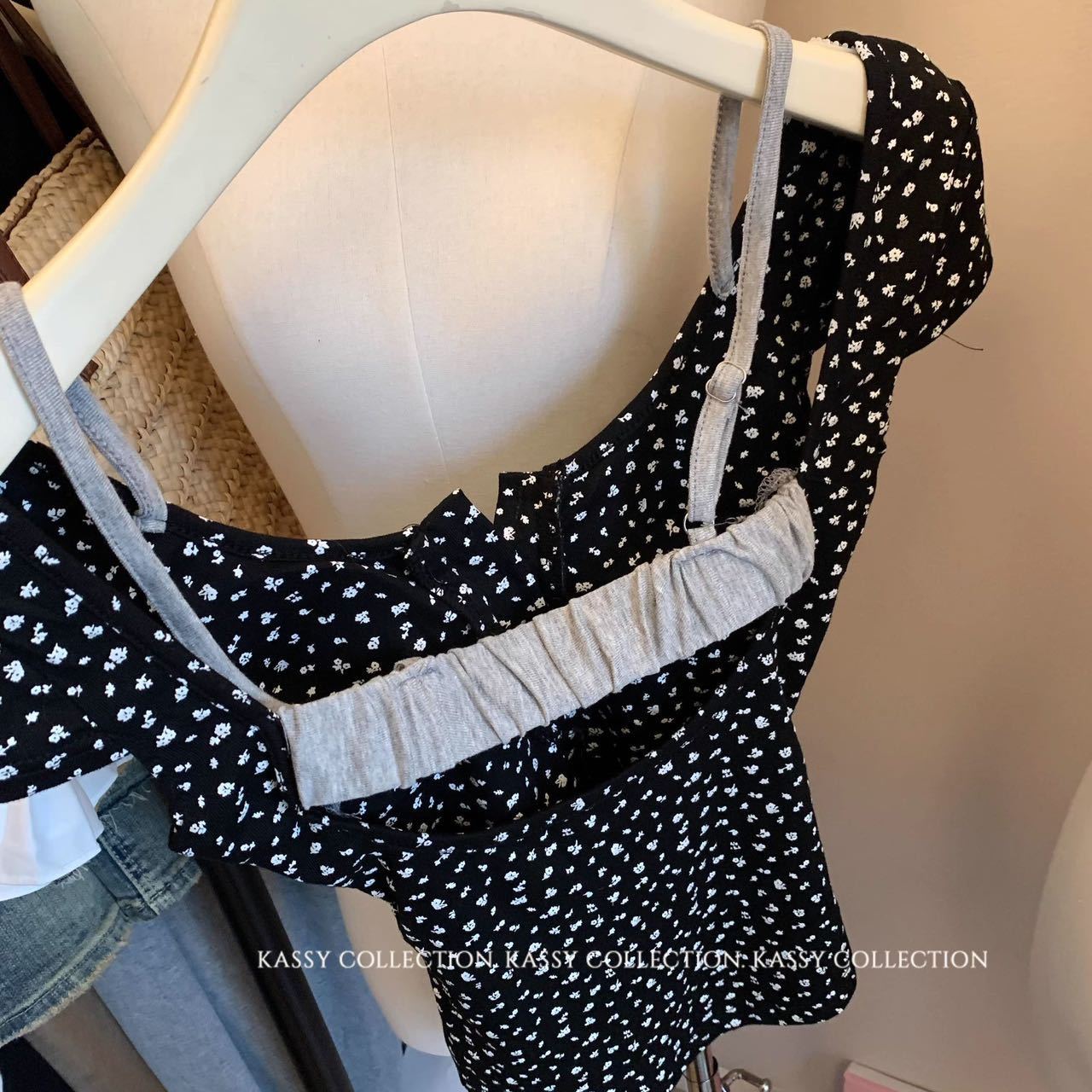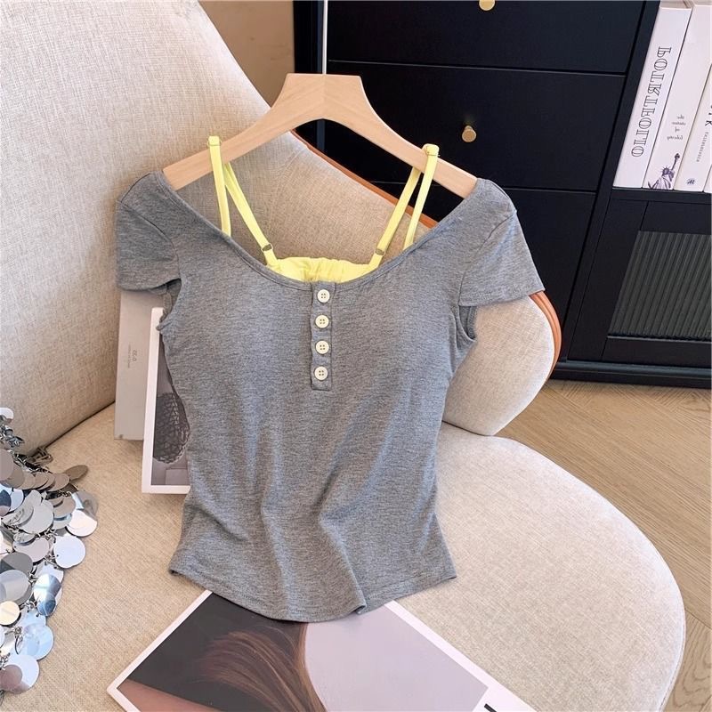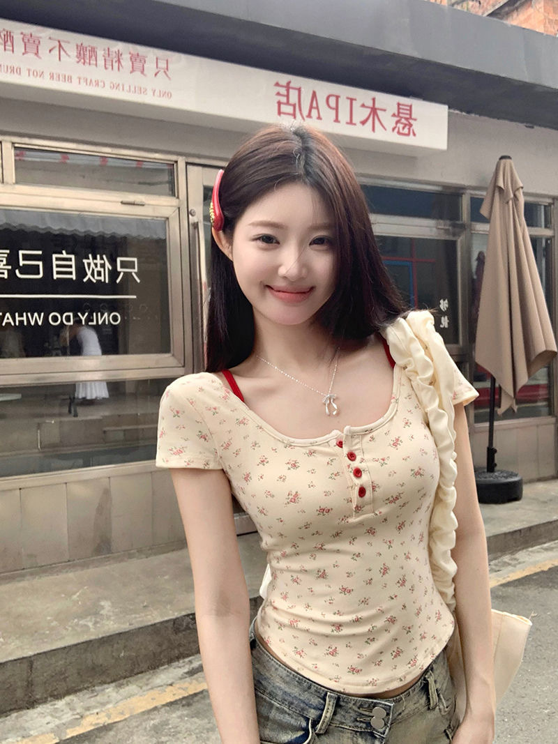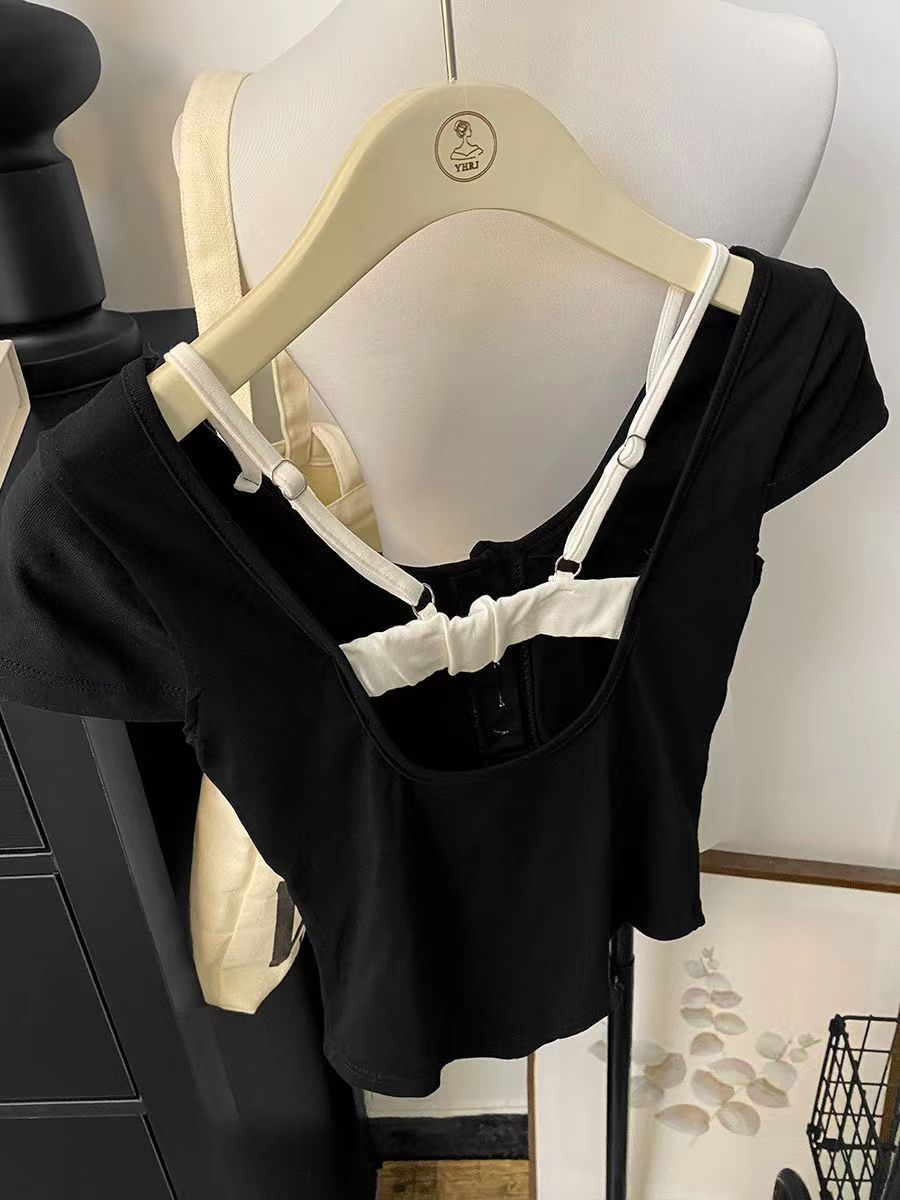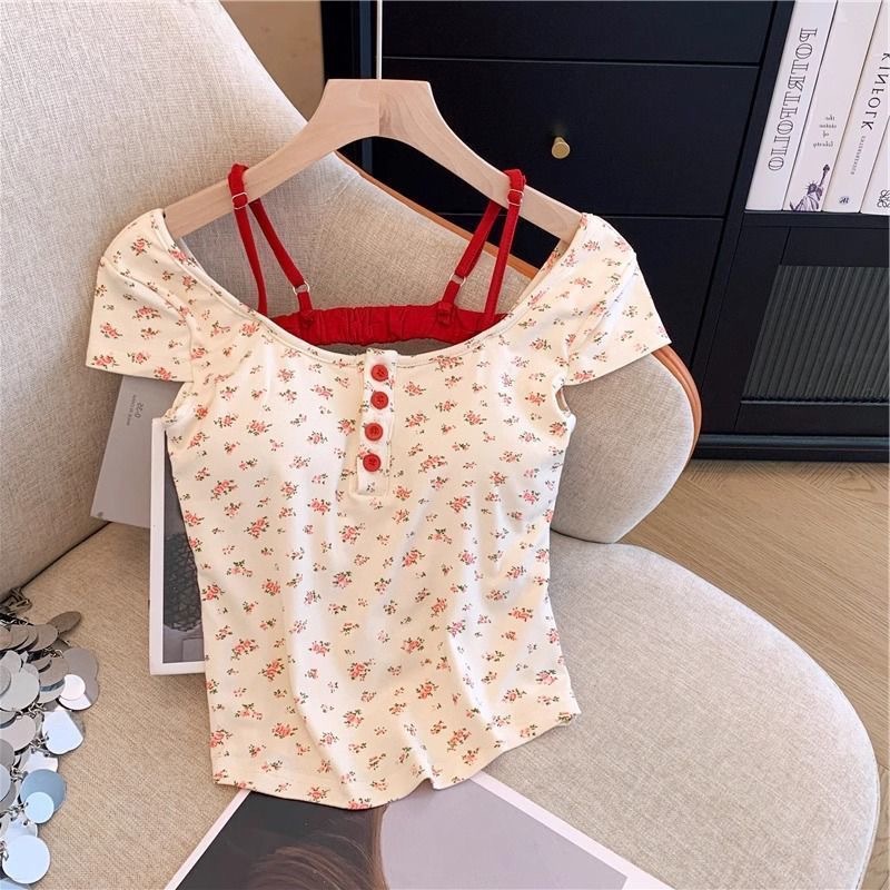 스파이스 걸스 퓨어 원해요 가짜 투피스 콘트라스트 컬러 플로럴 티셔츠 여성용 슬림핏 올매치 아우터 쇼트탑 여성용 브래킷 패드 아름다운 등
