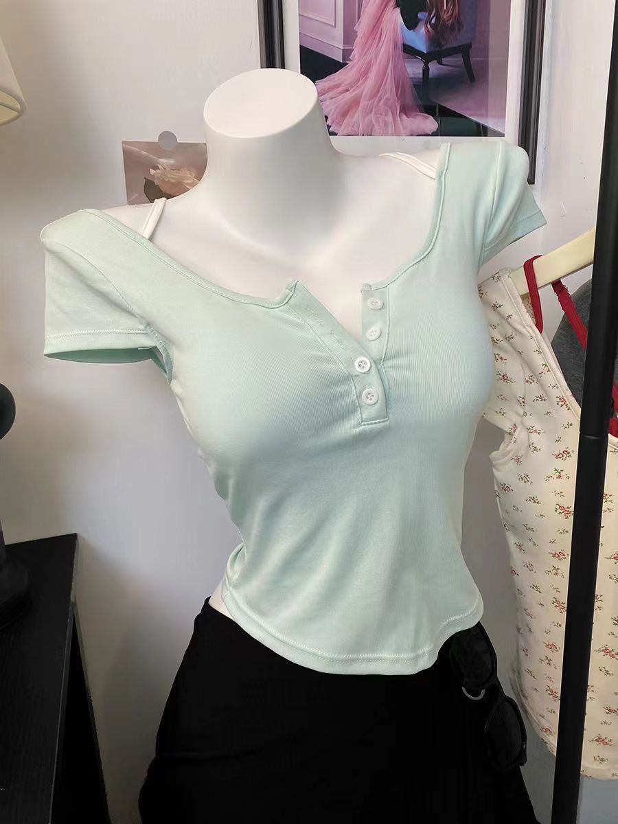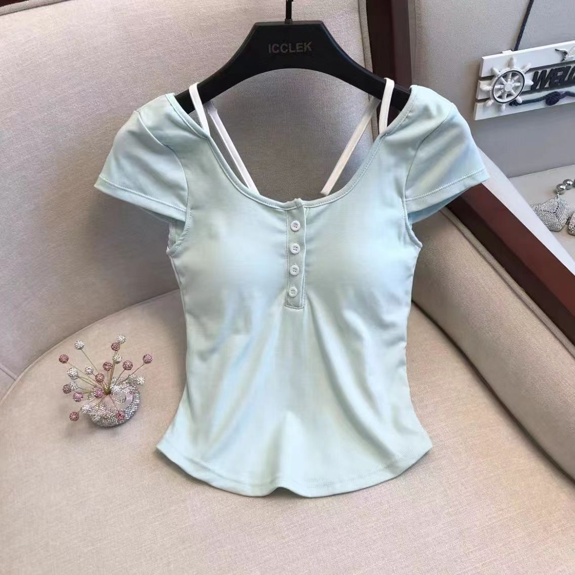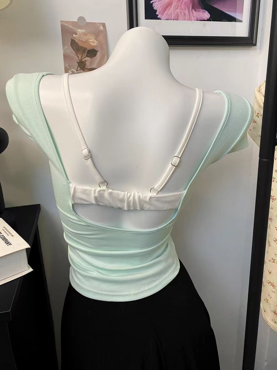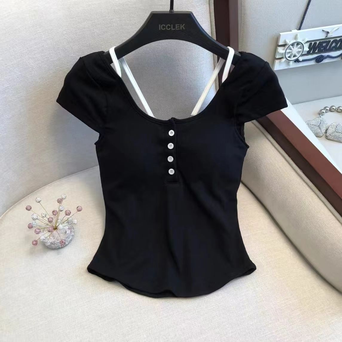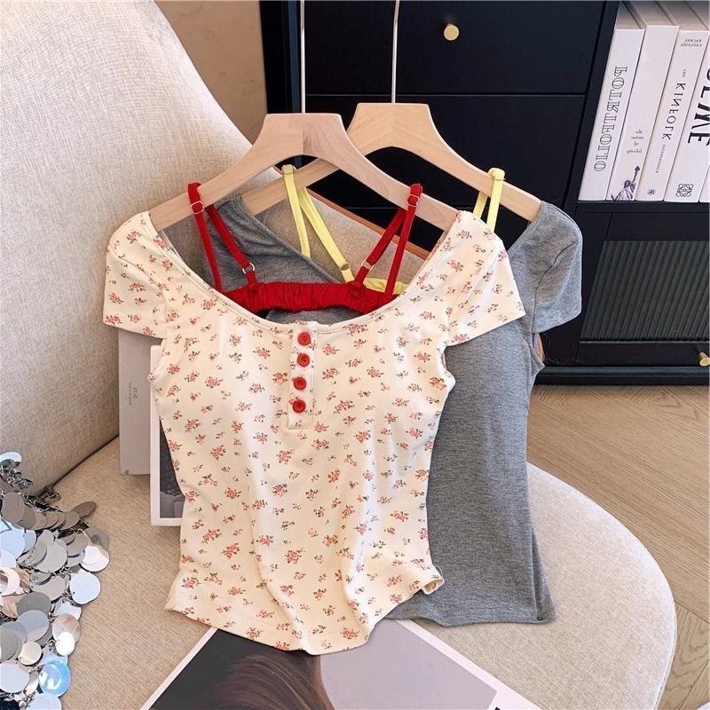 스파이스 걸스 퓨어 원해요 가짜 투피스 콘트라스트 컬러 플로럴 티셔츠 여성용 슬림핏 올매치 아우터 쇼트탑 여성용 브래킷 패드 아름다운 등스토어 가기