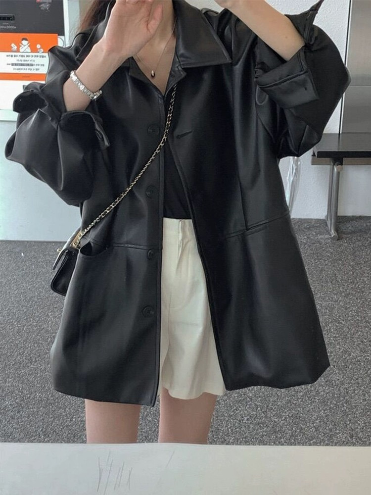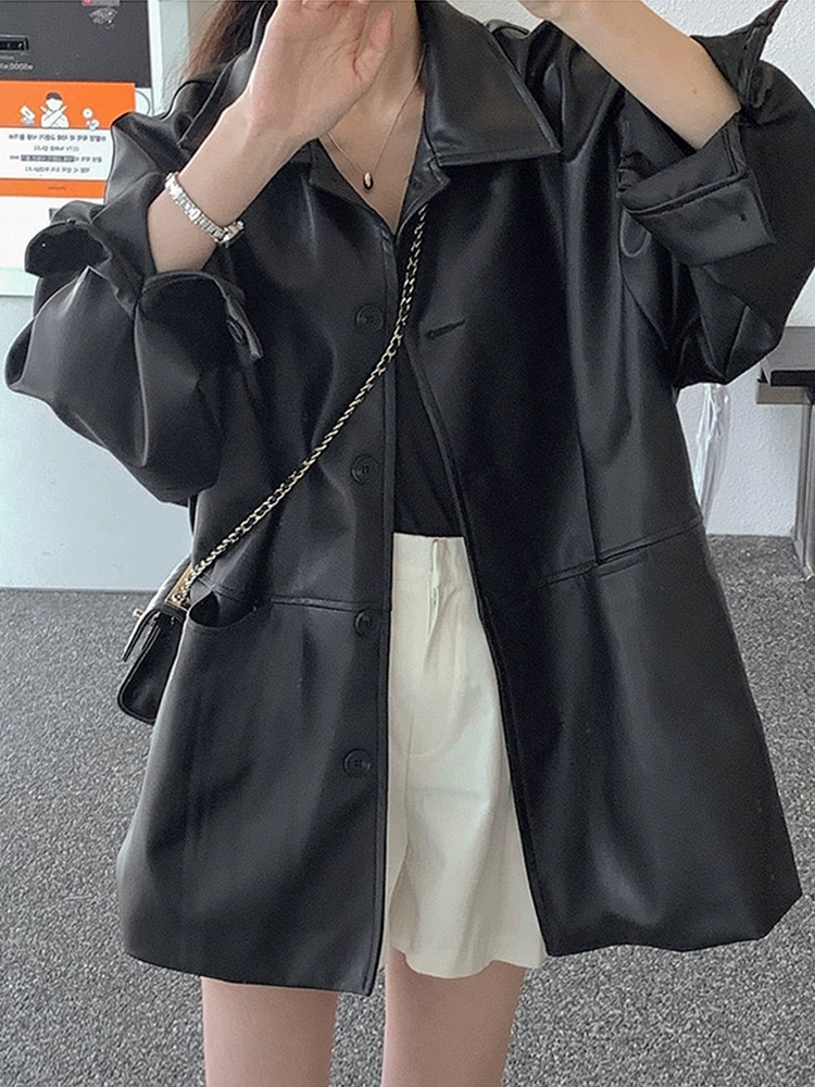 한국 잘 생긴 옷깃 싱글 브레스트 가죽 자켓 여성의 가을 새로운 느슨한 올매치 모방 가죽 자켓 탑 블랙