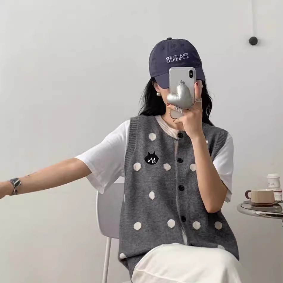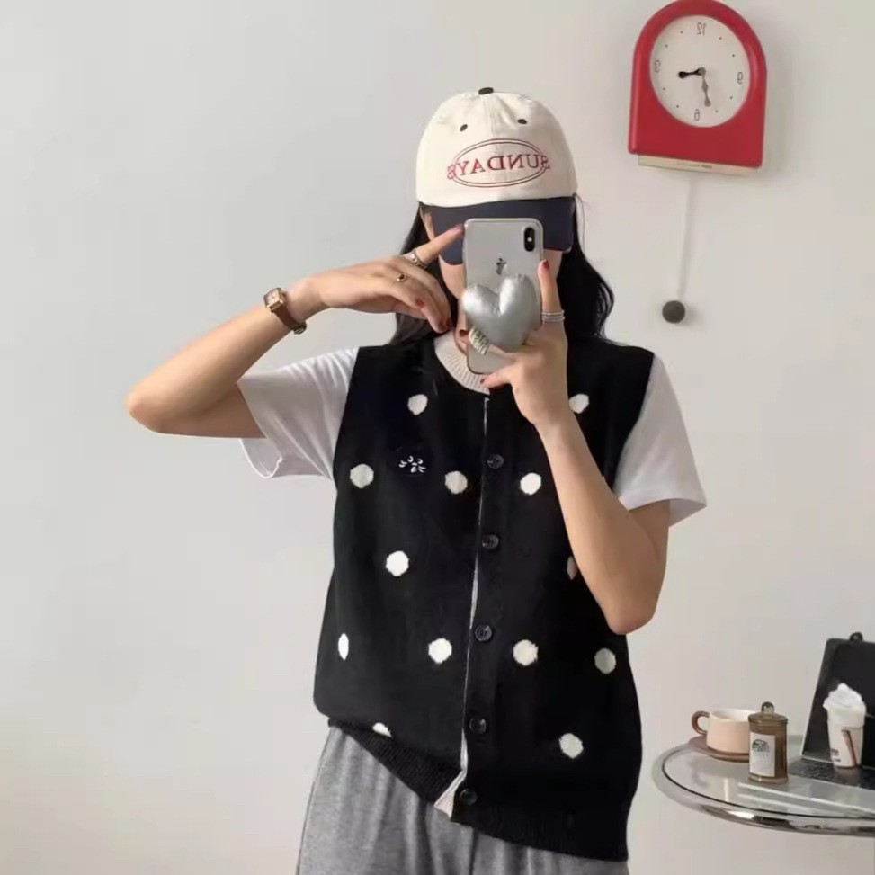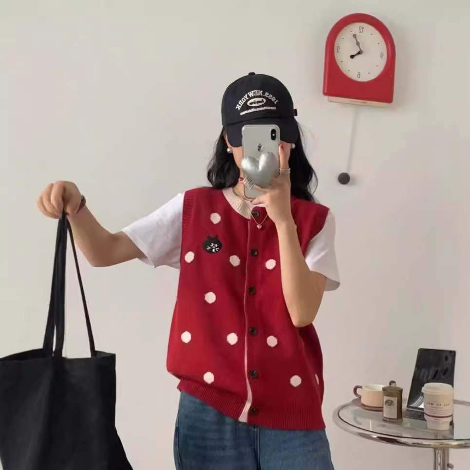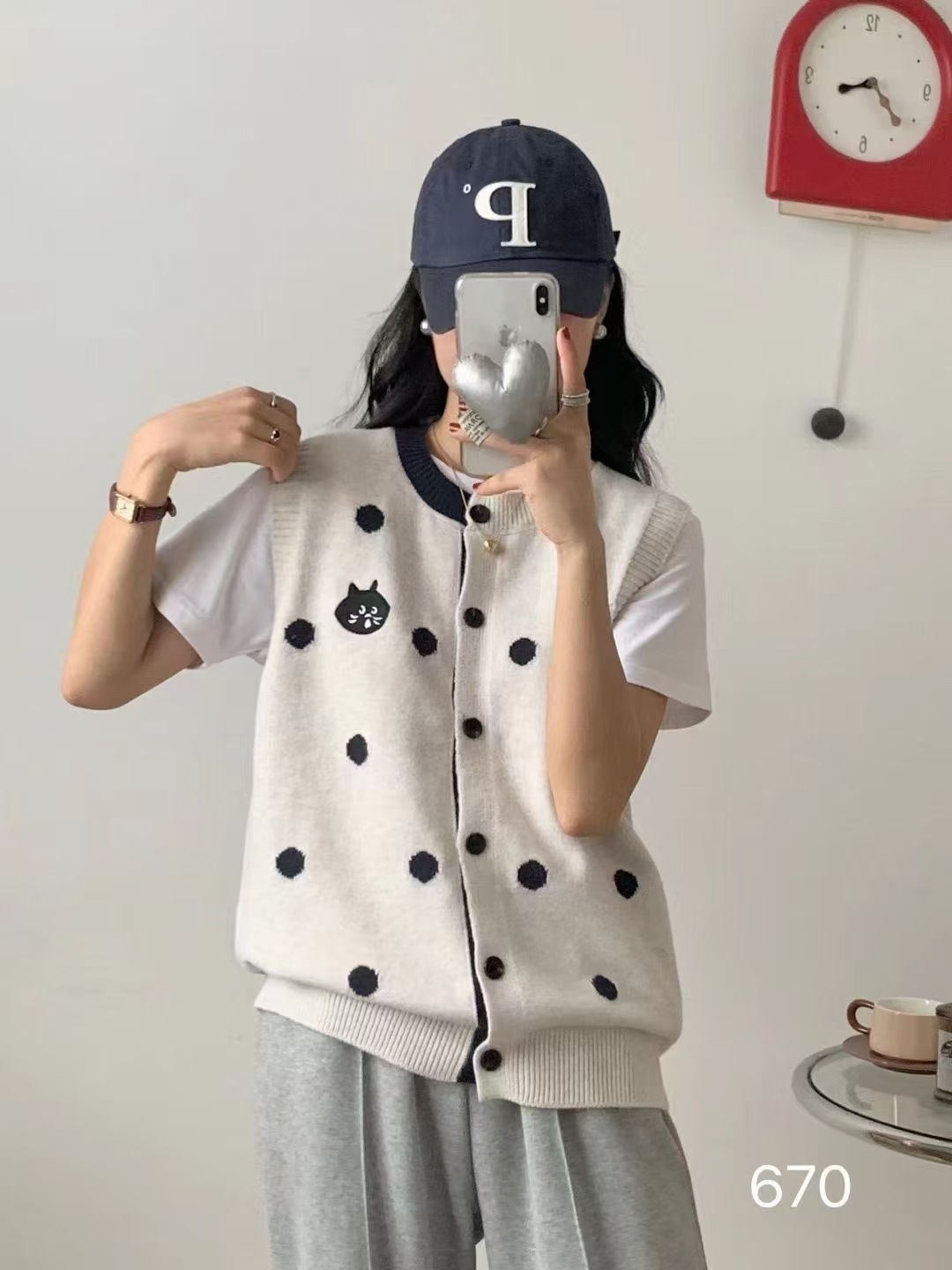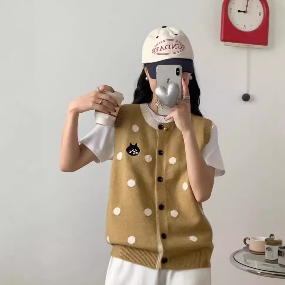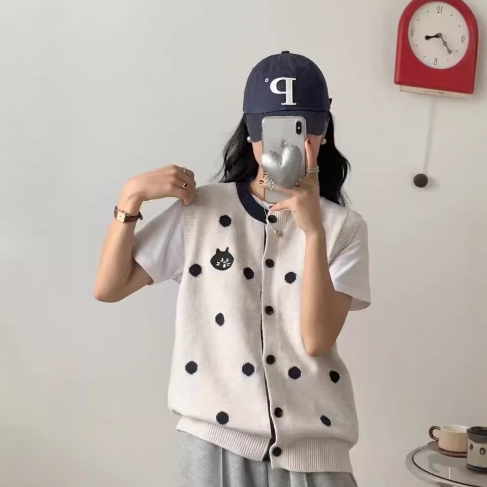 패션 폴카 도트 자카드 조끼 여성용 니트웨어 2024 가을 새 민소매 고양이 머리 둥근 목 조끼 어깨 카디건스토어 가기