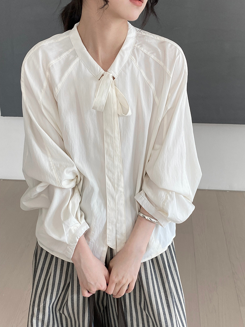 봄과 가을용 레드 리본 레이스업 셔츠 여성용 한국 스타일 루즈핏 나이 감소 디자인 셔츠 2139
