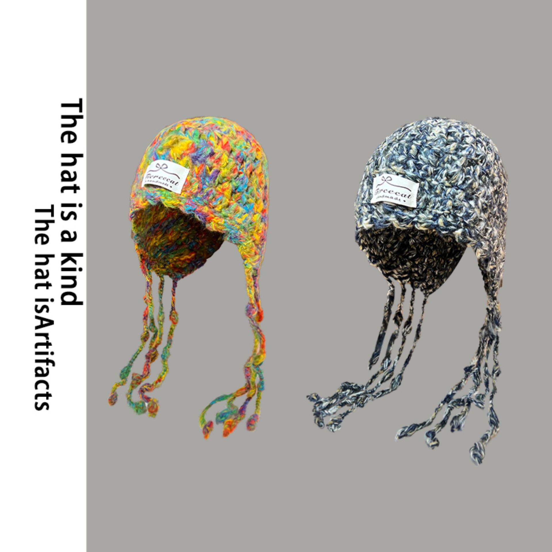 새로운 풀오버 울 모자 어린이 봄과 가을 봉제 니트 귀 보호 캡 혼합 컬러 술 브레이드 바오터 캡 트렌디스토어 가기