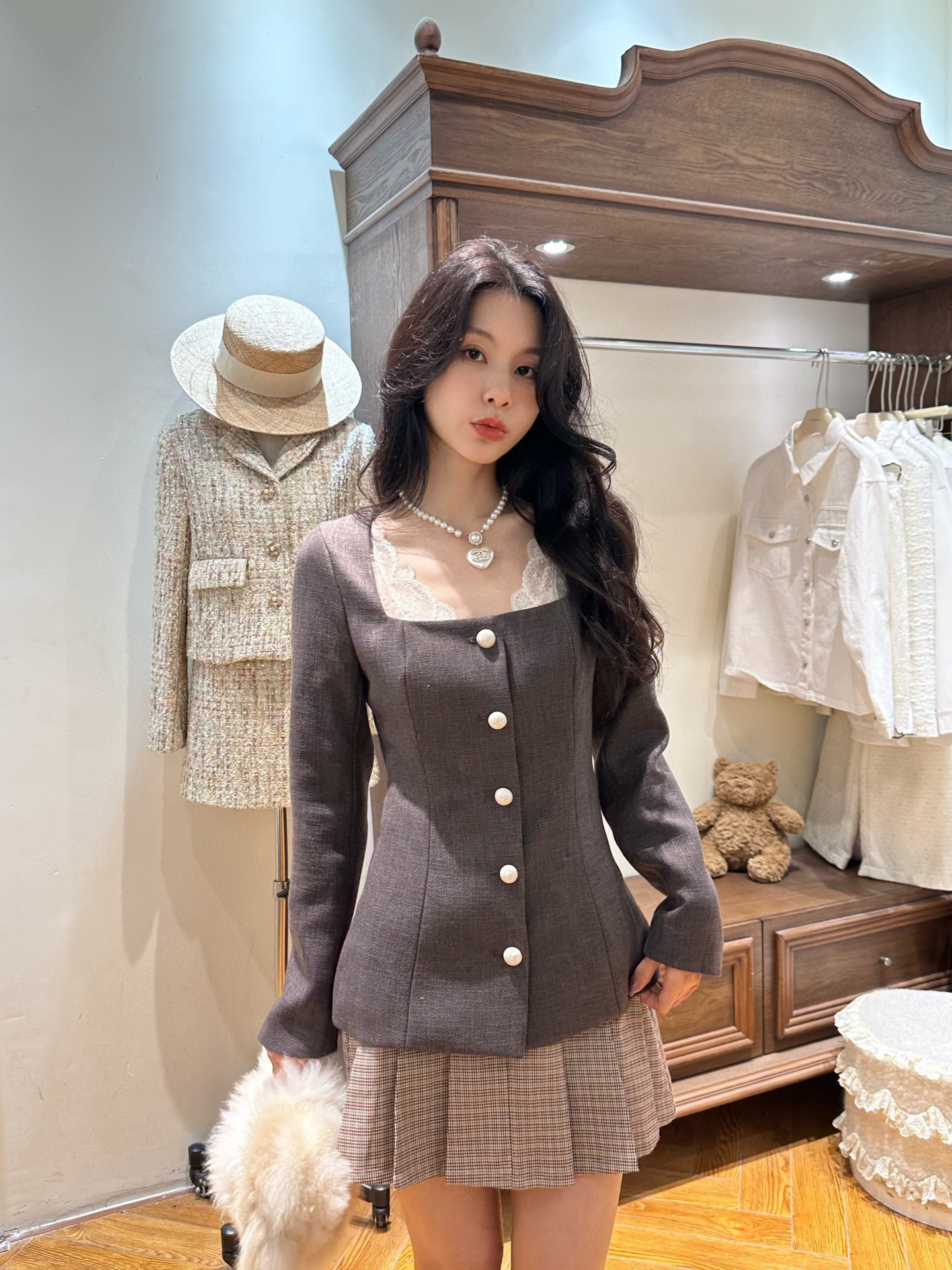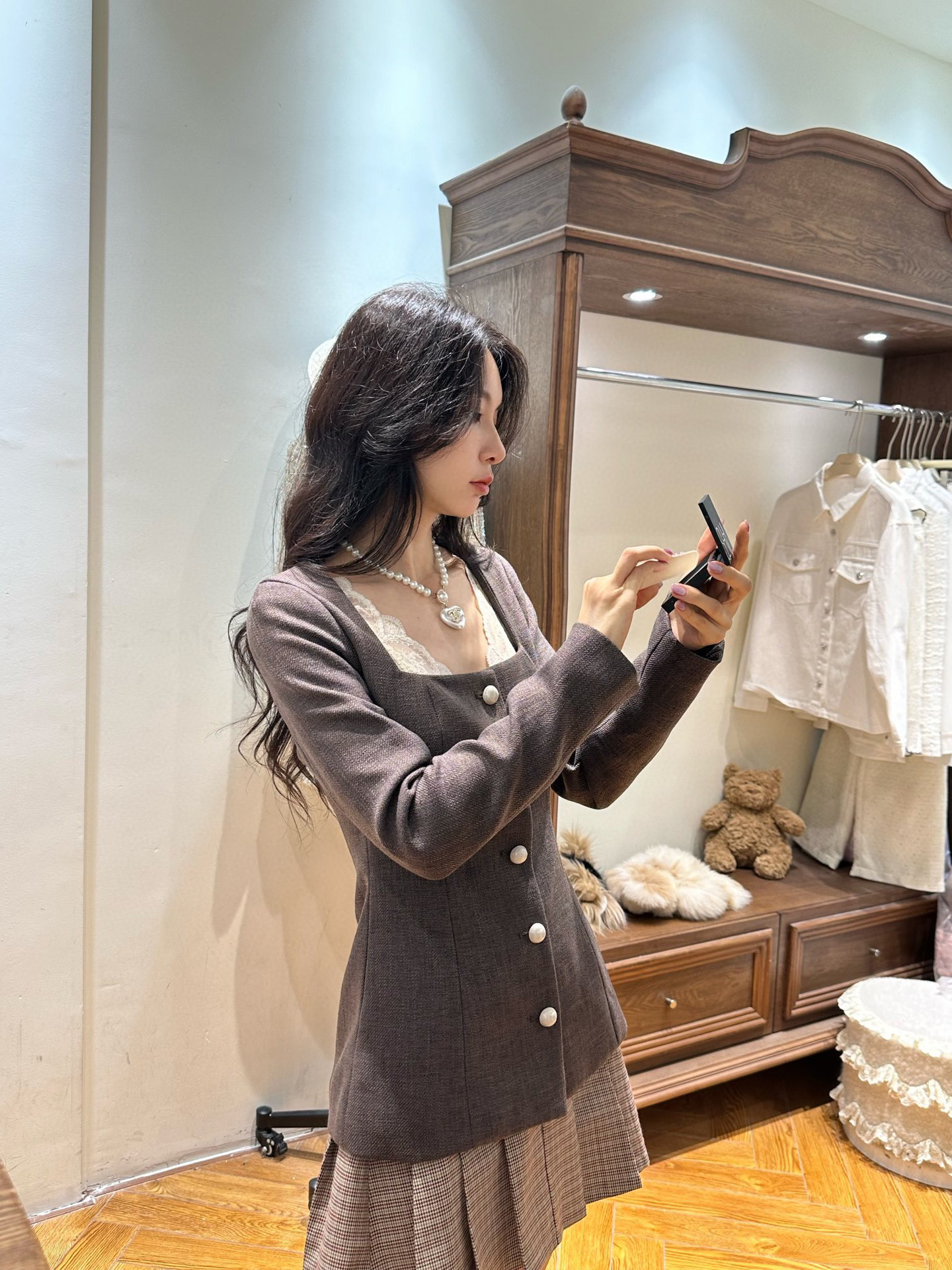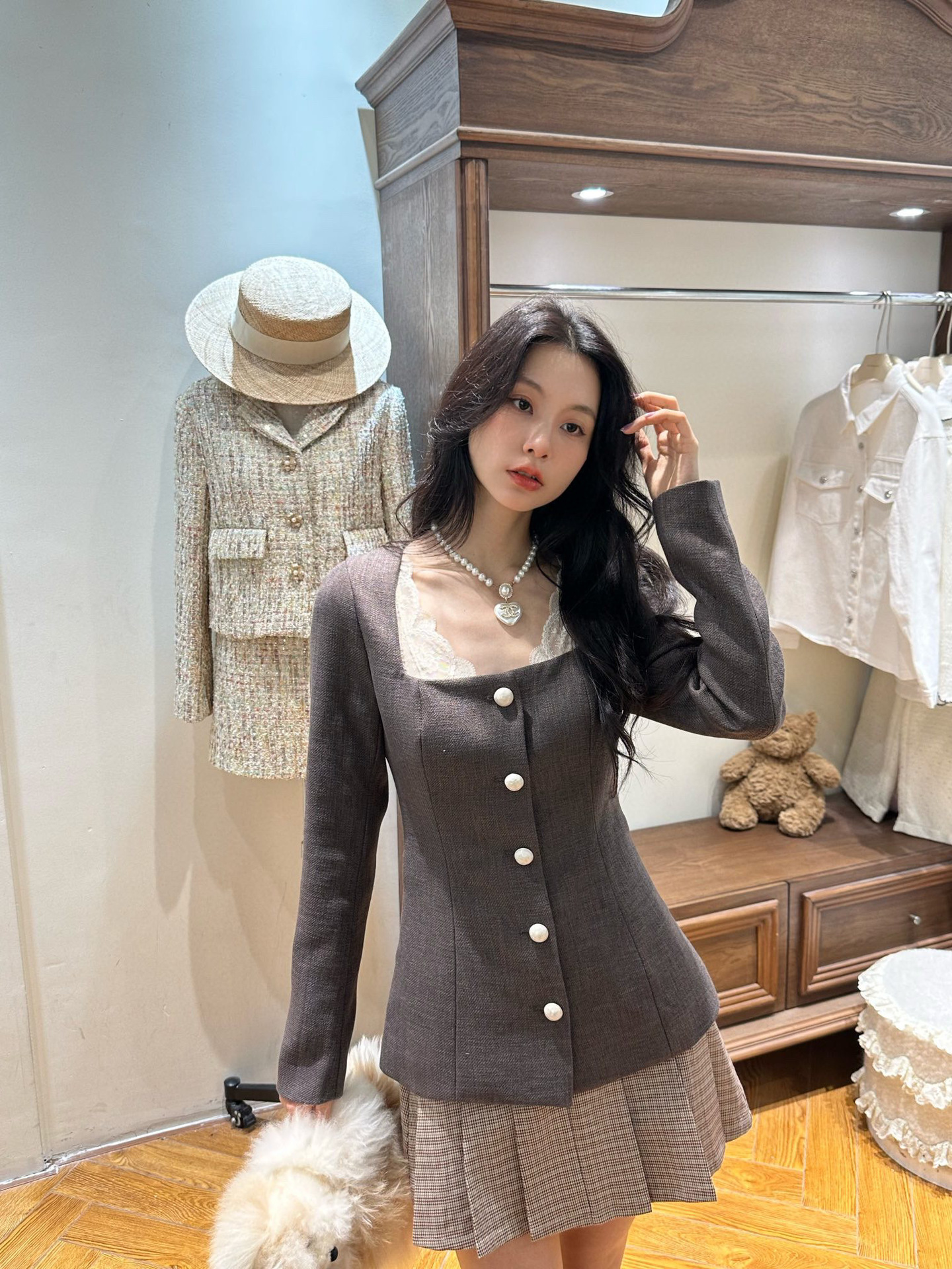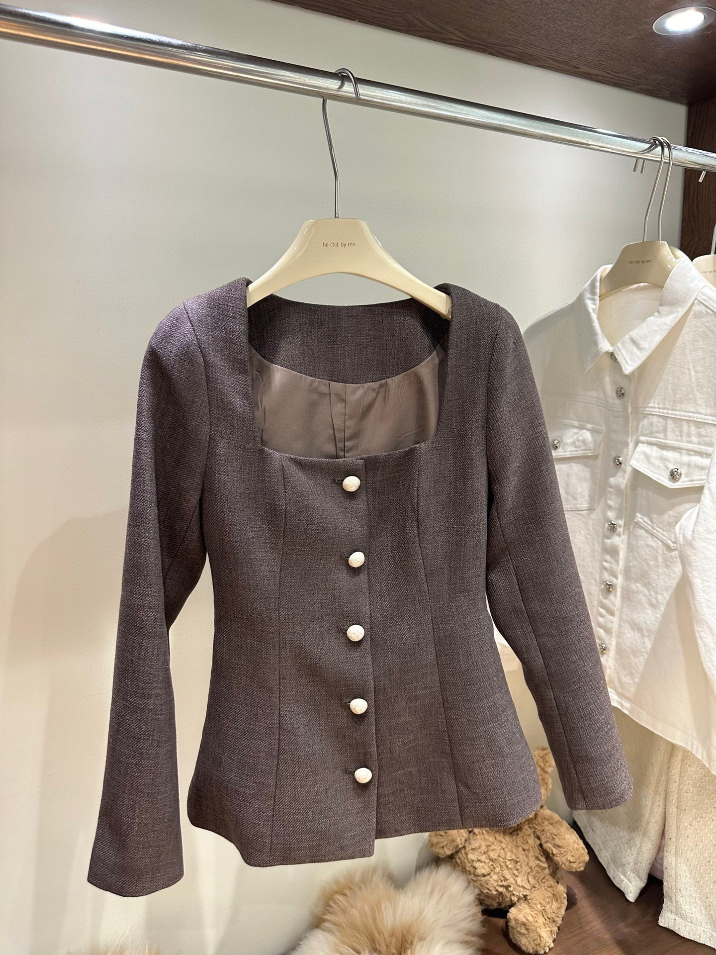 빈티지 아카데미 스타일 스퀘어 칼라 타이트 허리 슬림 핏 긴 소매 코트 여성용 샤넬 스타일 트위드 탑스토어 가기