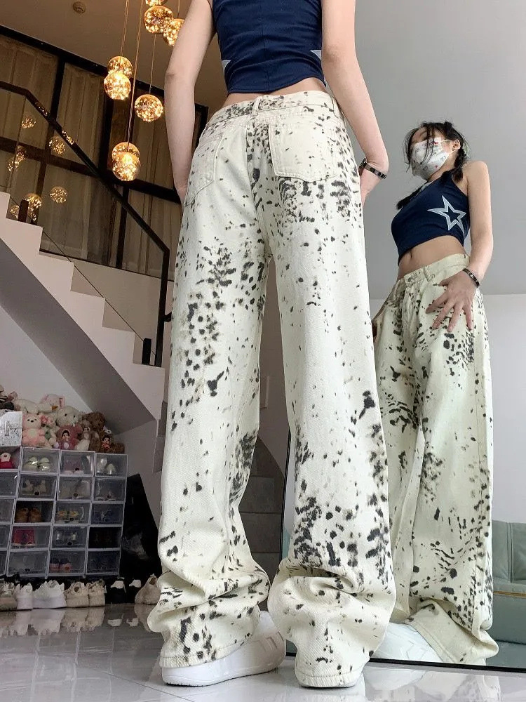 미국 복고풍 디자인 센스 화이트 레오파드 무늬 스트레이트 레그 청바지 여성의 2024 가을 새로운 높은 허리 느슨한 와이드 레그 바지