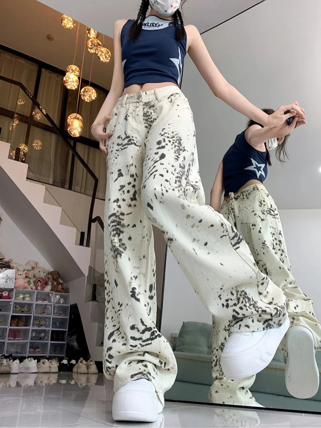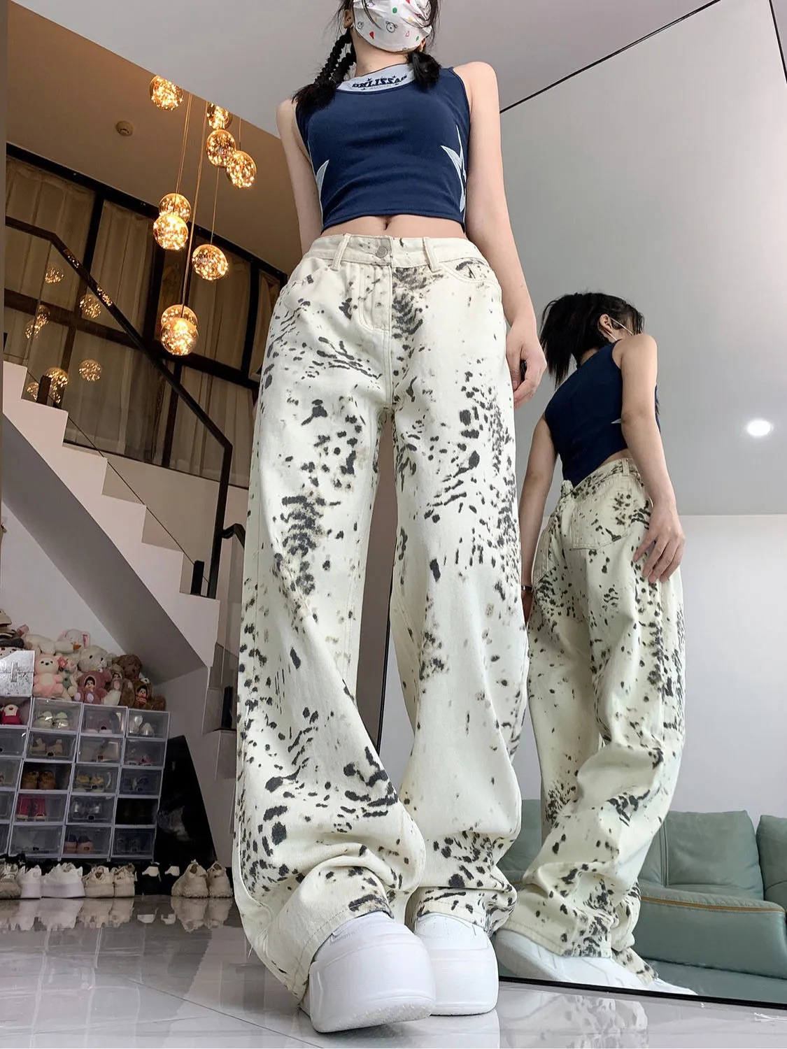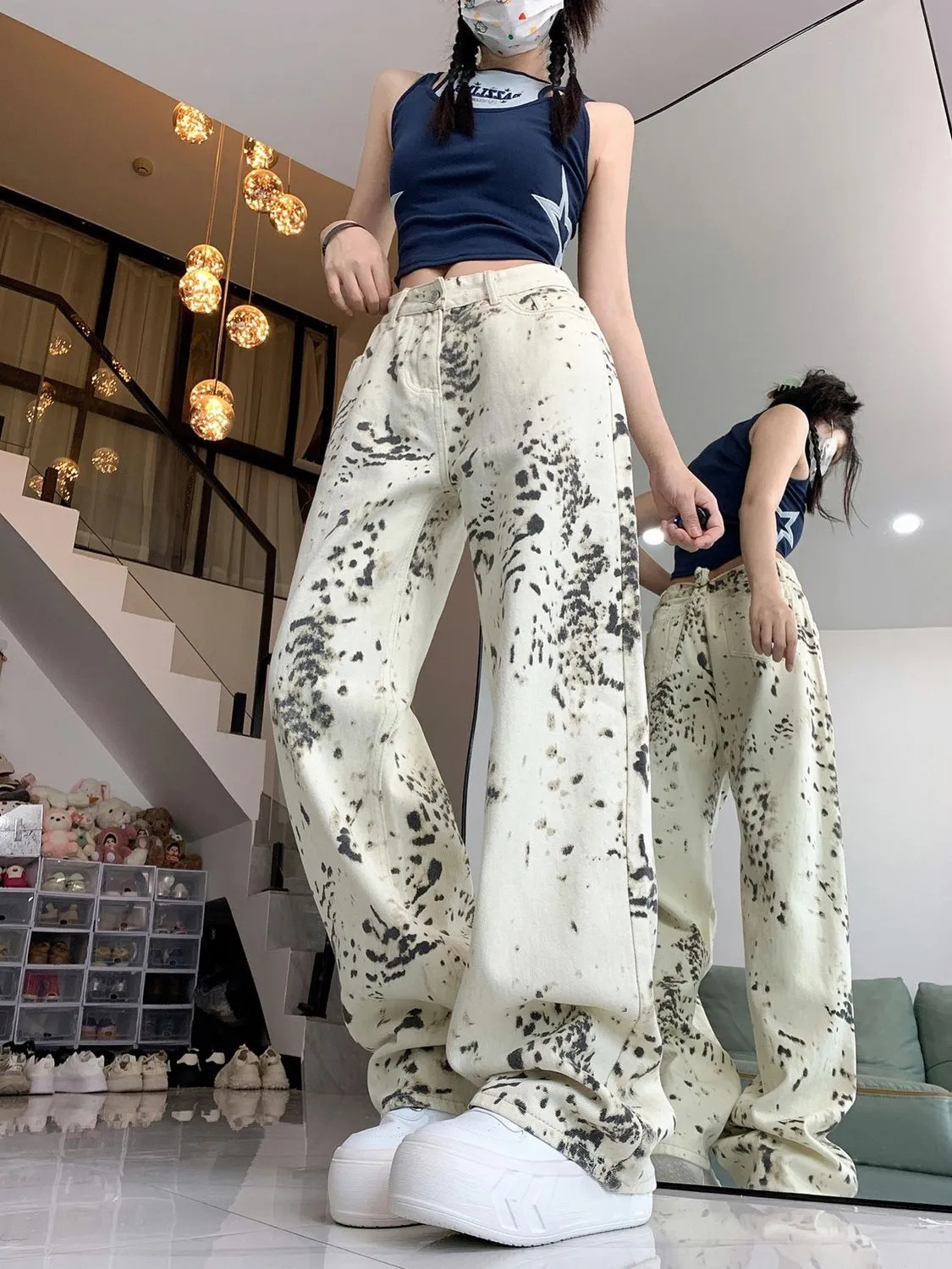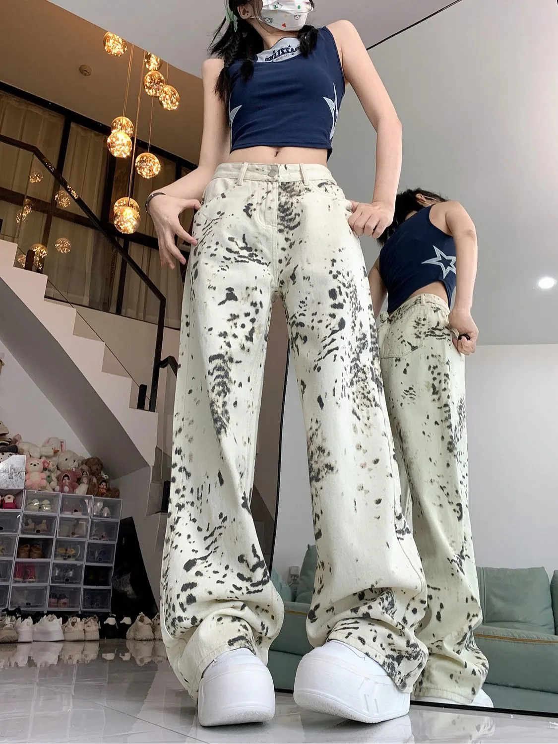 미국 복고풍 디자인 센스 화이트 레오파드 무늬 스트레이트 레그 청바지 여성의 2024 가을 새로운 높은 허리 느슨한 와이드 레그 바지스토어 가기