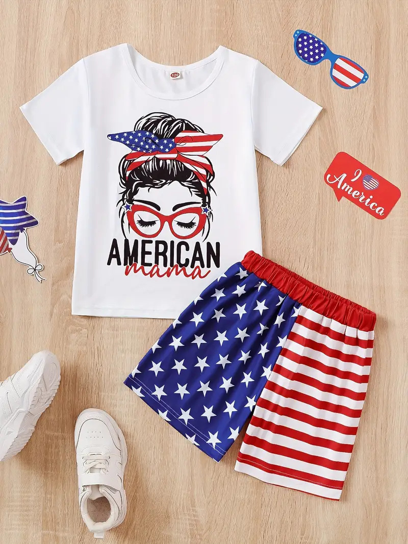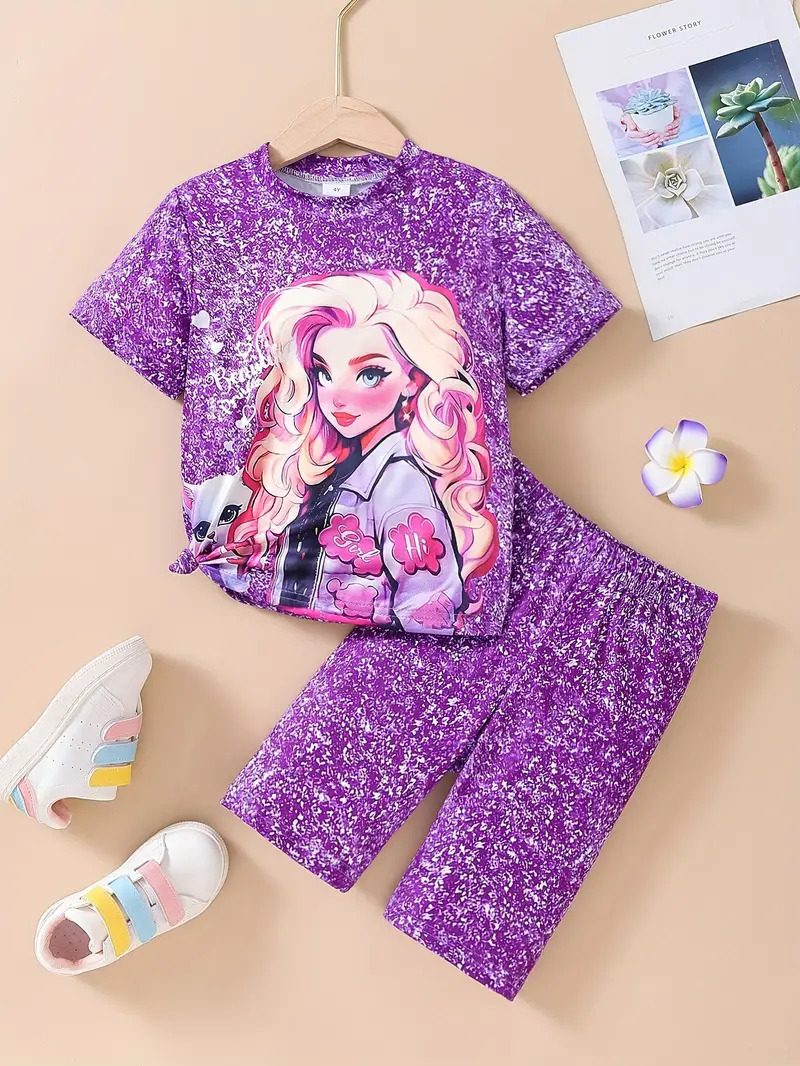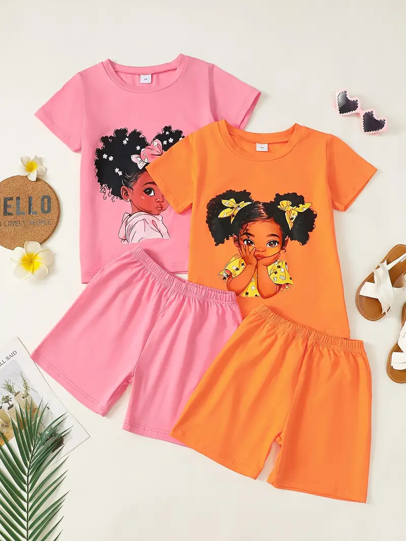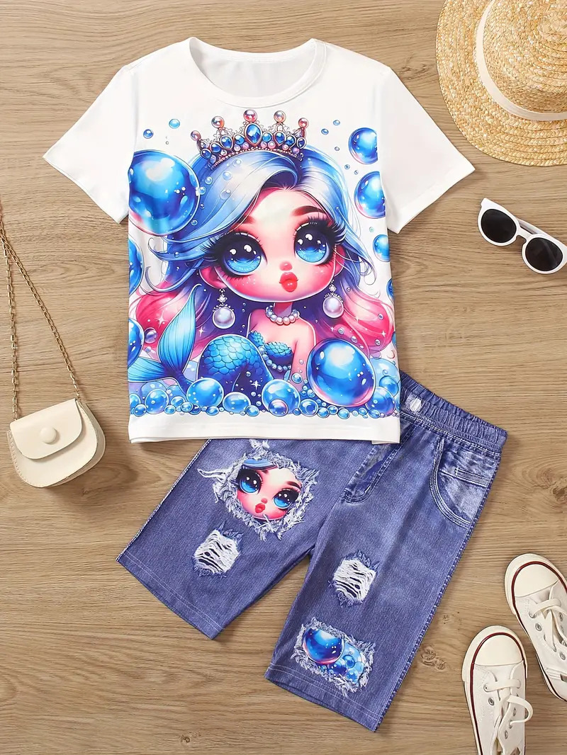 어린이 여름 세트 소녀 반팔 인쇄 티셔츠 가짜 데님 느슨한 캐주얼 편안한 투피스 세트 RA1 RD1스토어 가기