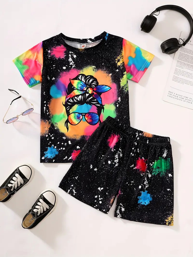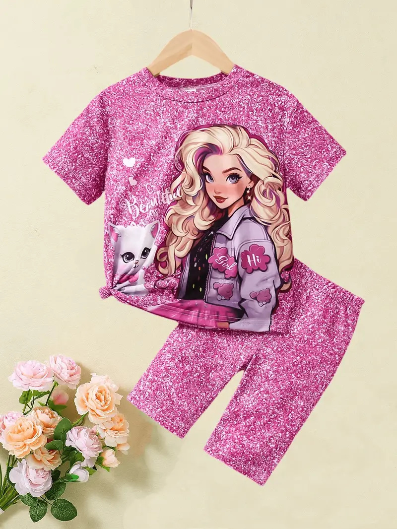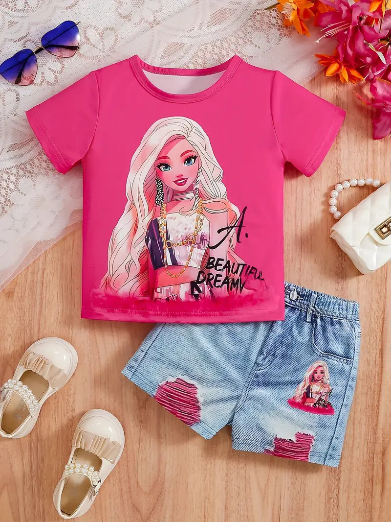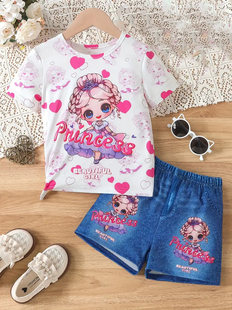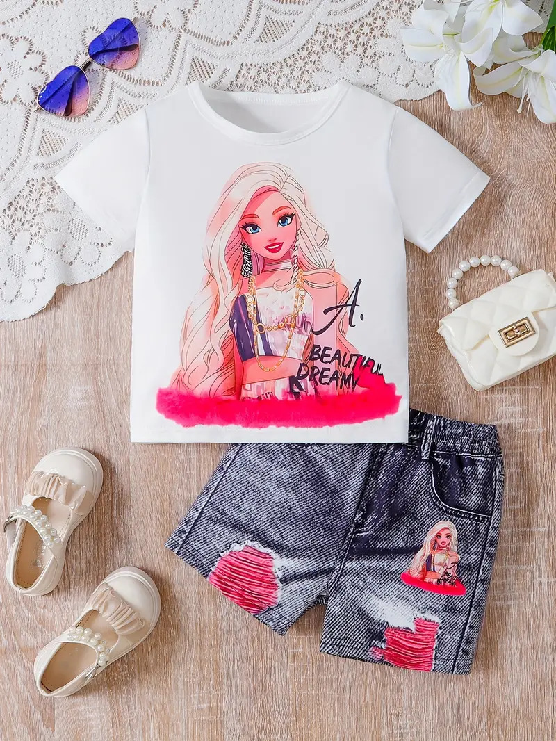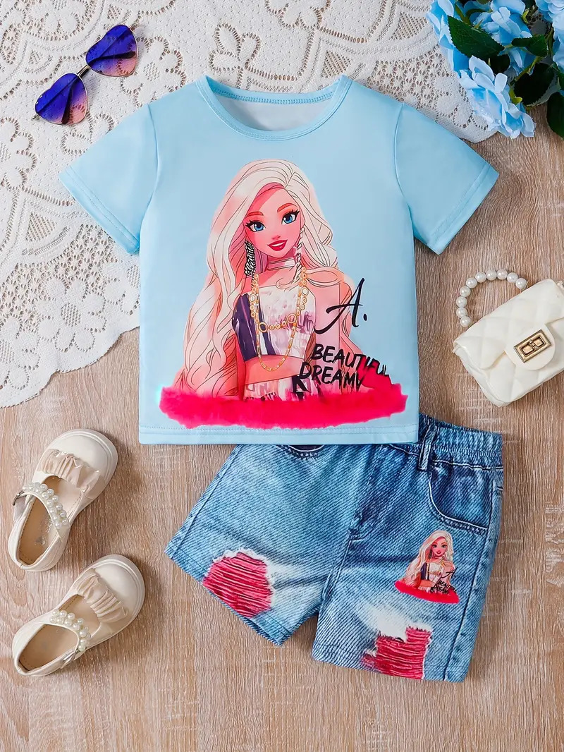 어린이 여름 세트 소녀 반팔 인쇄 티셔츠 가짜 데님 느슨한 캐주얼 편안한 투피스 세트 RA1 RD1