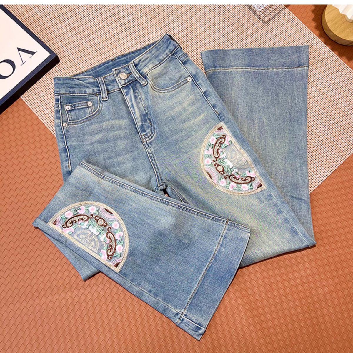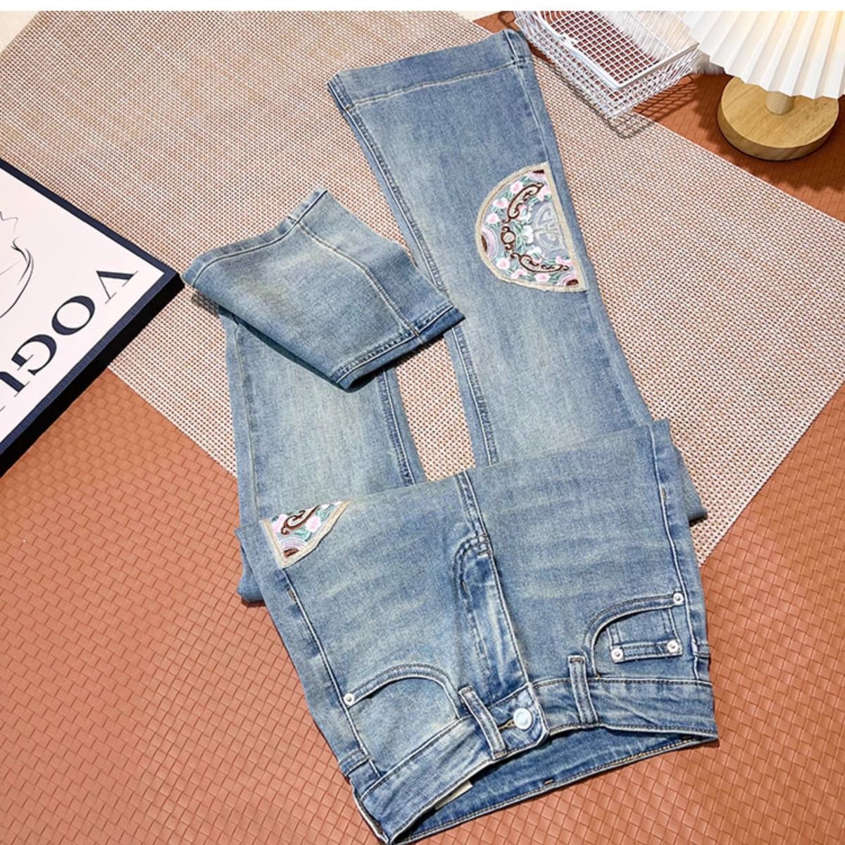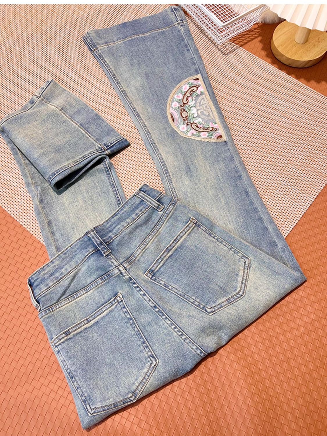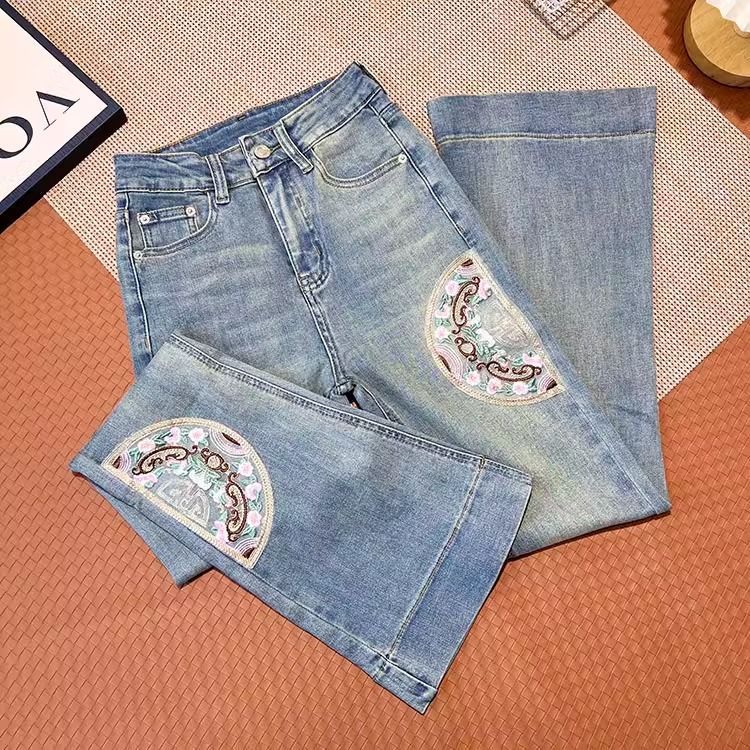 Guofeng 자수 약한 청바지 여성의 2024 년 봄과 가을 새로운 높은 허리 슬림-적합 탄성 슬리밍 트럼펫 긴 바지스토어 가기