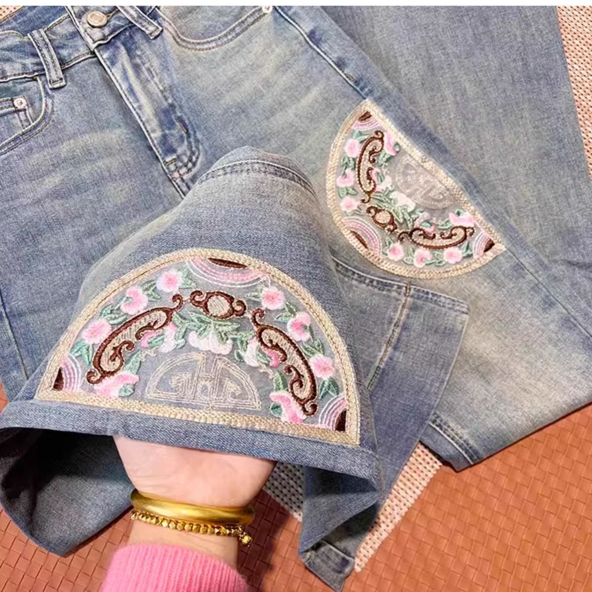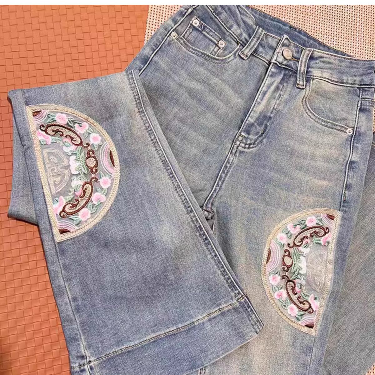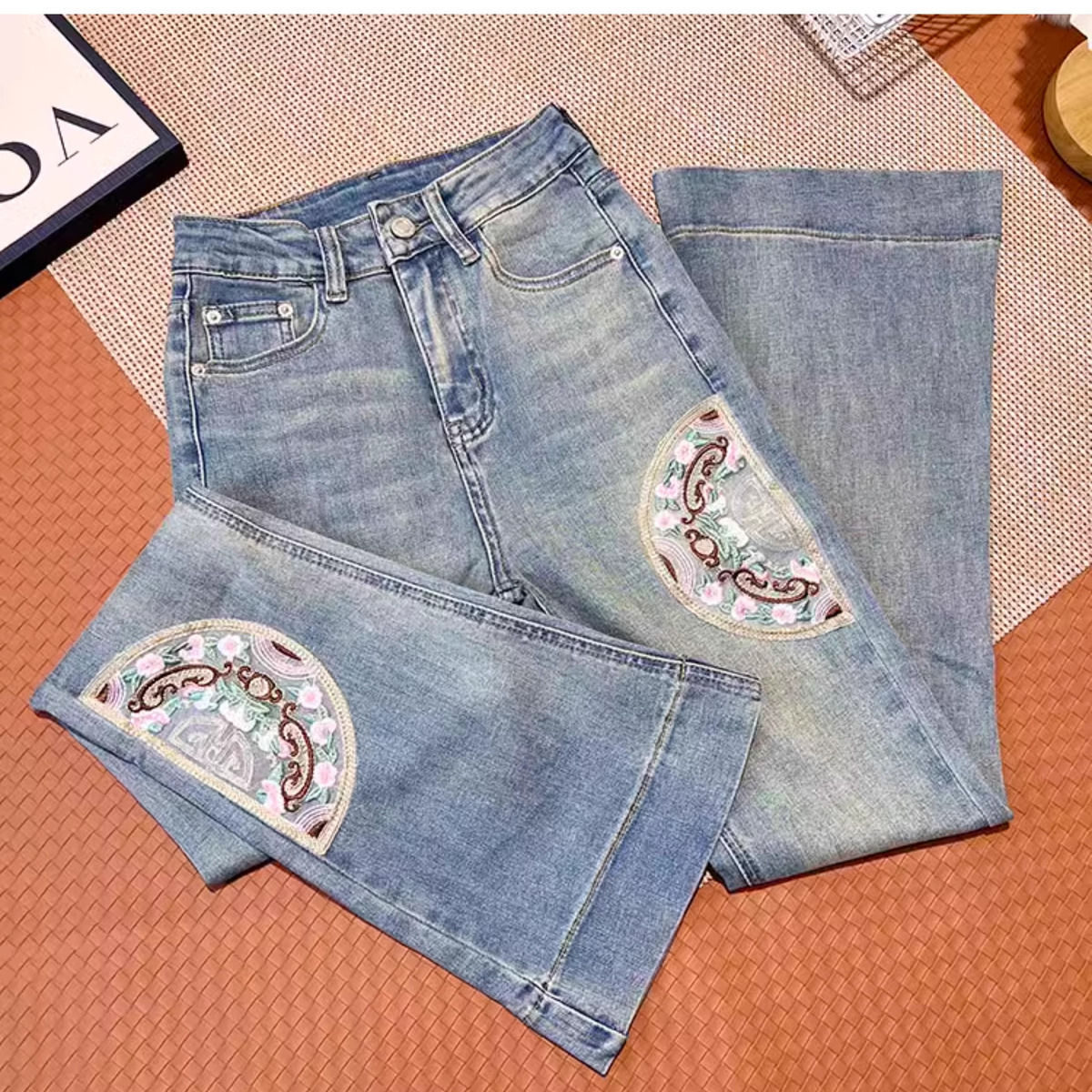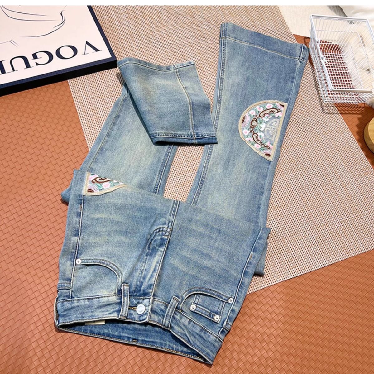 Guofeng 자수 약한 청바지 여성의 2024 년 봄과 가을 새로운 높은 허리 슬림-적합 탄성 슬리밍 트럼펫 긴 바지스토어 가기