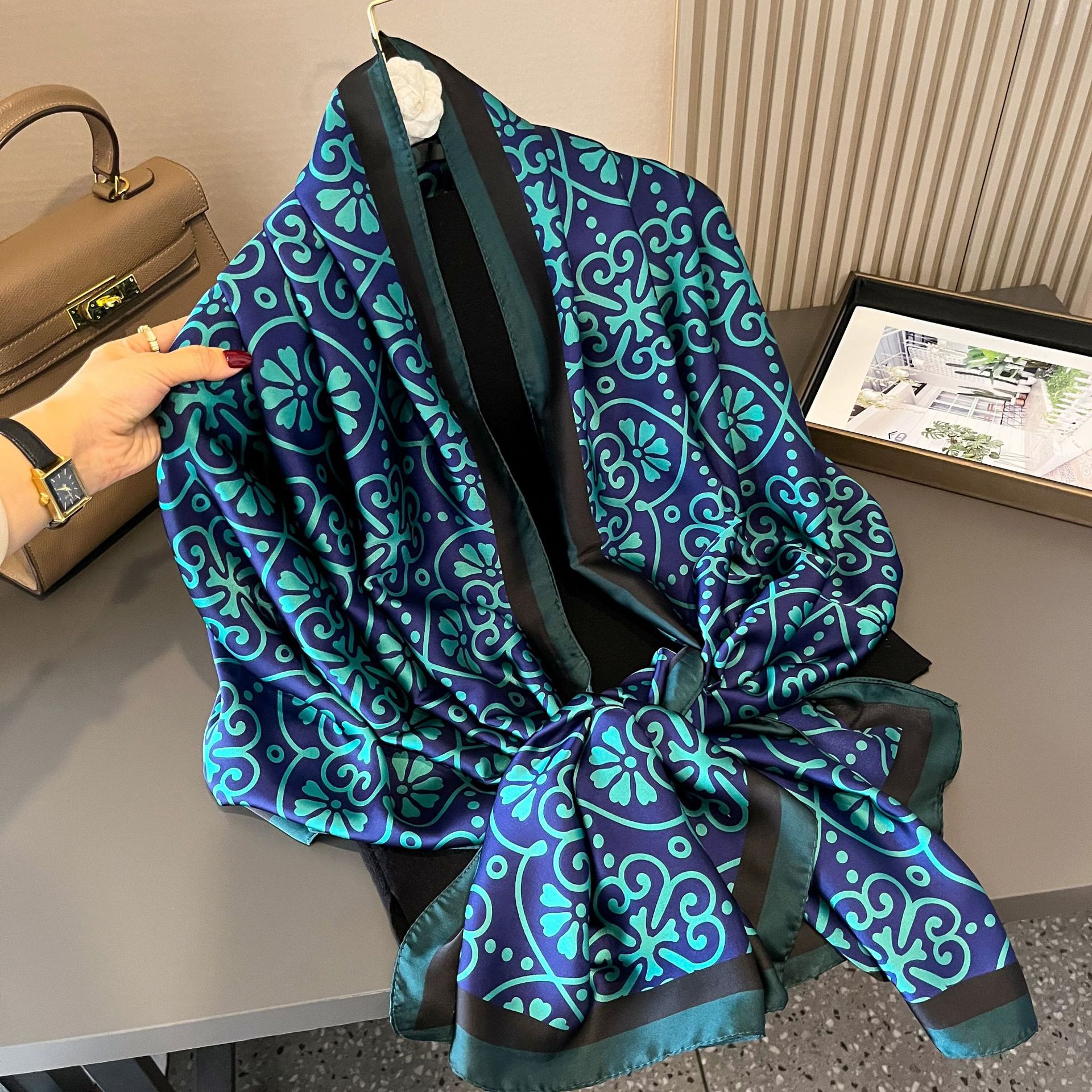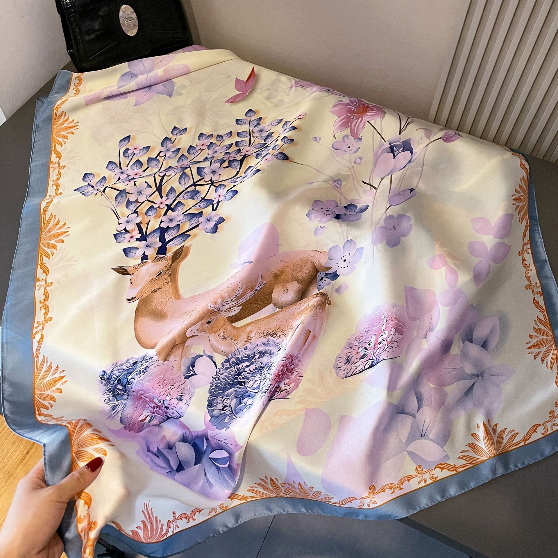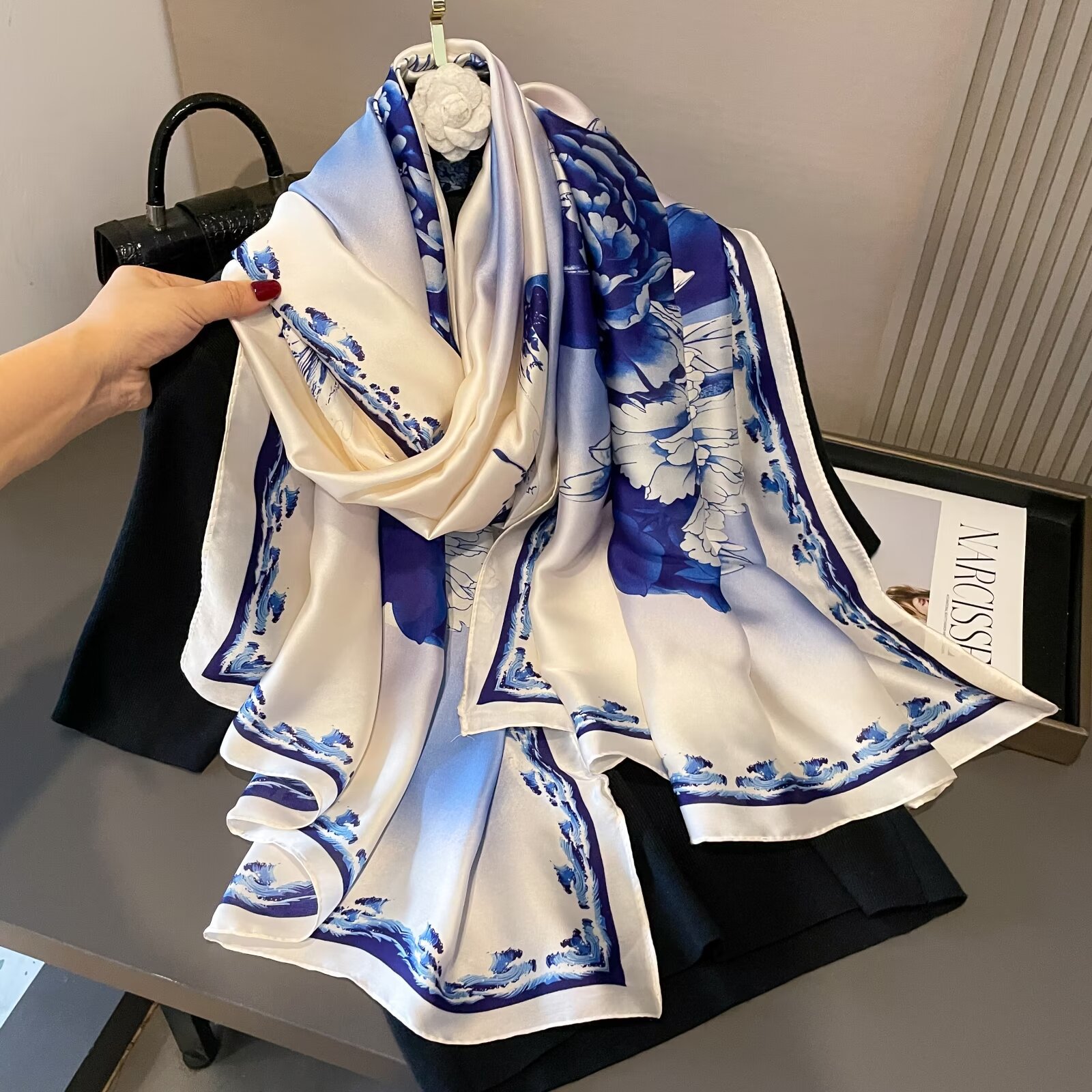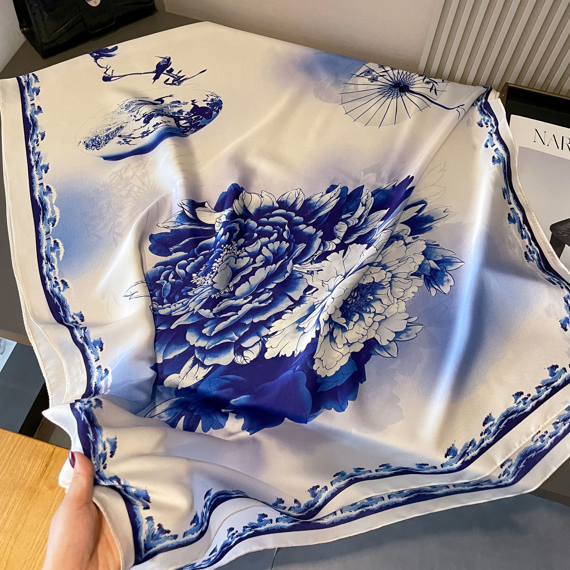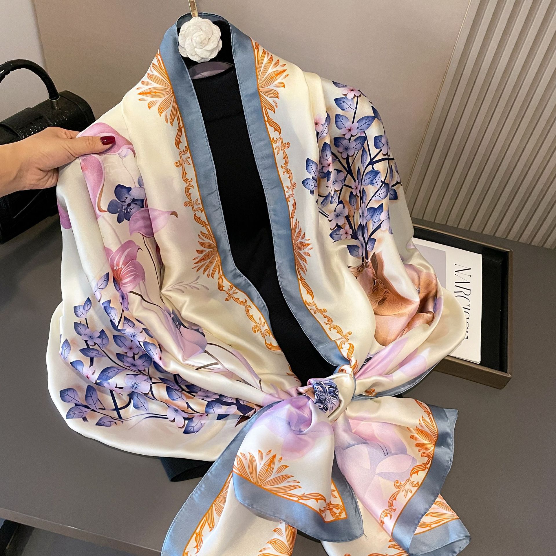 한국 스타일 봄, 여름, 가을 식물과 꽃 리 브로케이드 새틴 스카프 일반 우아한 예술적 우아한 여성 장식 외부 목도리 스카프