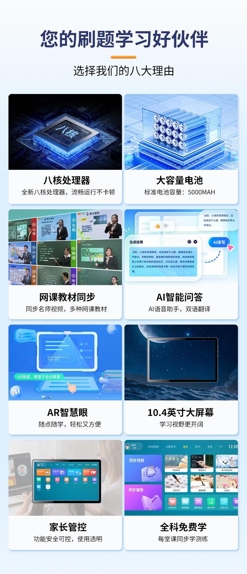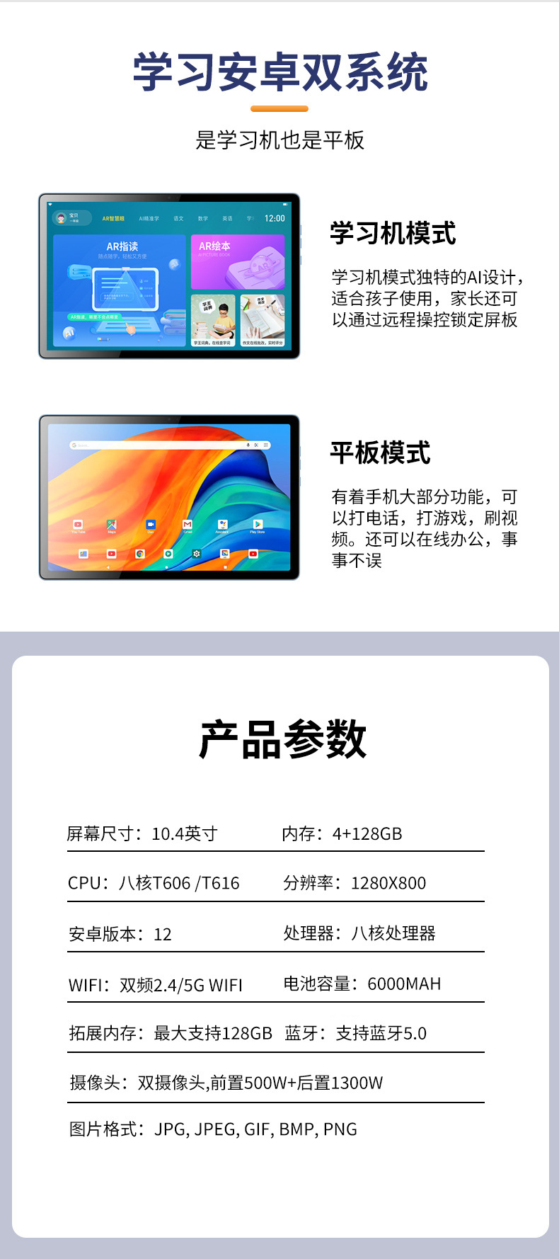 10.4inch 스마트 태블릿 HD 대형 스크린 4G 듀얼 SIM 128GB 2-in-1 학습 게임 태블릿스토어 가기