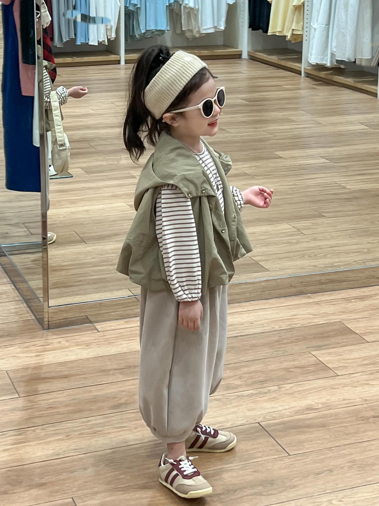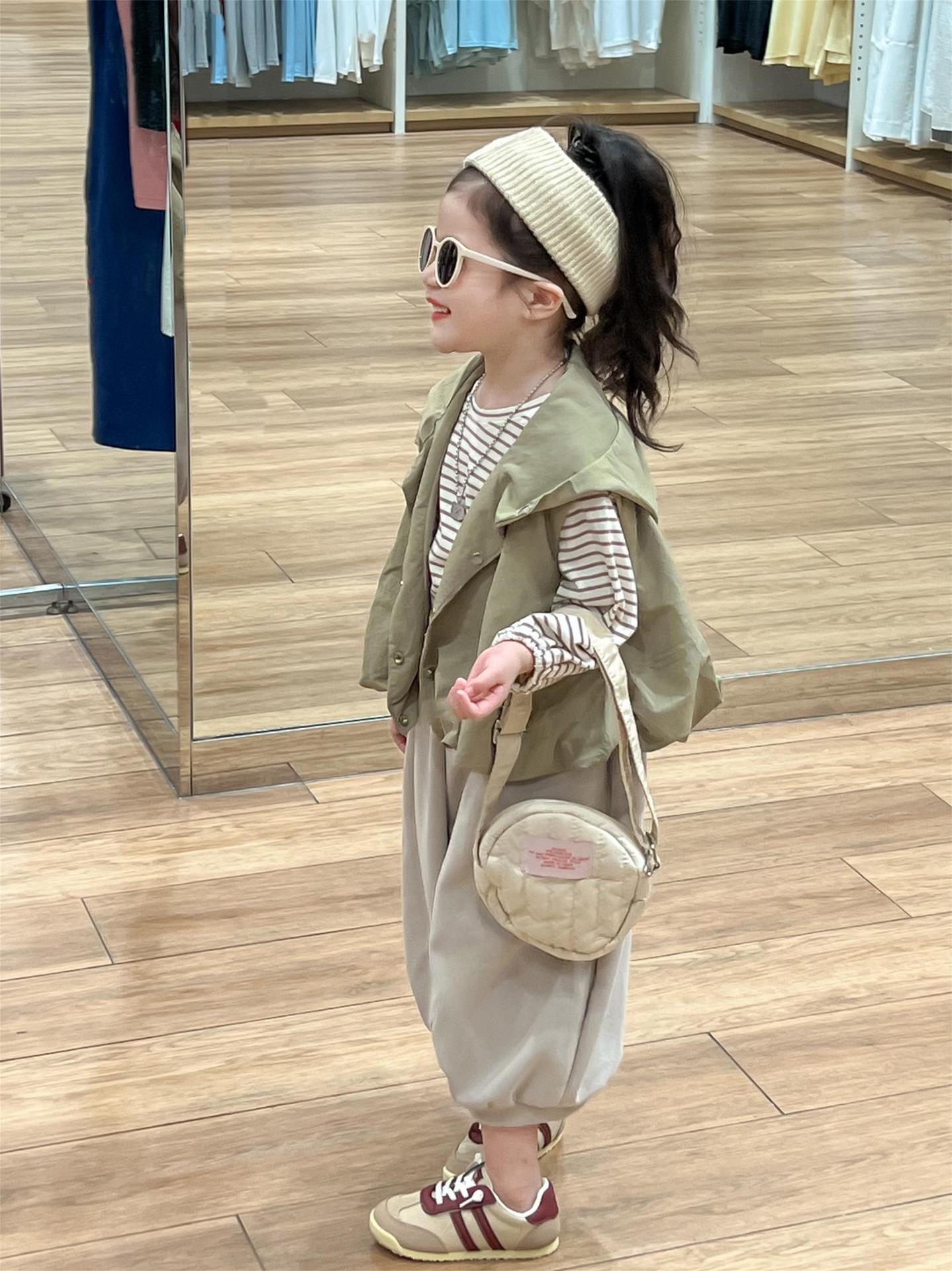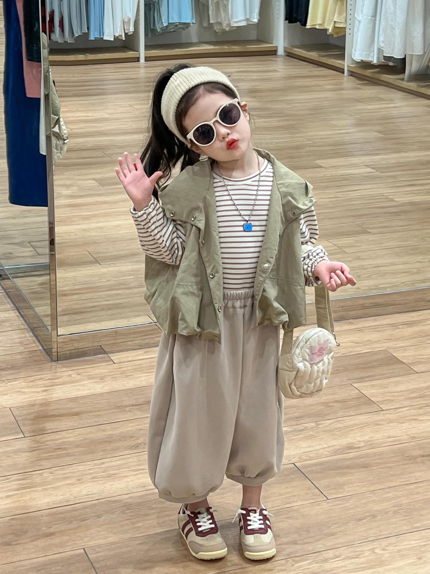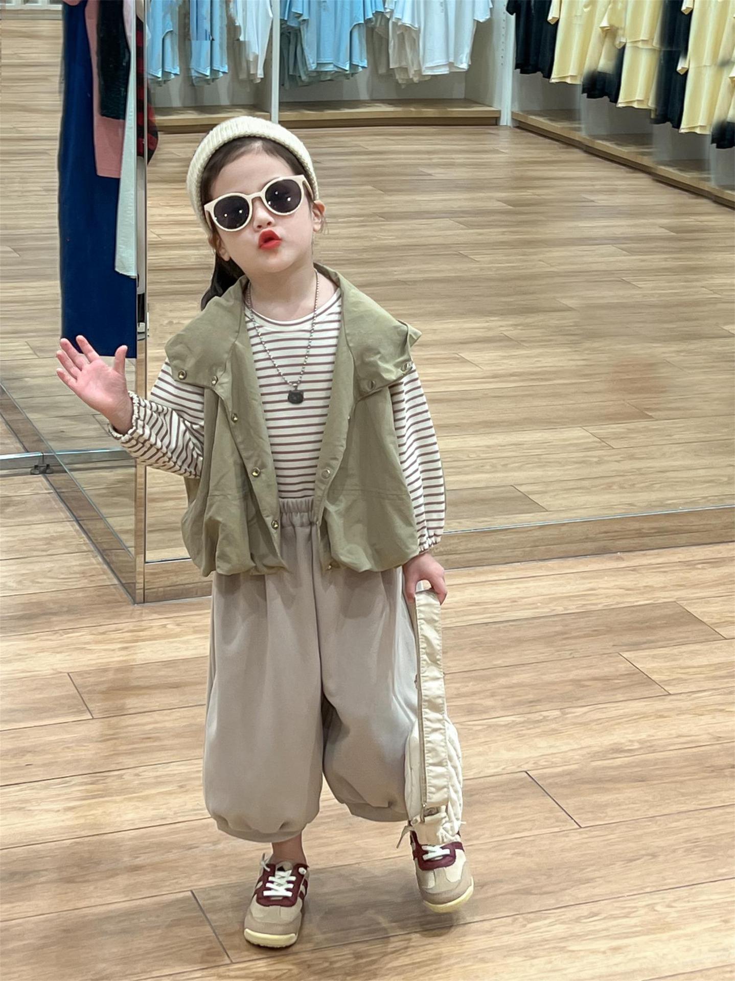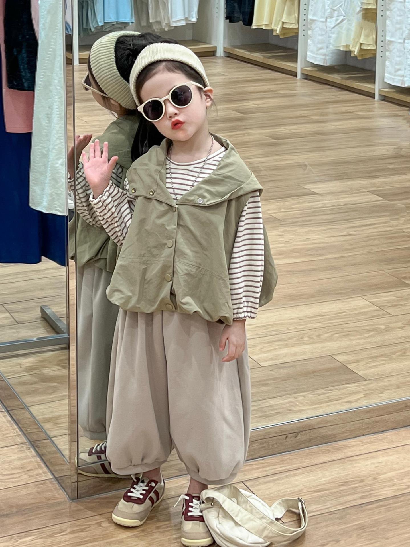 별도의 사진 촬영을위한 넓은 다리 블루머가있는 소녀 가을 간단한 느슨한 도구 스타일 후드 조끼 줄무늬 티셔츠스토어 가기