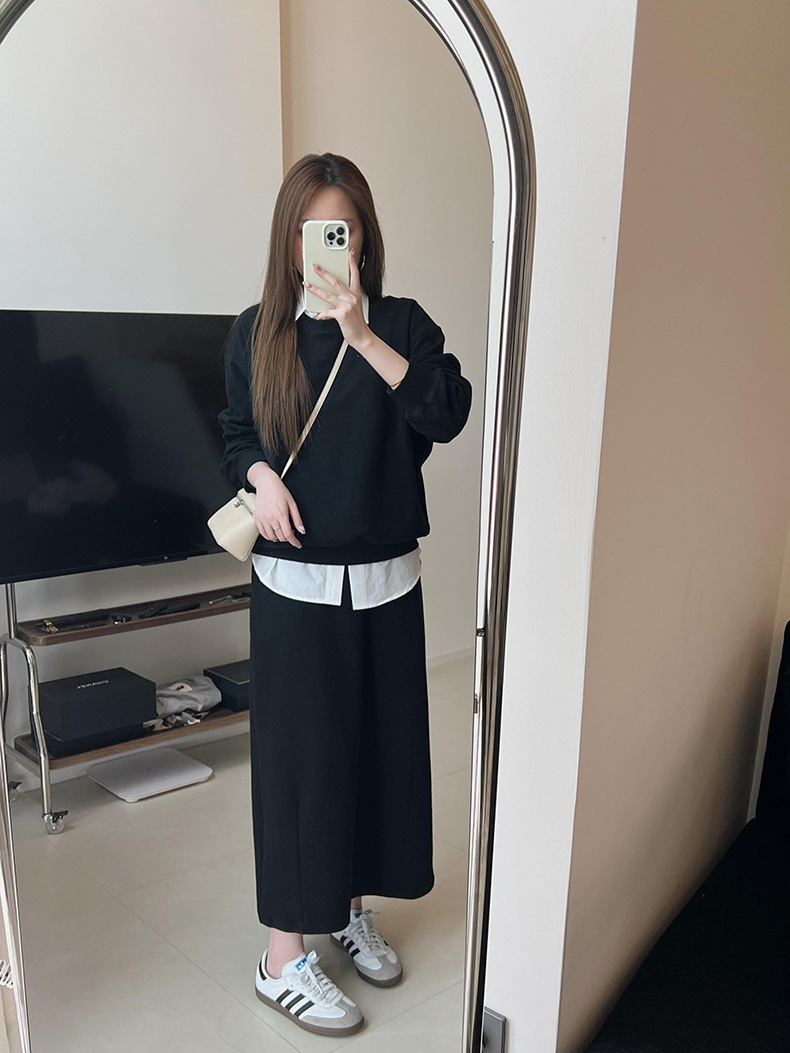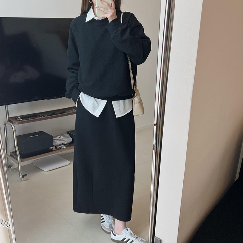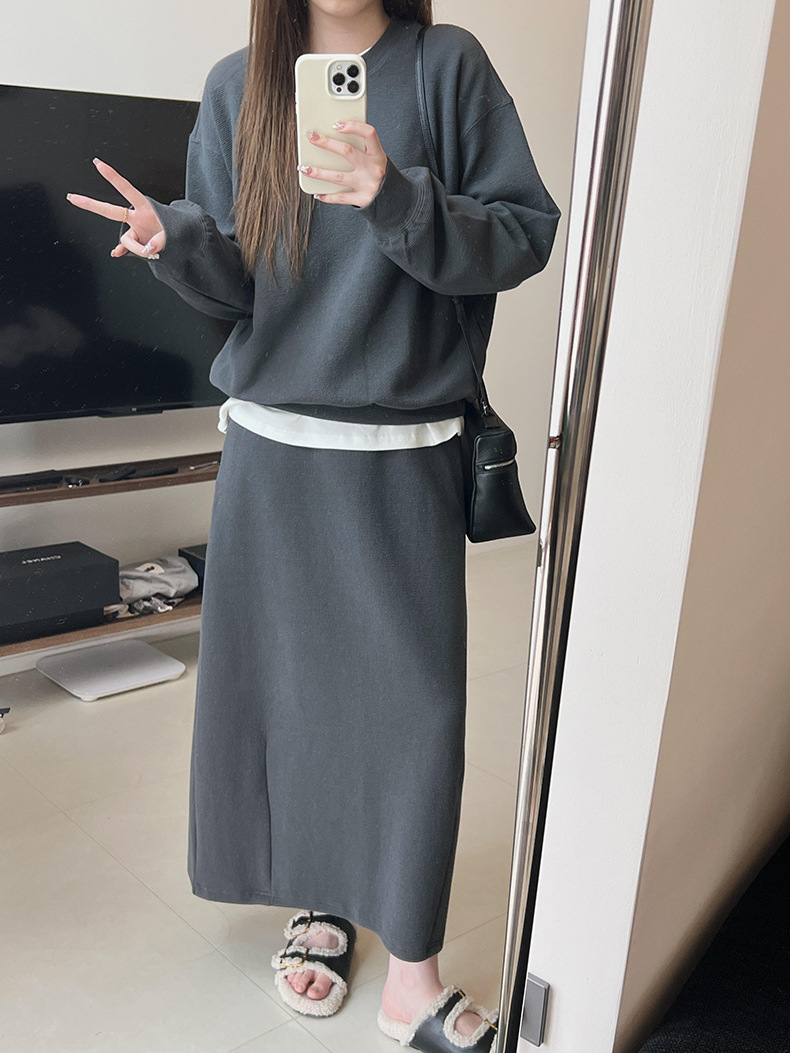 기본 편안한 곡물 코튼 라운드 넥 스웨트 셔츠 여성의 가을과 겨울 새로운 느슨한 캐주얼 스포츠 스웨트 셔츠 원피스 세트