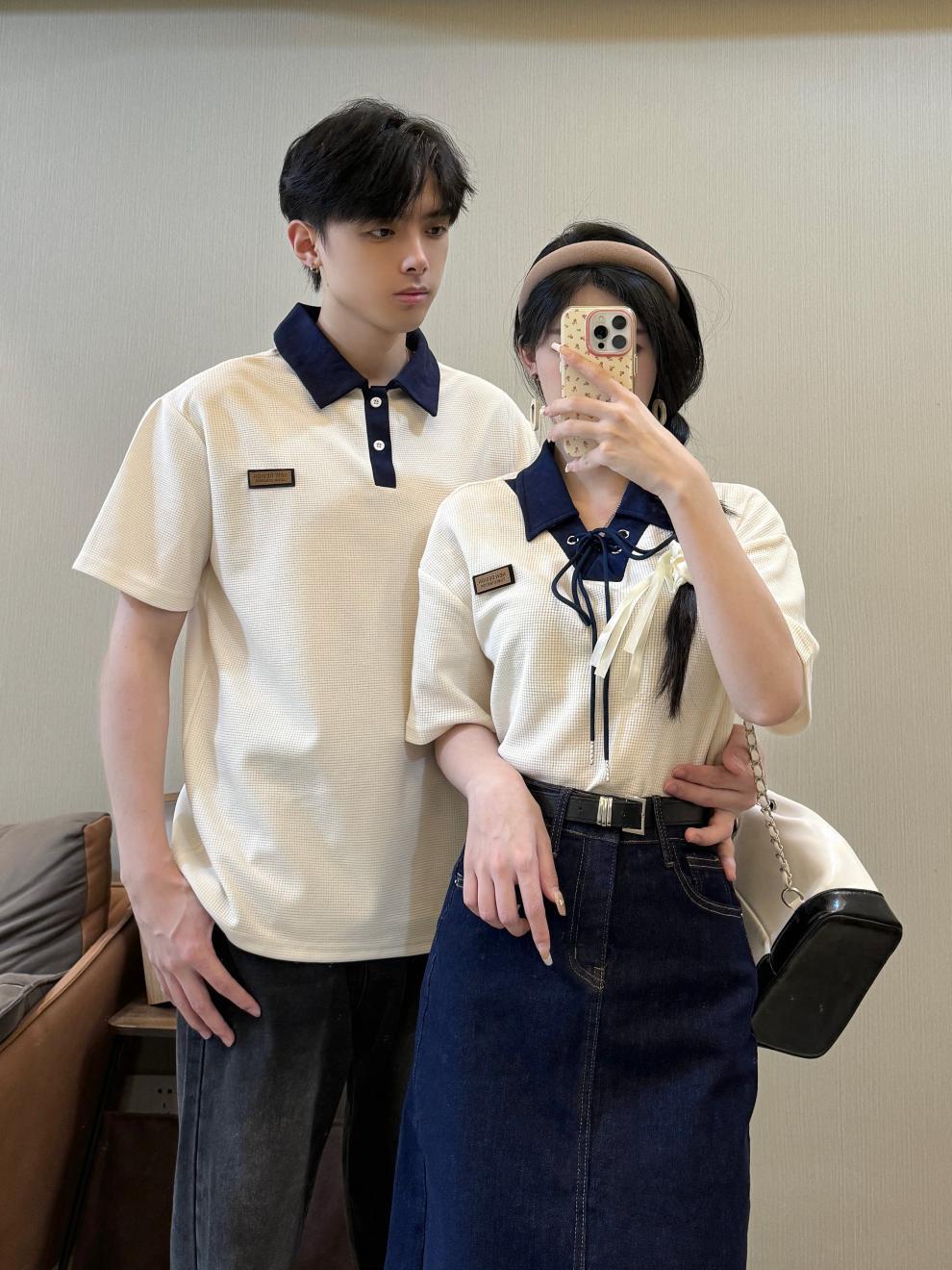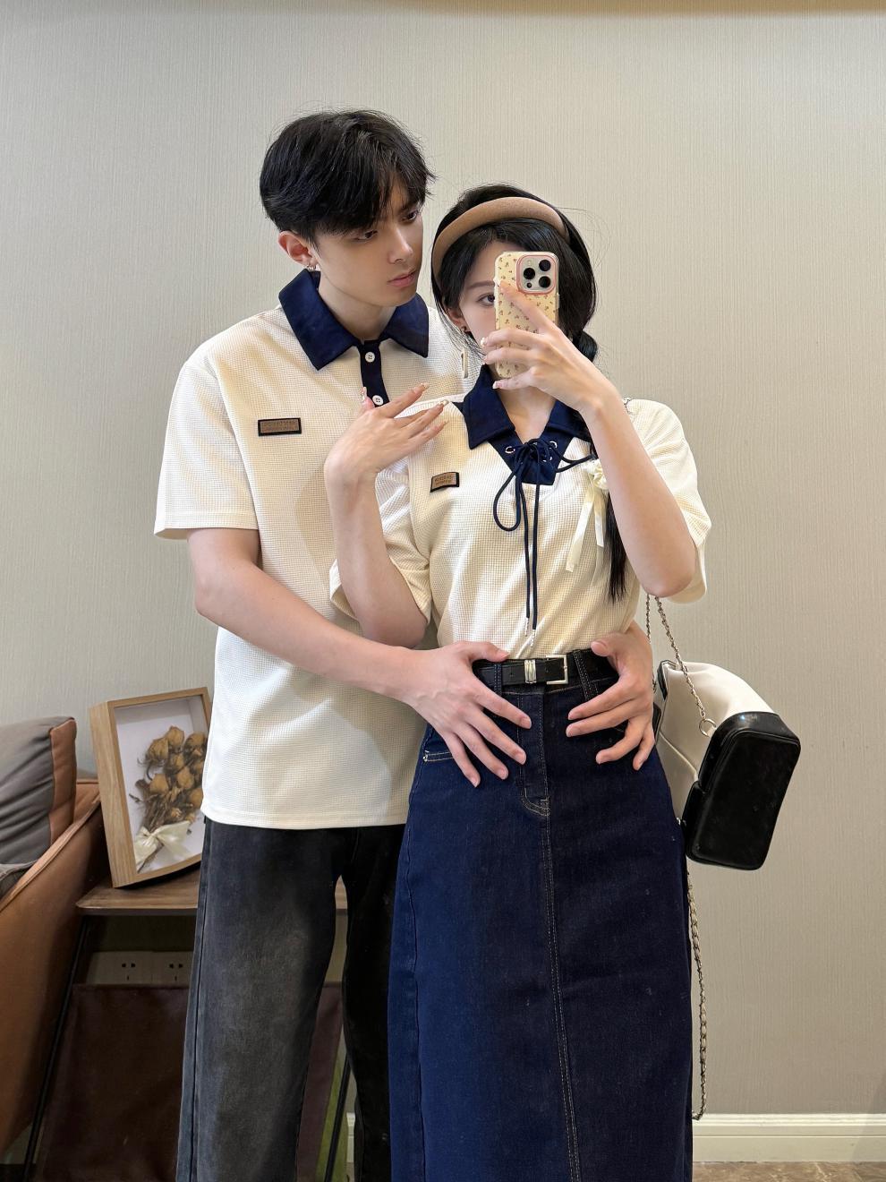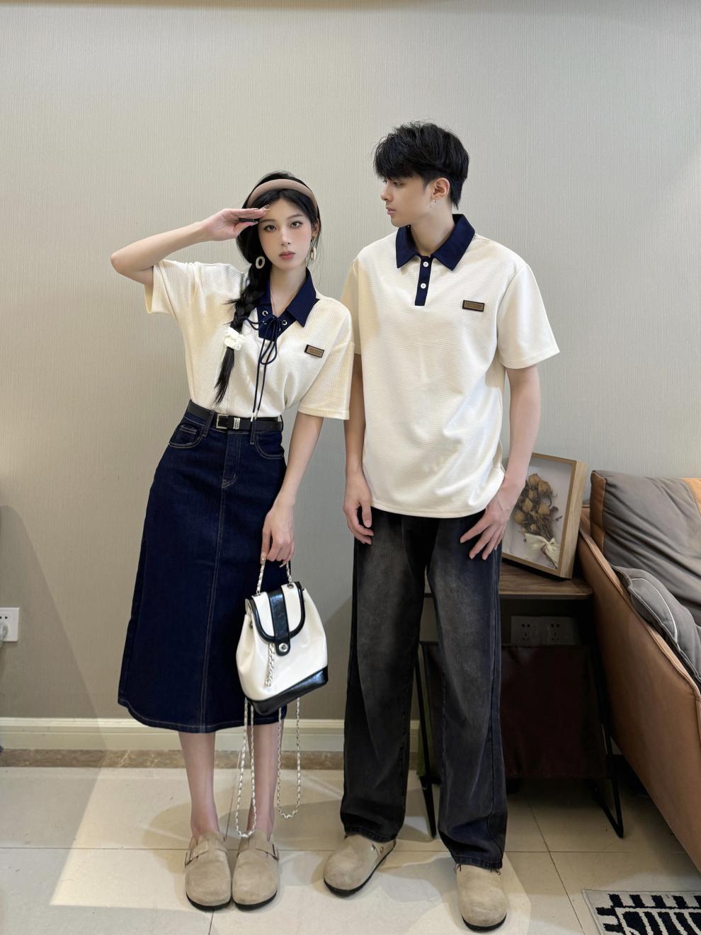 리얼 샷 커플 원피스 짧은 소매 대학 스타일 남성과 여성 커플 원피스 셔츠 데님 스커트 여름