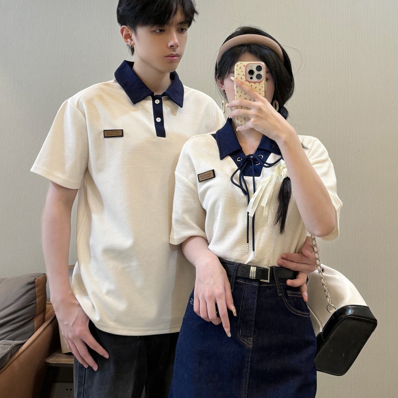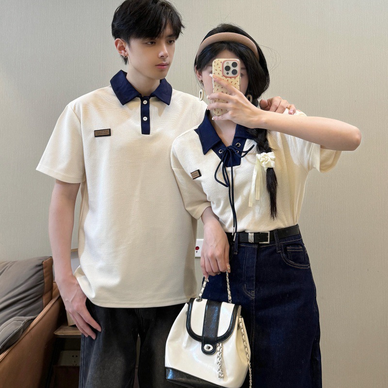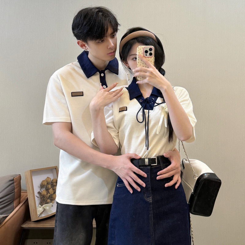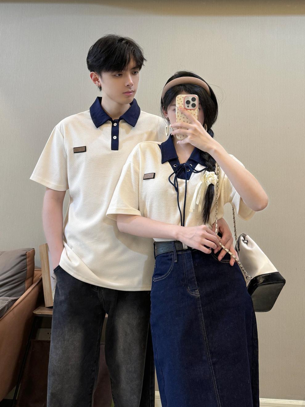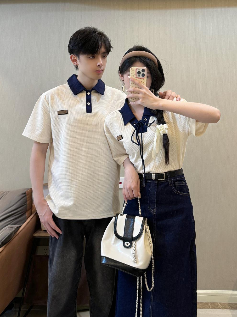 리얼 샷 커플 원피스 짧은 소매 대학 스타일 남성과 여성 커플 원피스 셔츠 데님 스커트 여름