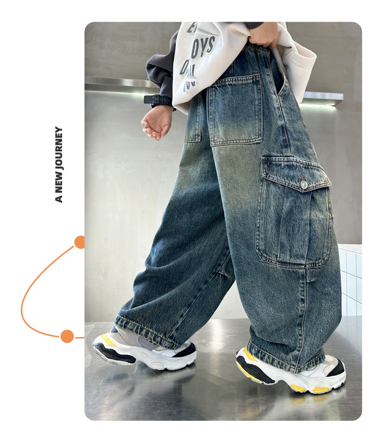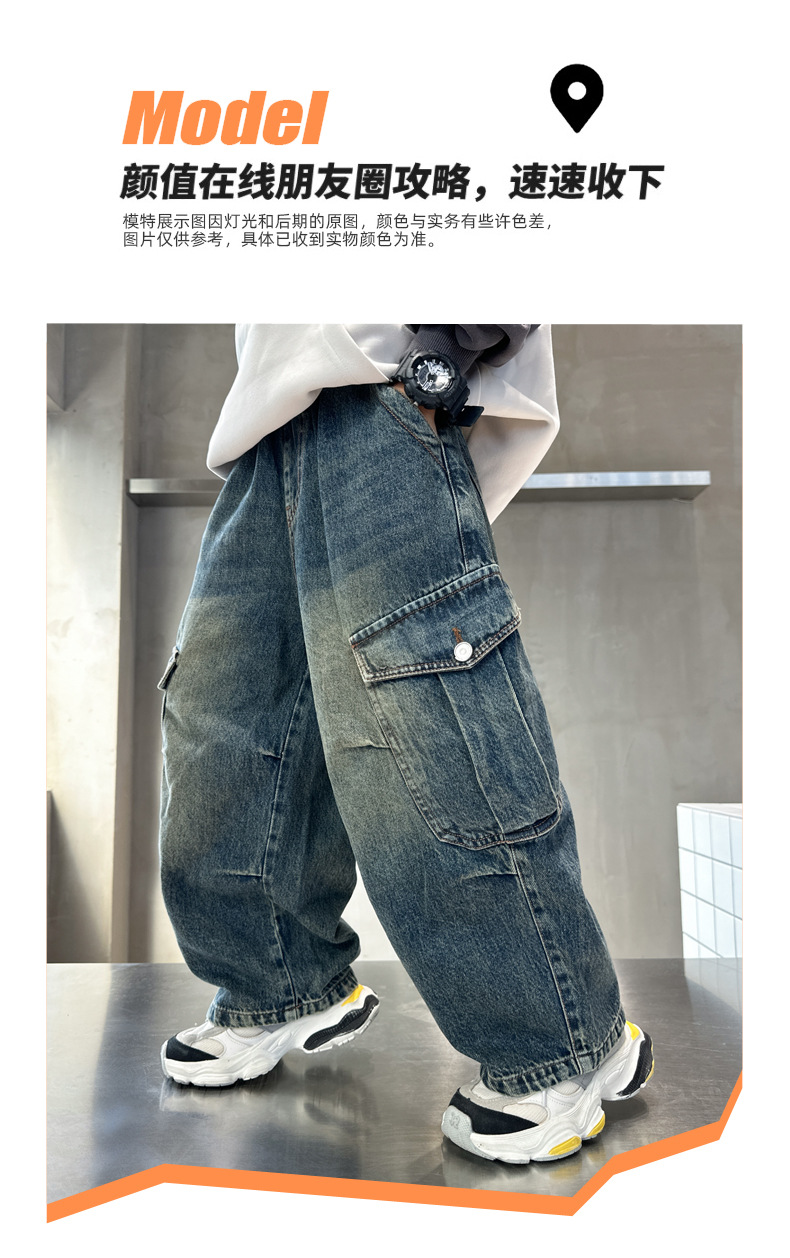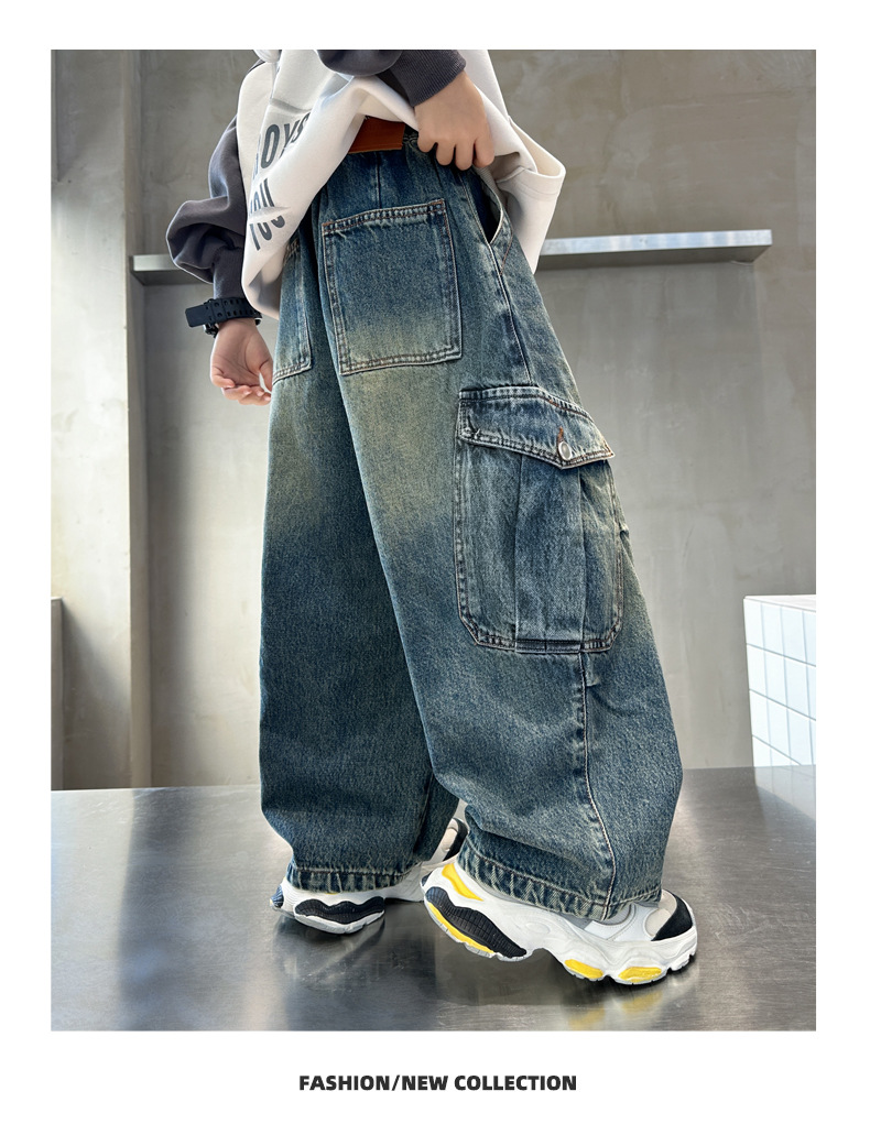 아동복 소년 가을 바지 2025 새로운 스타일 중대형 아동 봄, 가을 작업복 청바지 느슨한 넓은 다리 바지스토어 가기