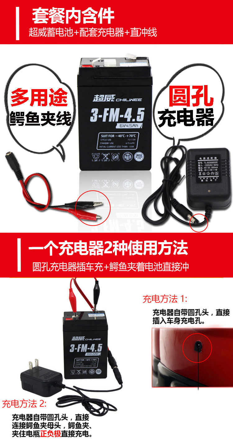 • Chaowei 6V10AH에는 충전기 + 직접 케이블이 함께 제공됩니다.