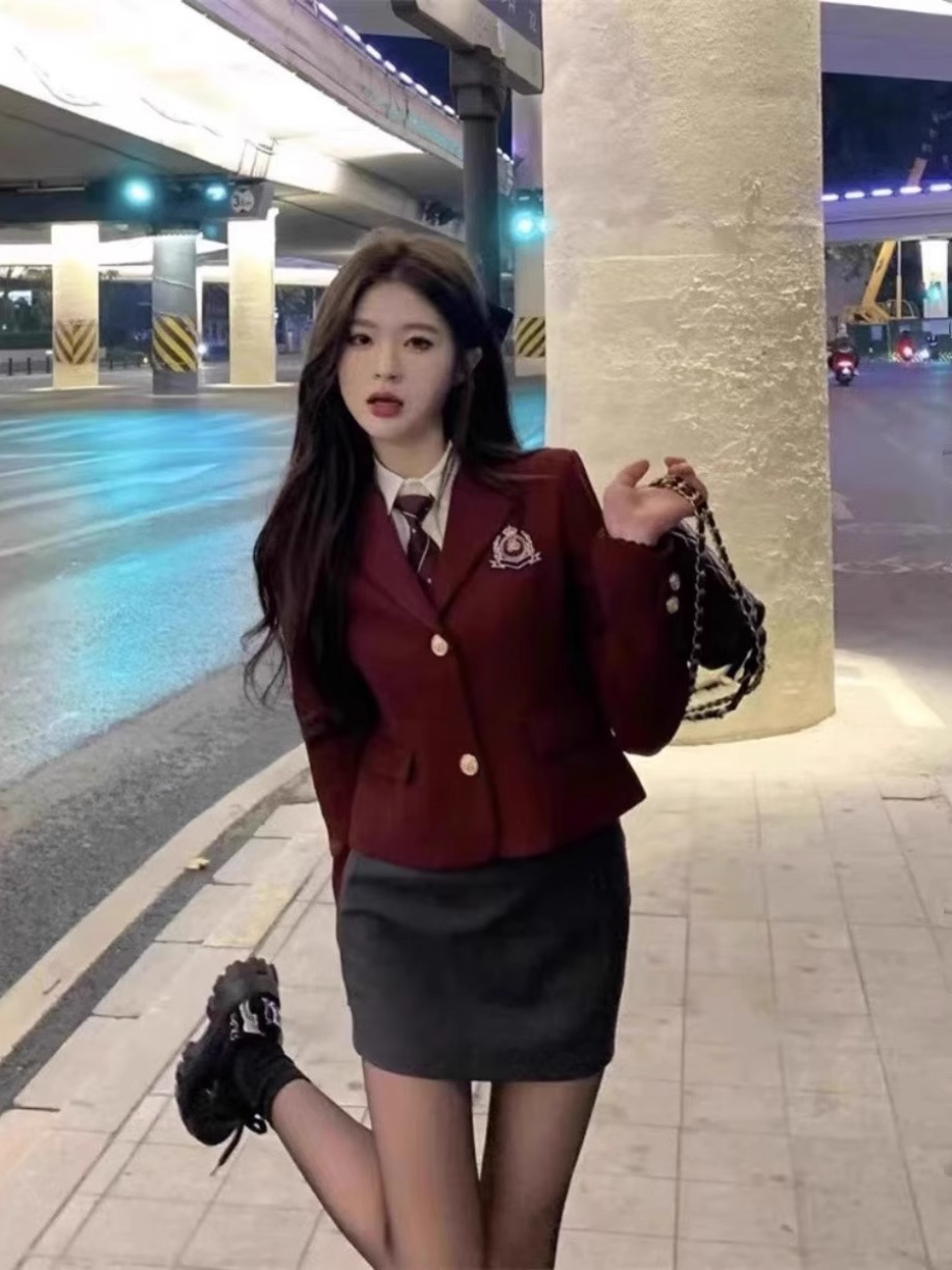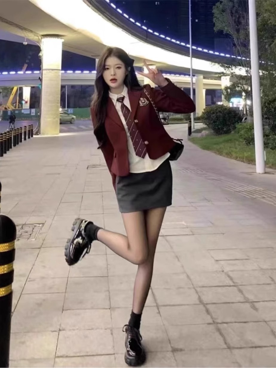 Jk 유니폼 순수한 욕망 뜨거운 소녀 세트 여성 영국 미국 달콤한 핫 아카데믹 스타일 버건디 세트 힙합 스커트 3 피스 세트스토어 가기