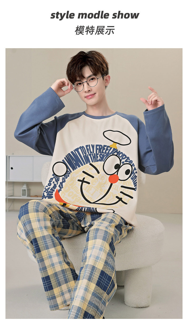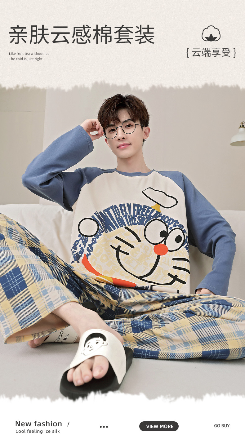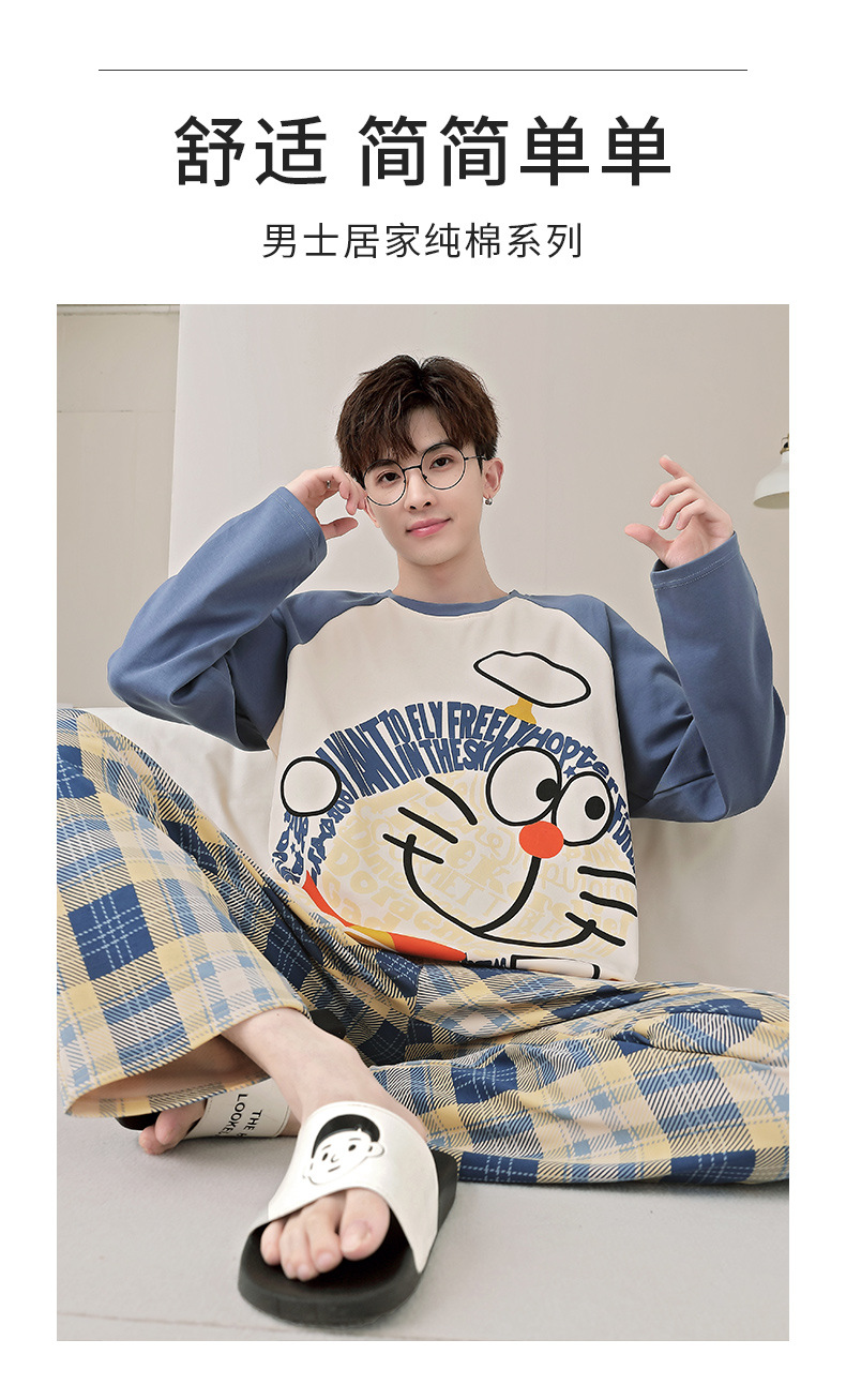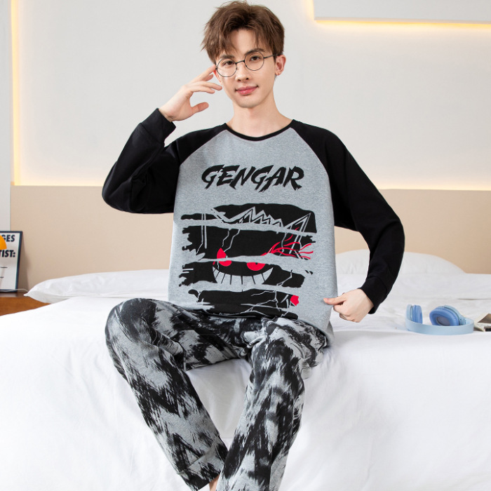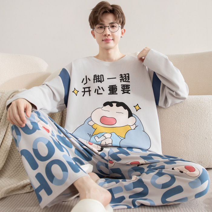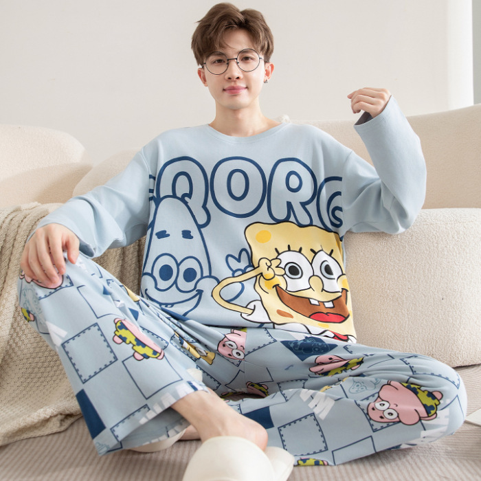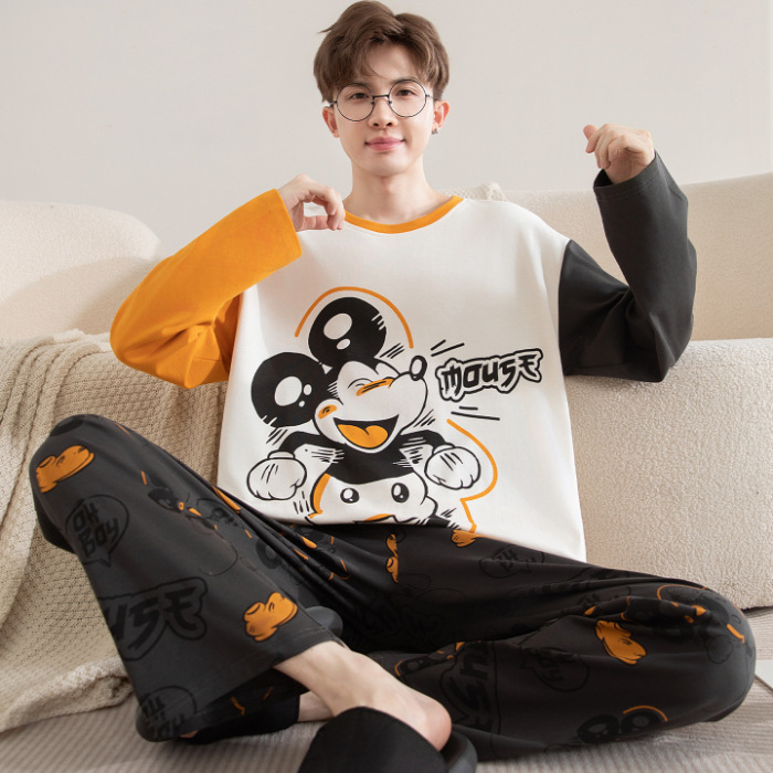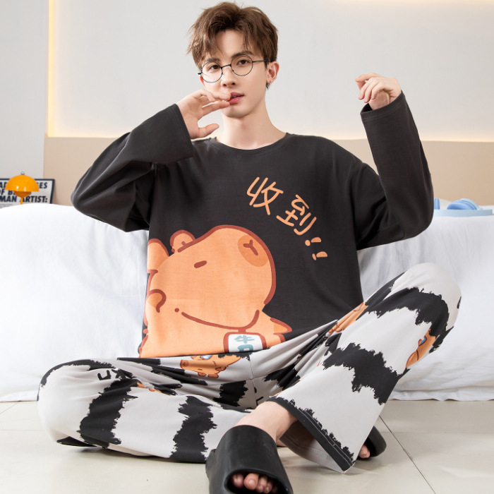 면 잠옷 남자의 봄과 가을 풀오버 긴 소매 바지 만화 플러스 사이즈 십대 200kg 외부 가정 옷 세트스토어 가기