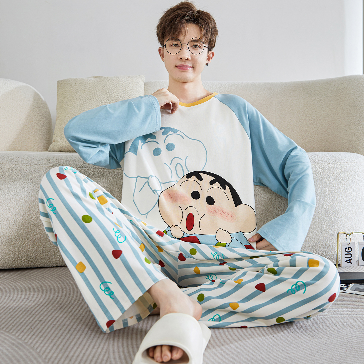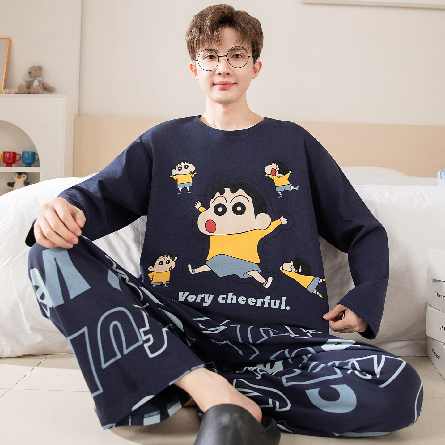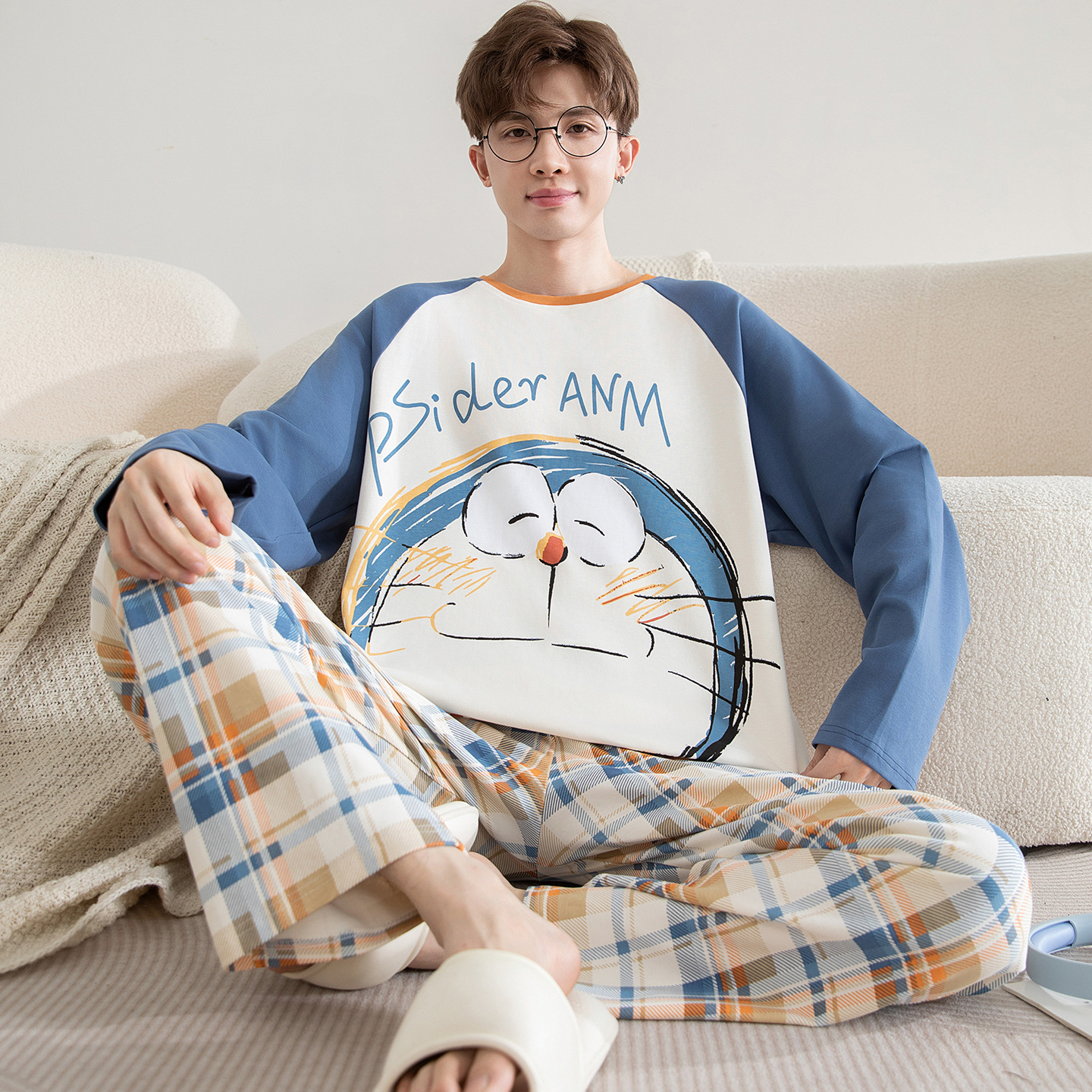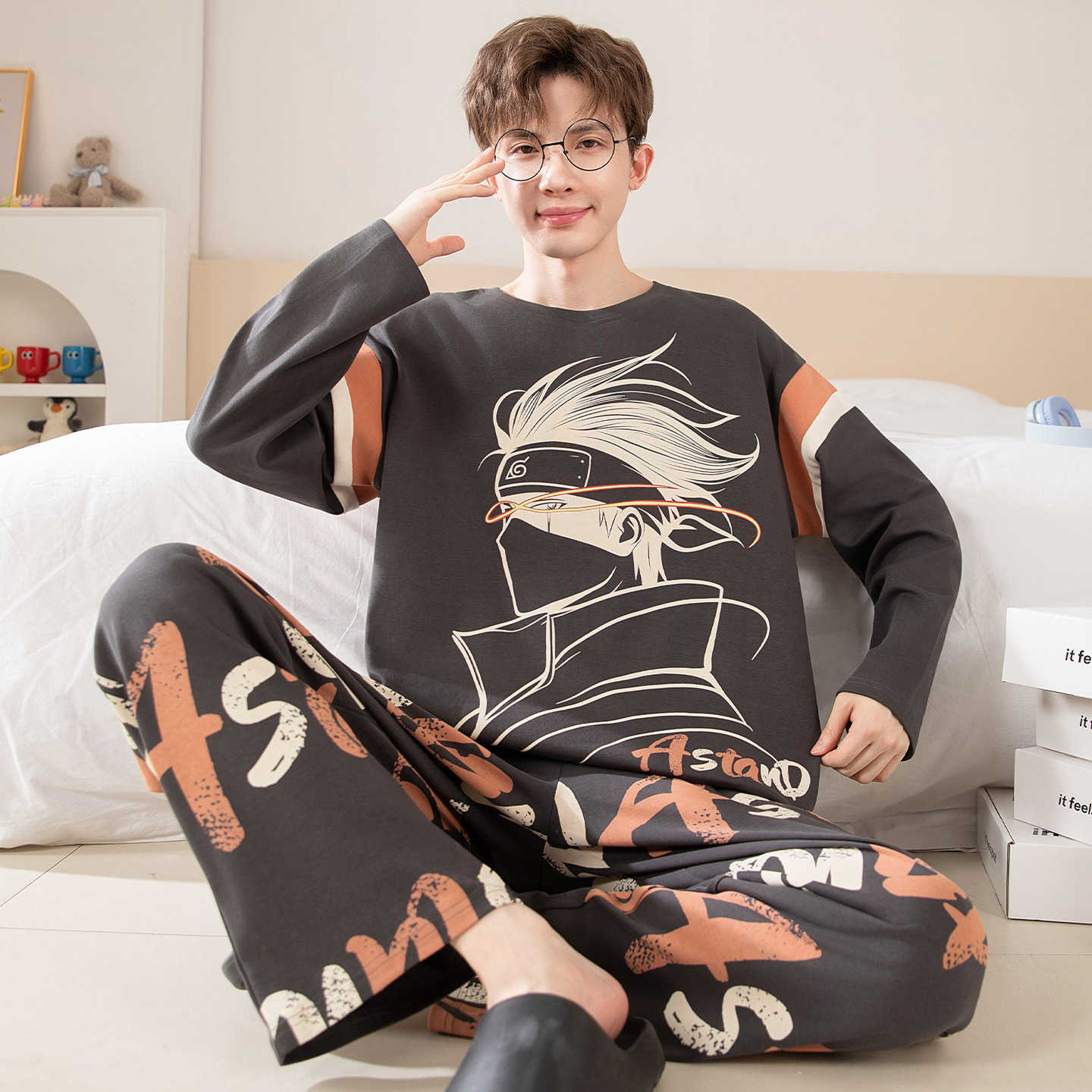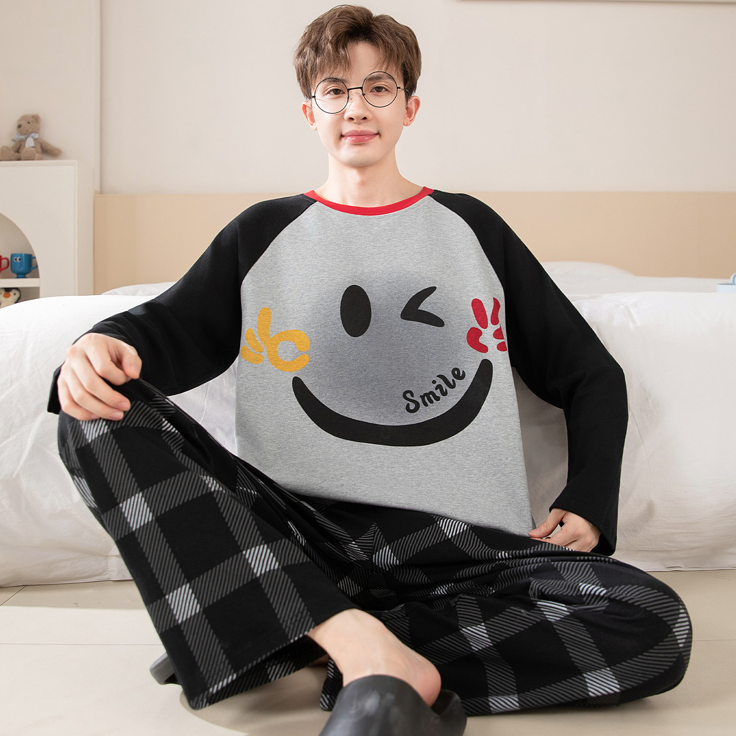 면 잠옷 남자의 봄과 가을 풀오버 긴 소매 바지 만화 플러스 사이즈 십대 200kg 외부 가정 옷 세트스토어 가기