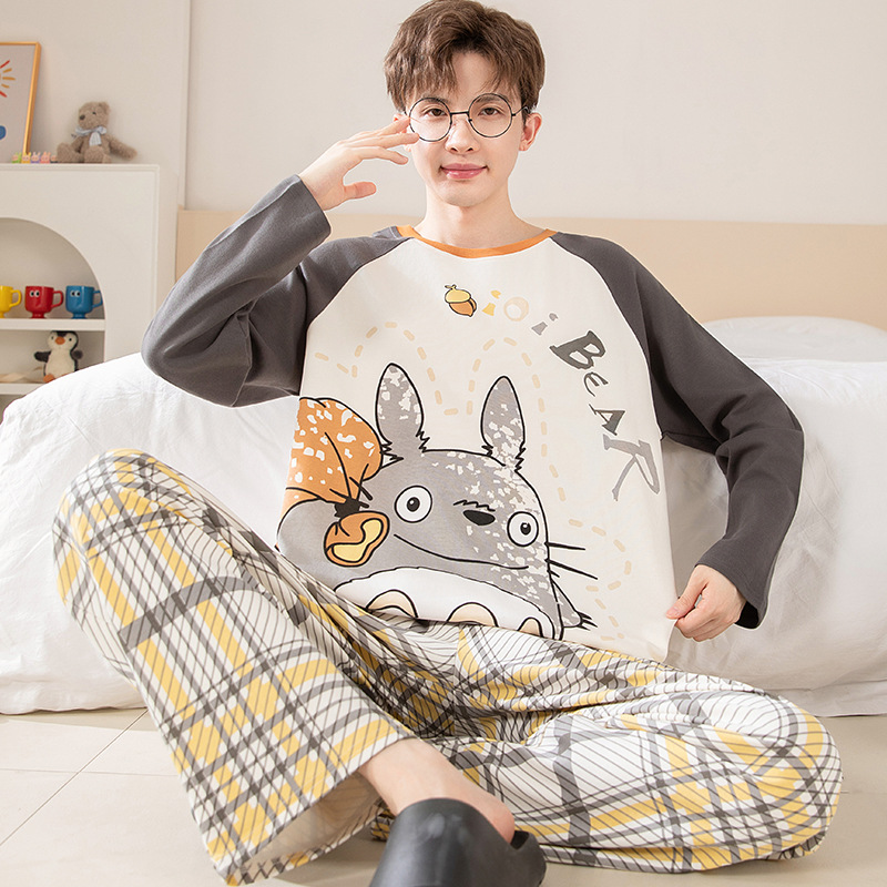 면 잠옷 남자의 봄과 가을 풀오버 긴 소매 바지 만화 플러스 사이즈 십대 200kg 외부 가정 옷 세트