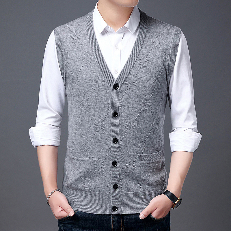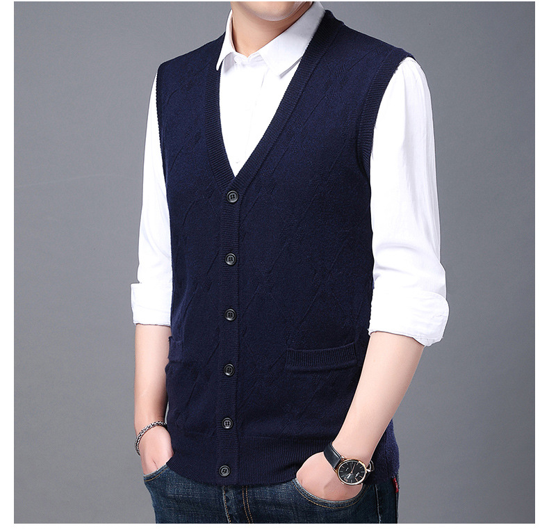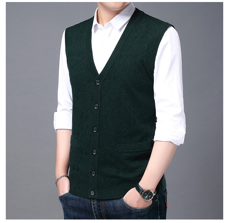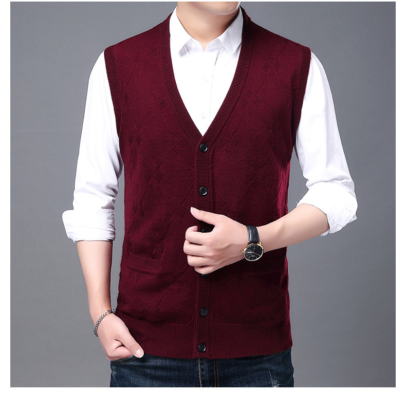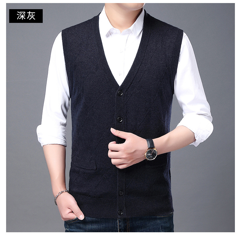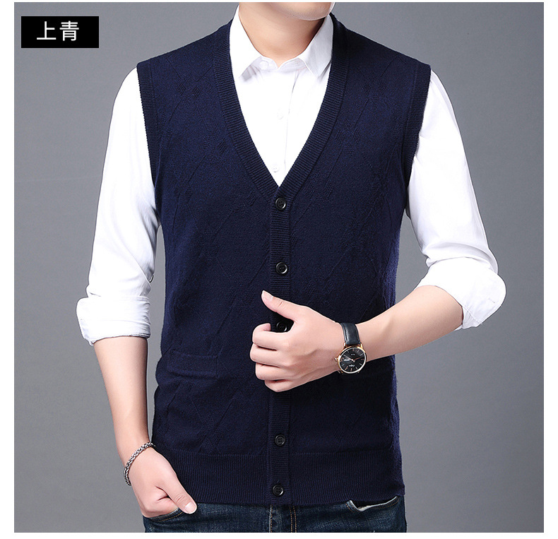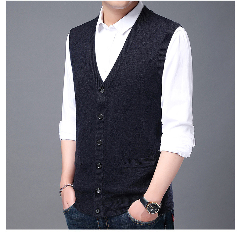 단색 캐주얼 포켓 V-Neck 스퀘어 자카드 조끼 가을과 겨울 따뜻한 내부 니트 조끼 남성용 민소매 멀티 컬러 스웨터