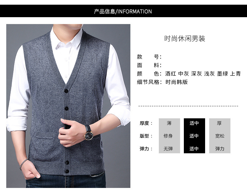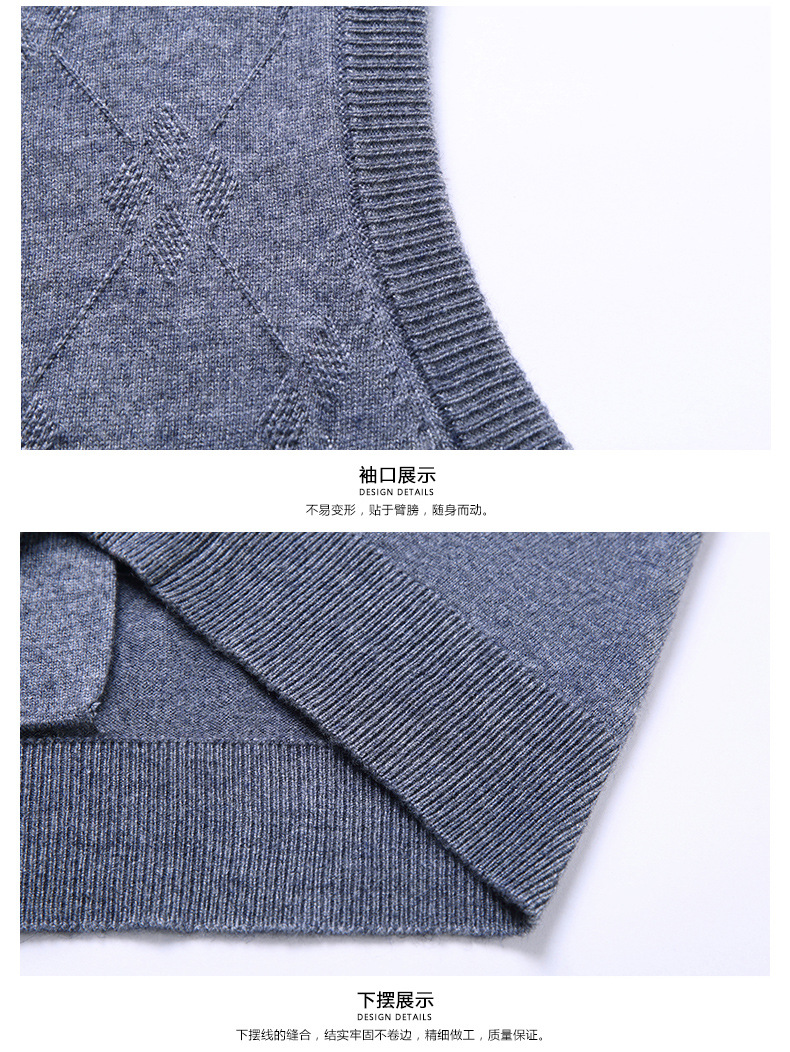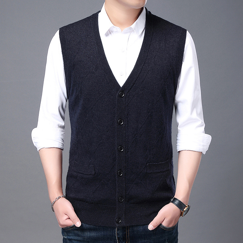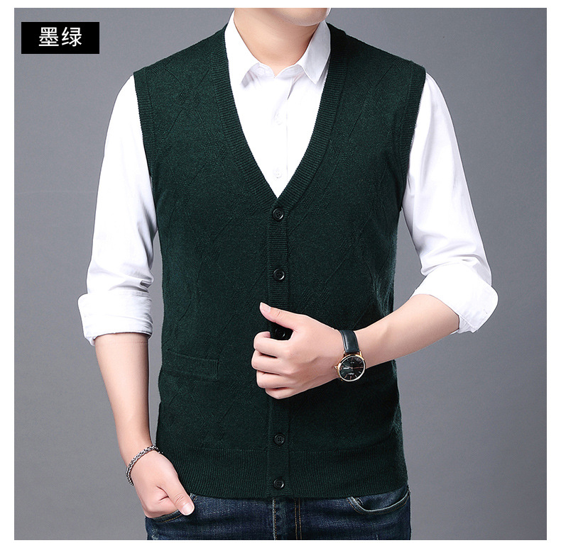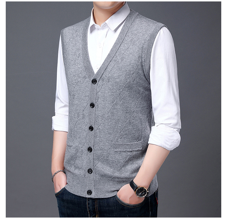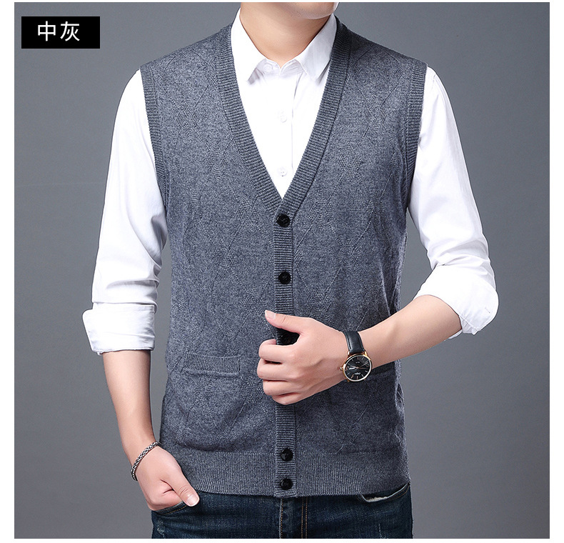 단색 캐주얼 포켓 V-Neck 스퀘어 자카드 조끼 가을과 겨울 따뜻한 내부 니트 조끼 남성용 민소매 멀티 컬러 스웨터