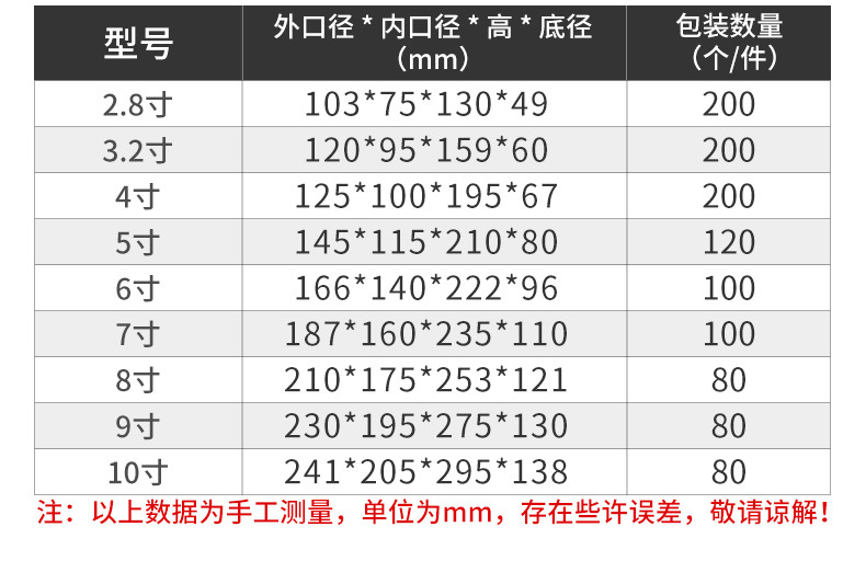 • 8inch (외경 210*높이 253*바닥 121mm) 개당 80개