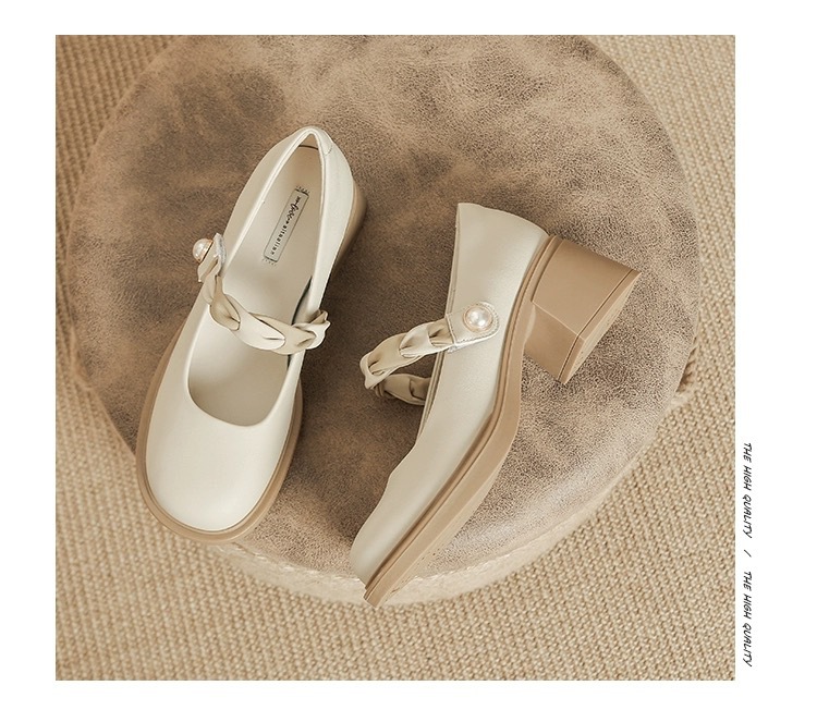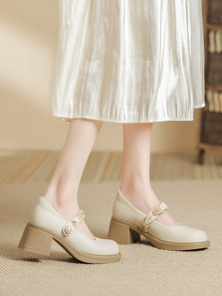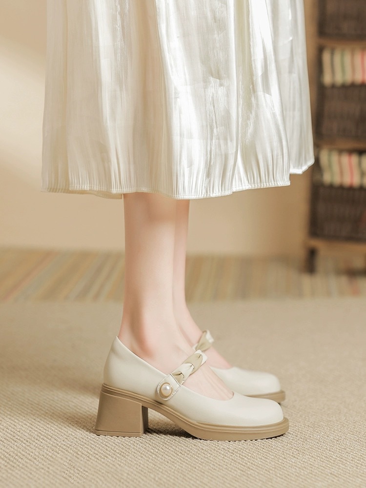 부드러운 가죽 화이트 메리 제인 신발 새로운 프랑스 이브닝 스타일 부드러운 가죽 부드러운 얕은 컷 힐 하이힐 신발 우아한 패션