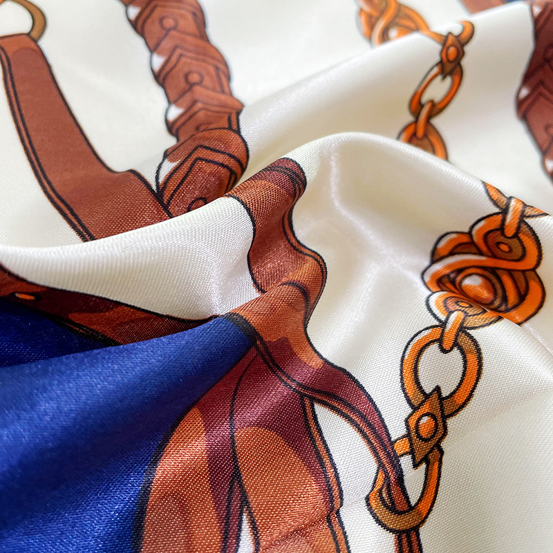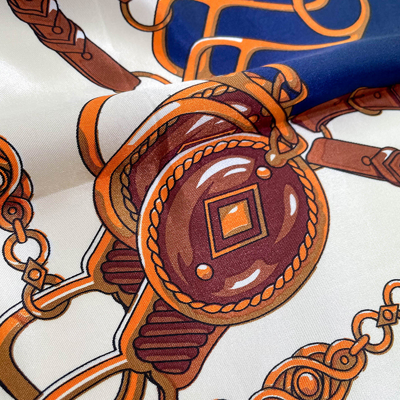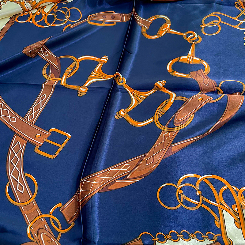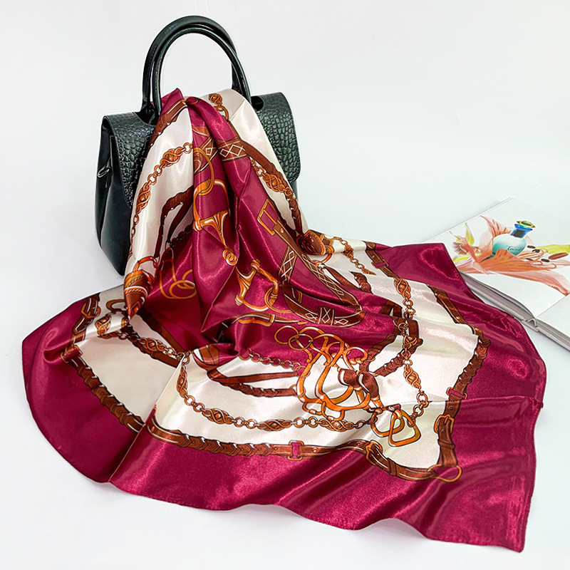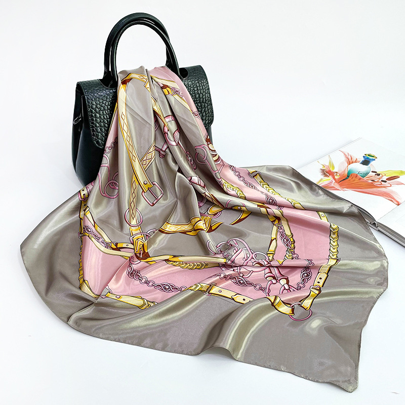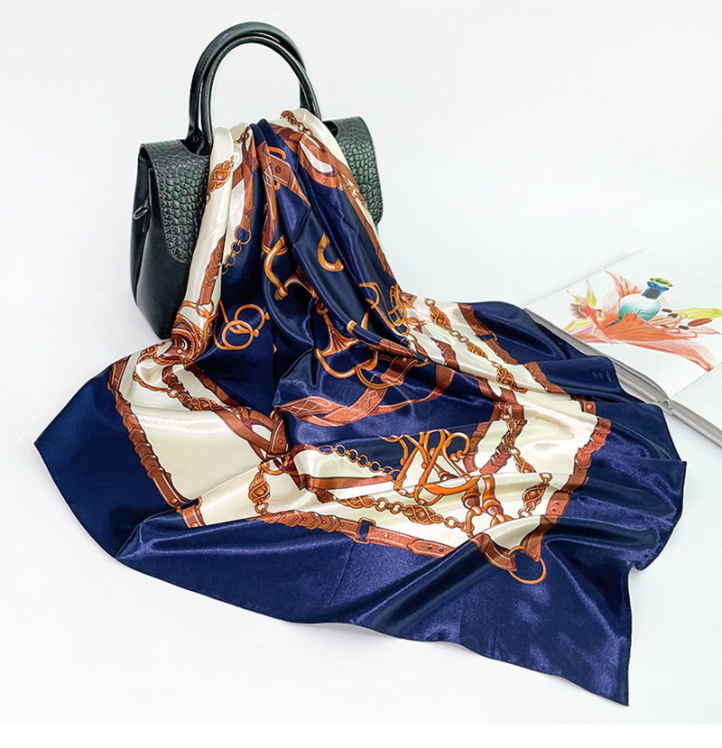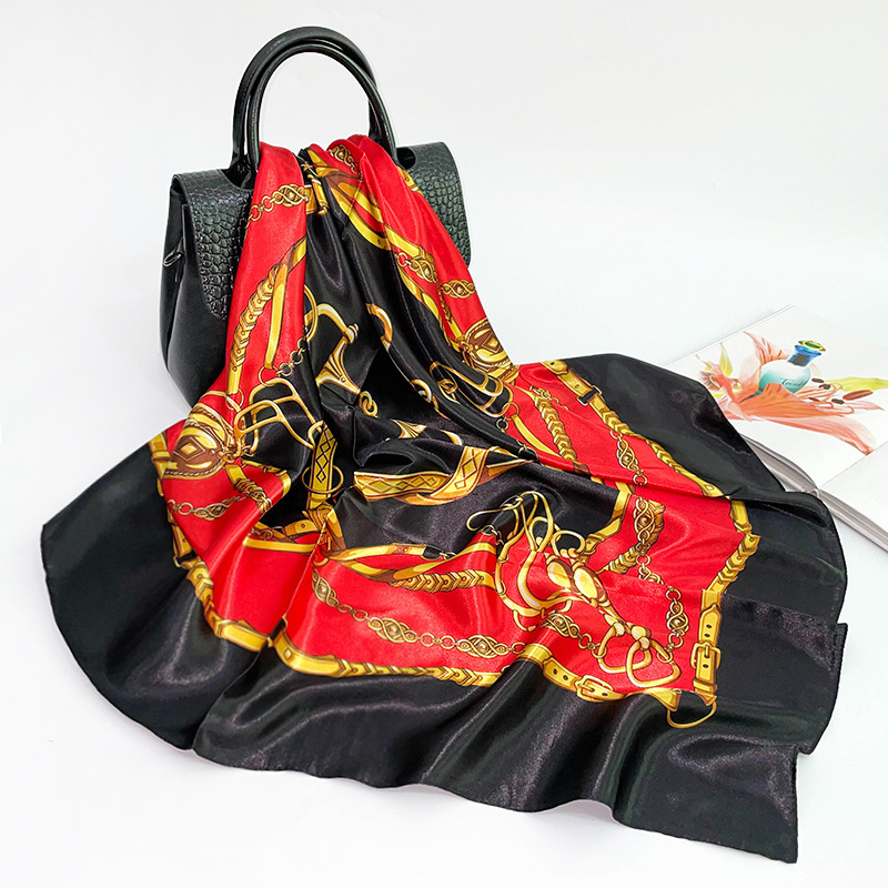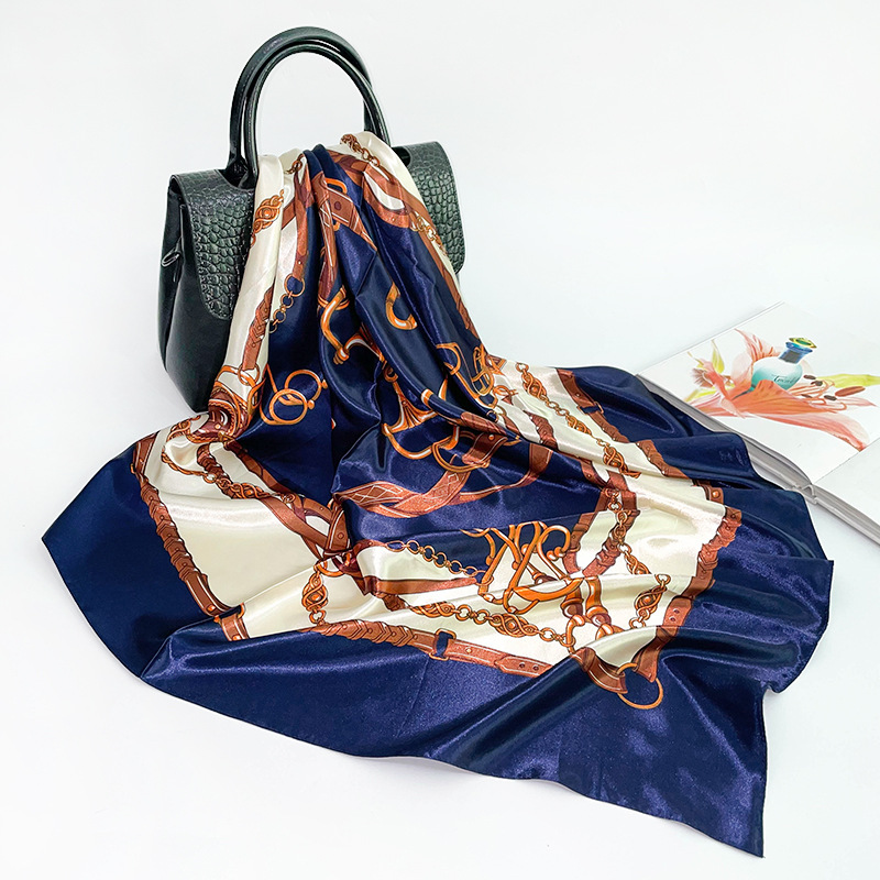 90cm 실크 스카프, 새틴 대형 사각 스카프, 유럽 및 미국 스타일 체인 프린트 헤드 스카프, 새틴 숄 스카프, 중국풍 무지 크레이프 새틴