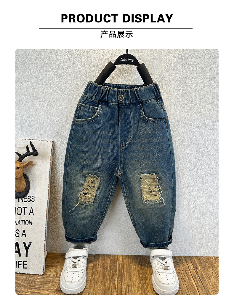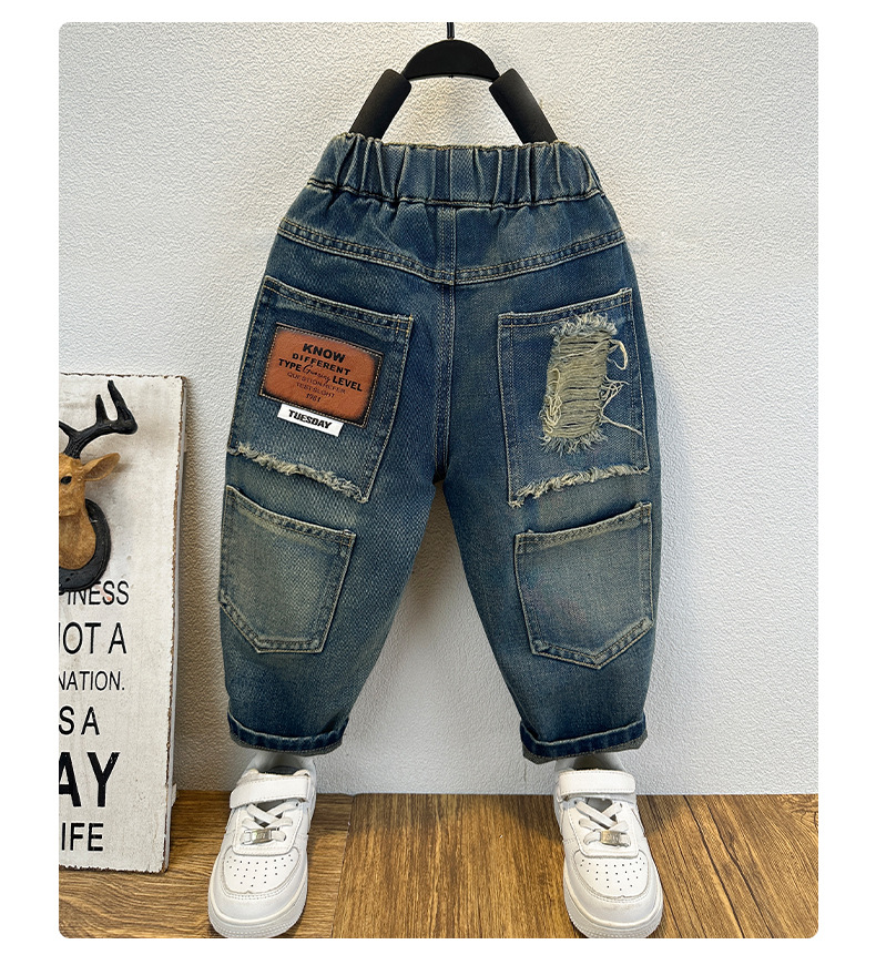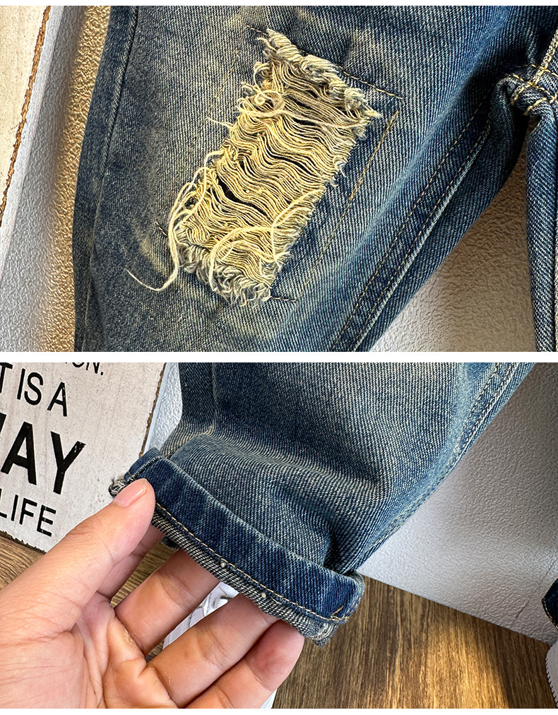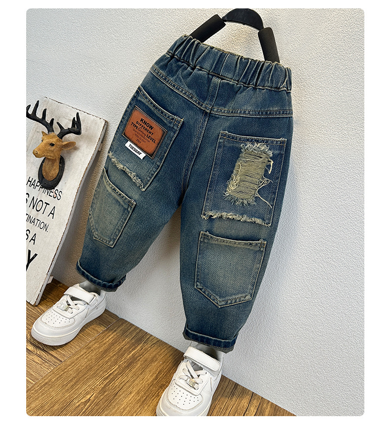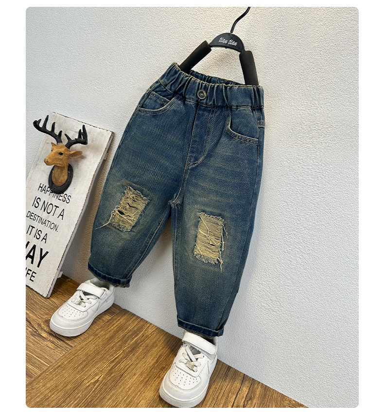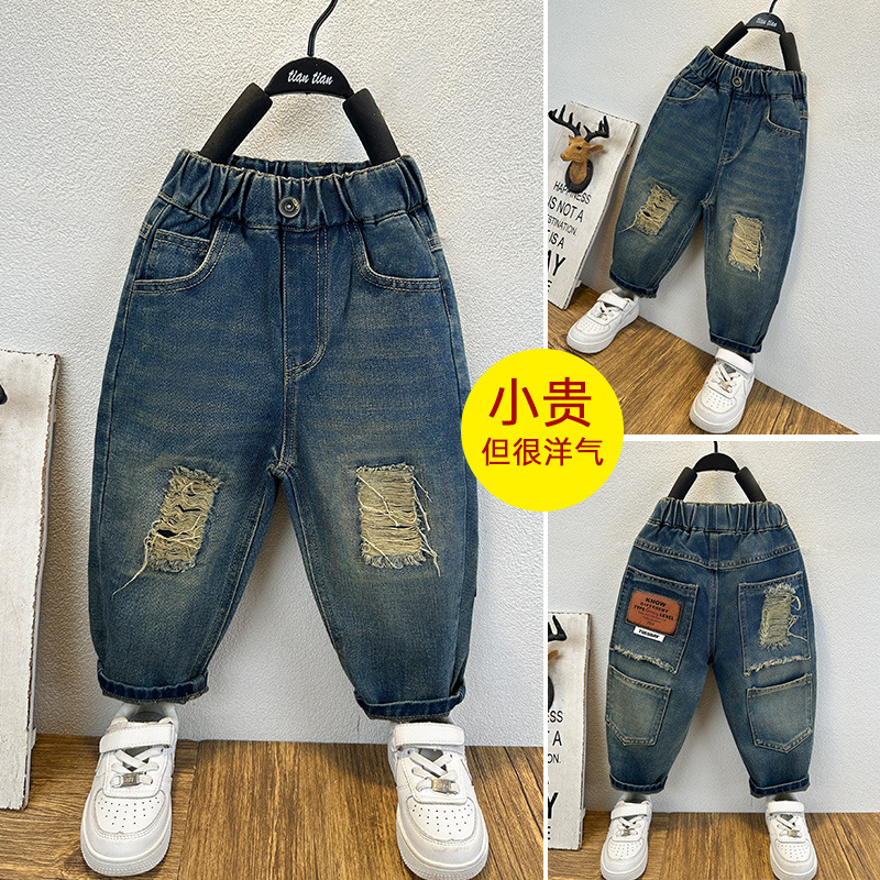 소년 튀긴 거리 청바지 가을 2024 새로운 어린이 잘 생긴 유행 유행 멋진 리핑 작은 소년의 바지 봄과 가을스토어 가기