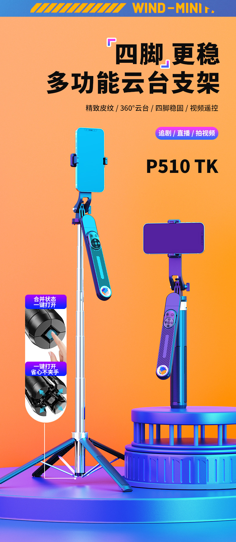 P515TK 키 4 피트 트레몰로 블루투스 셀카 스틱 유니버설 휴대 전화 라이브 플로어 스탠드 안정기를 엽니 다.스토어 가기
