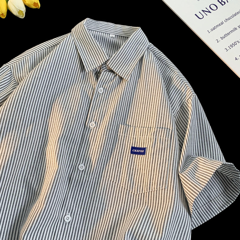 스트라이프 반팔 셔츠 남성 여름 패션 브랜드 오버 사이즈 캐주얼 옷깃 셔츠 아메리칸 스타일 레트로 커플의 탑스토어 가기