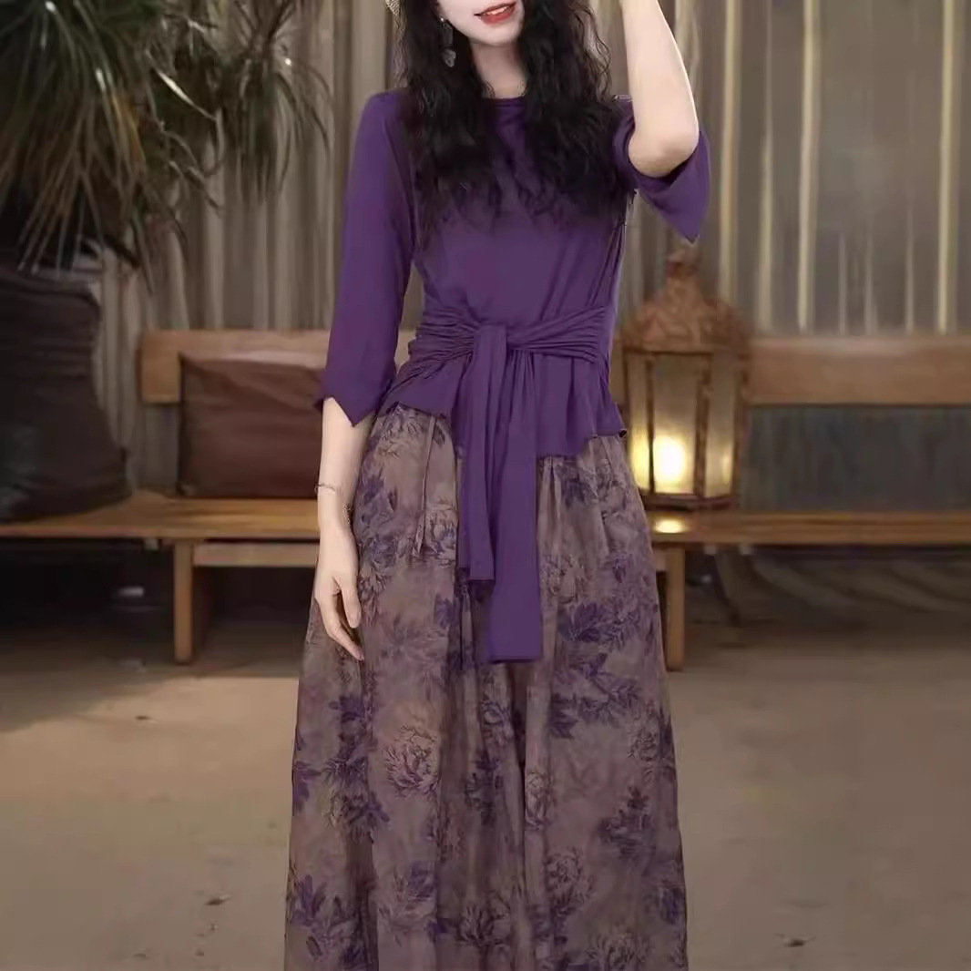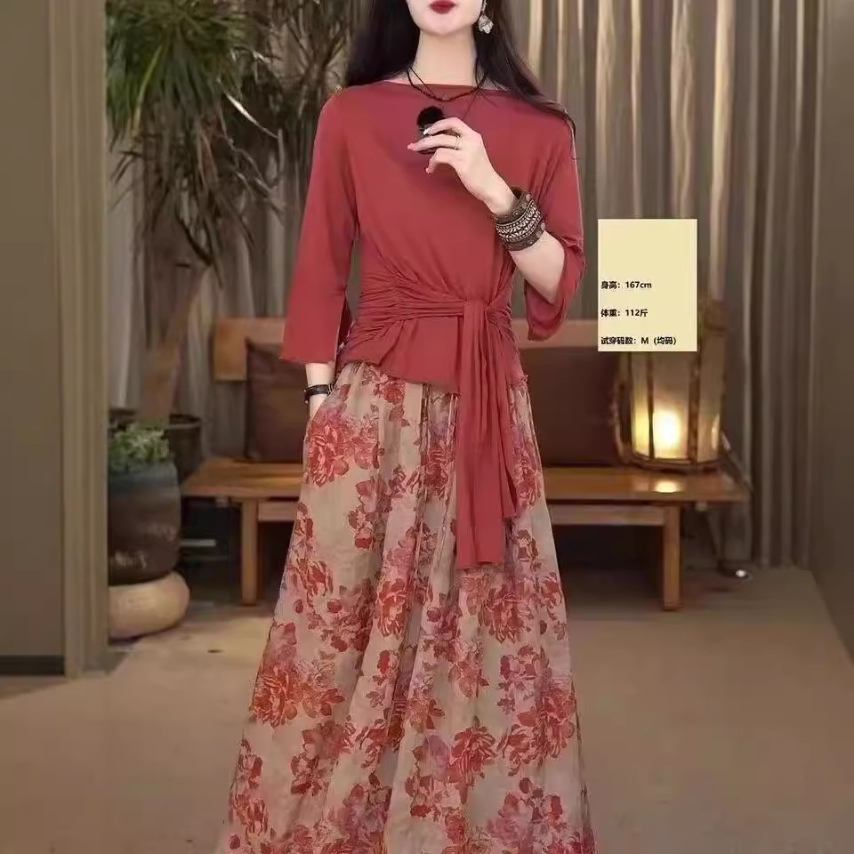 가을 2024 빈티지 예술적 투피스 세트 여성 패션 뉴 에이지 감소 올 매치 탑 인쇄 중간 길이 치마스토어 가기