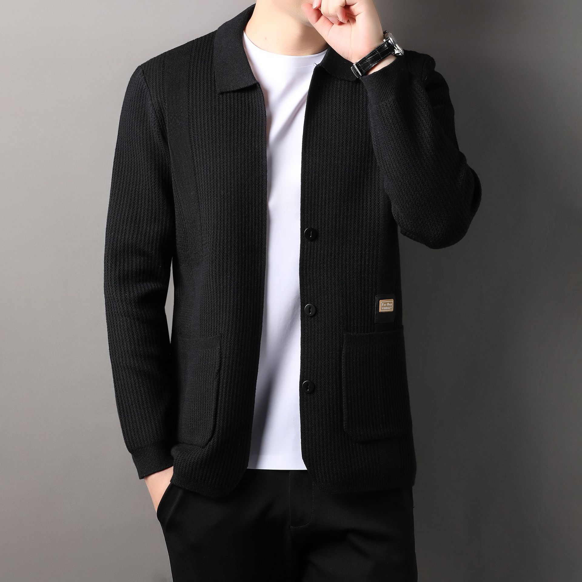 남자 봄과 가을 니트 카디건 옷깃 캐주얼 포켓 두꺼운 자카드 긴팔 한국식 올 매치 스웨터 재킷