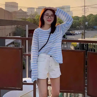 韩系撞色条纹长袖防晒衣2024夏季新款女休闲宽松显瘦薄款圆领T恤