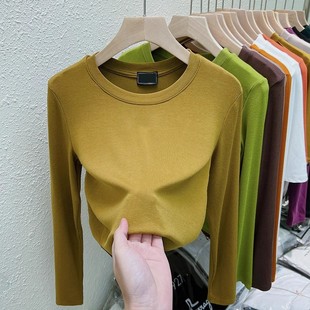 正肩长袖t恤女2024春秋新款纯色修身显瘦弹力内搭圆领打底衫上衣