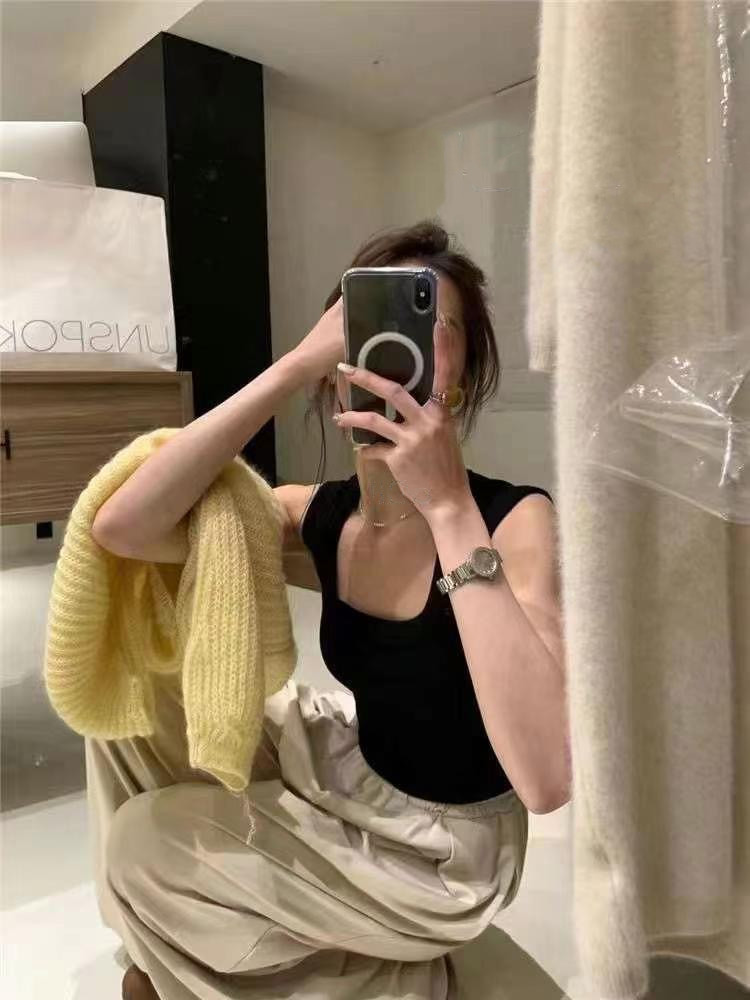 와이드 숄더 스트랩 스퀘어 칼라 슬림 핏 퓨어 코튼 조끼 착용 프리 브라 슬림 핏 슬링 내부 솔리드 컬러 아우터웨어 탑스토어 가기