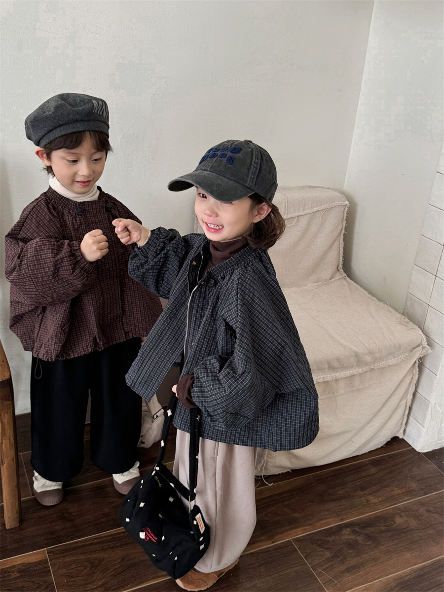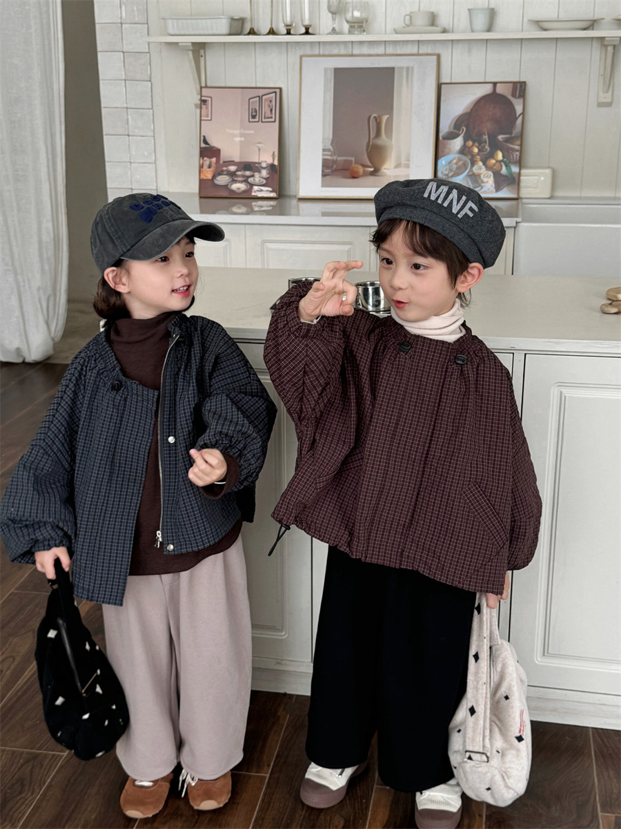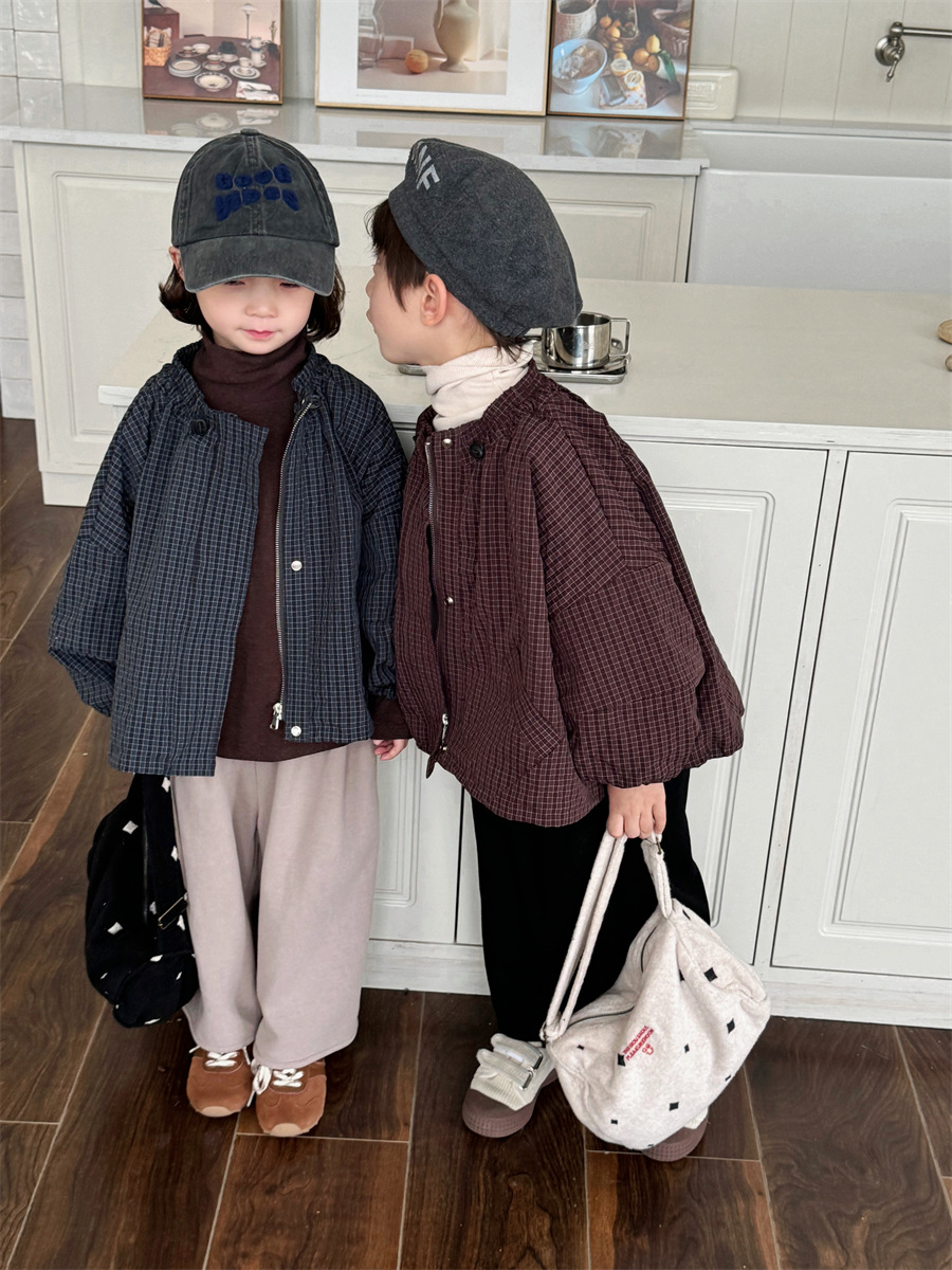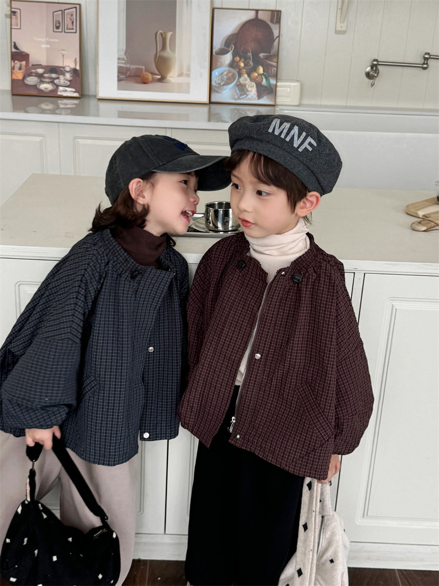 Jiaye Children's Products 2025 어린이 가을 새로운 느슨한 격자 무늬 재킷 남성과 여성의 아기 짧은 빵 재킷스토어 가기