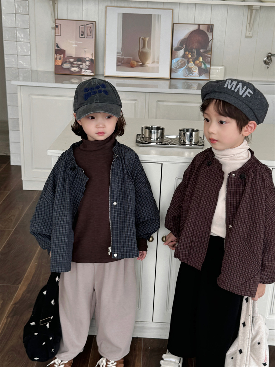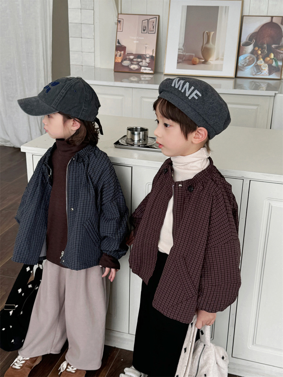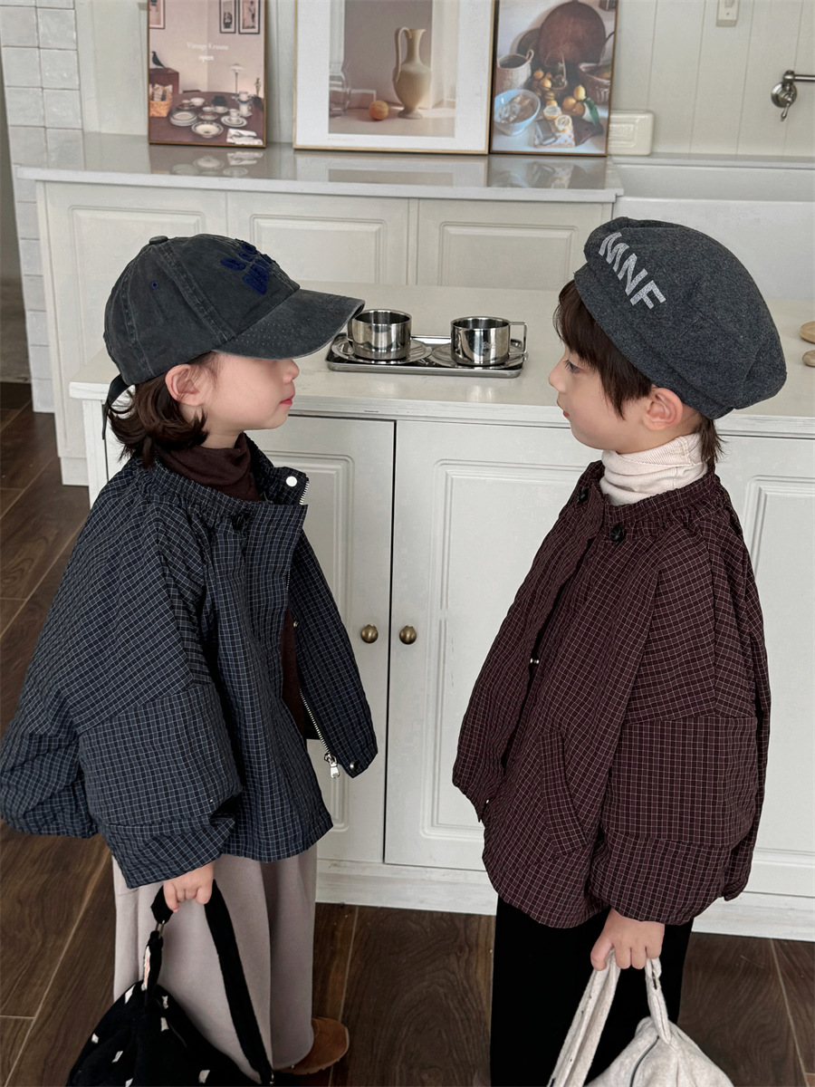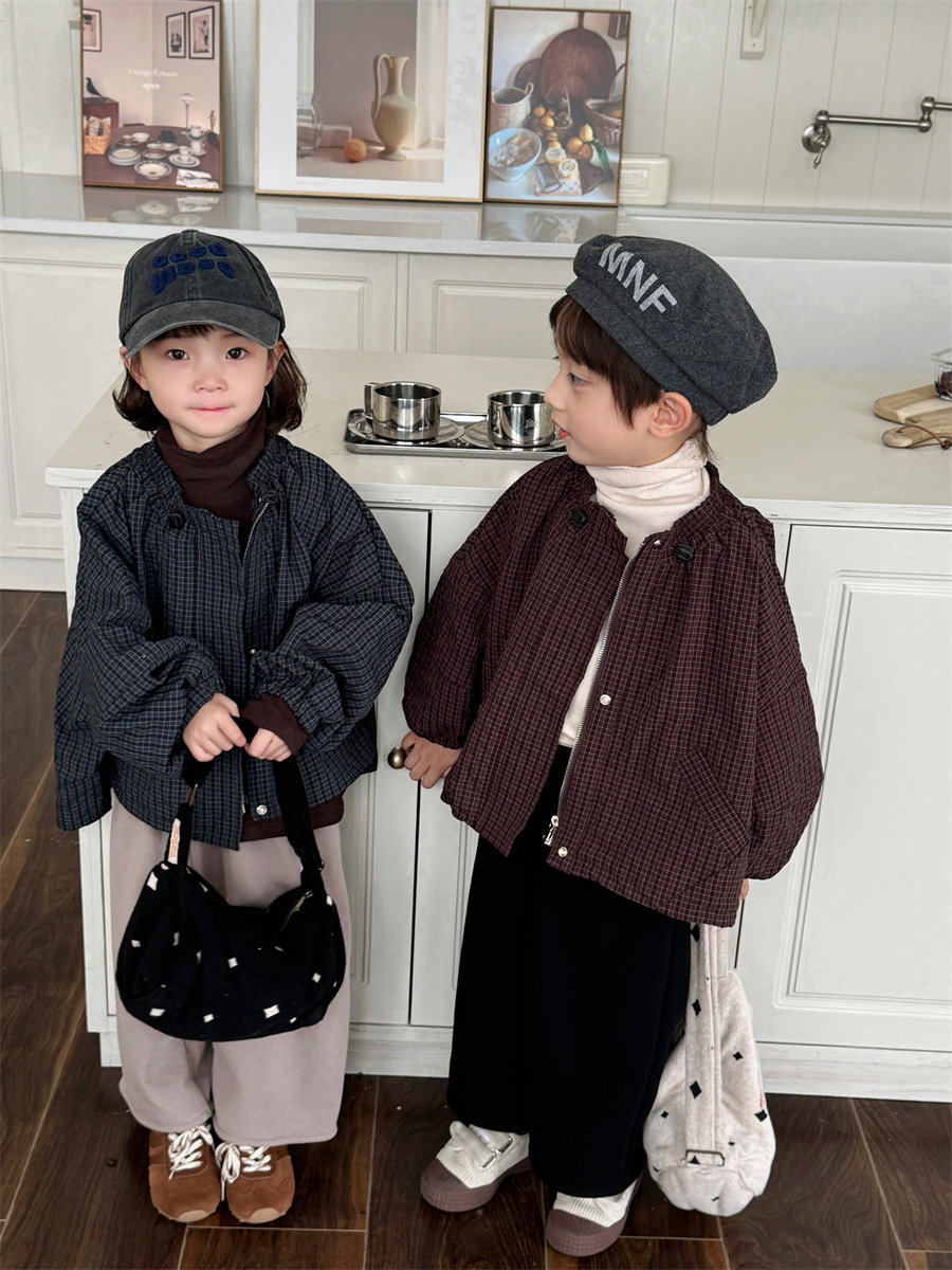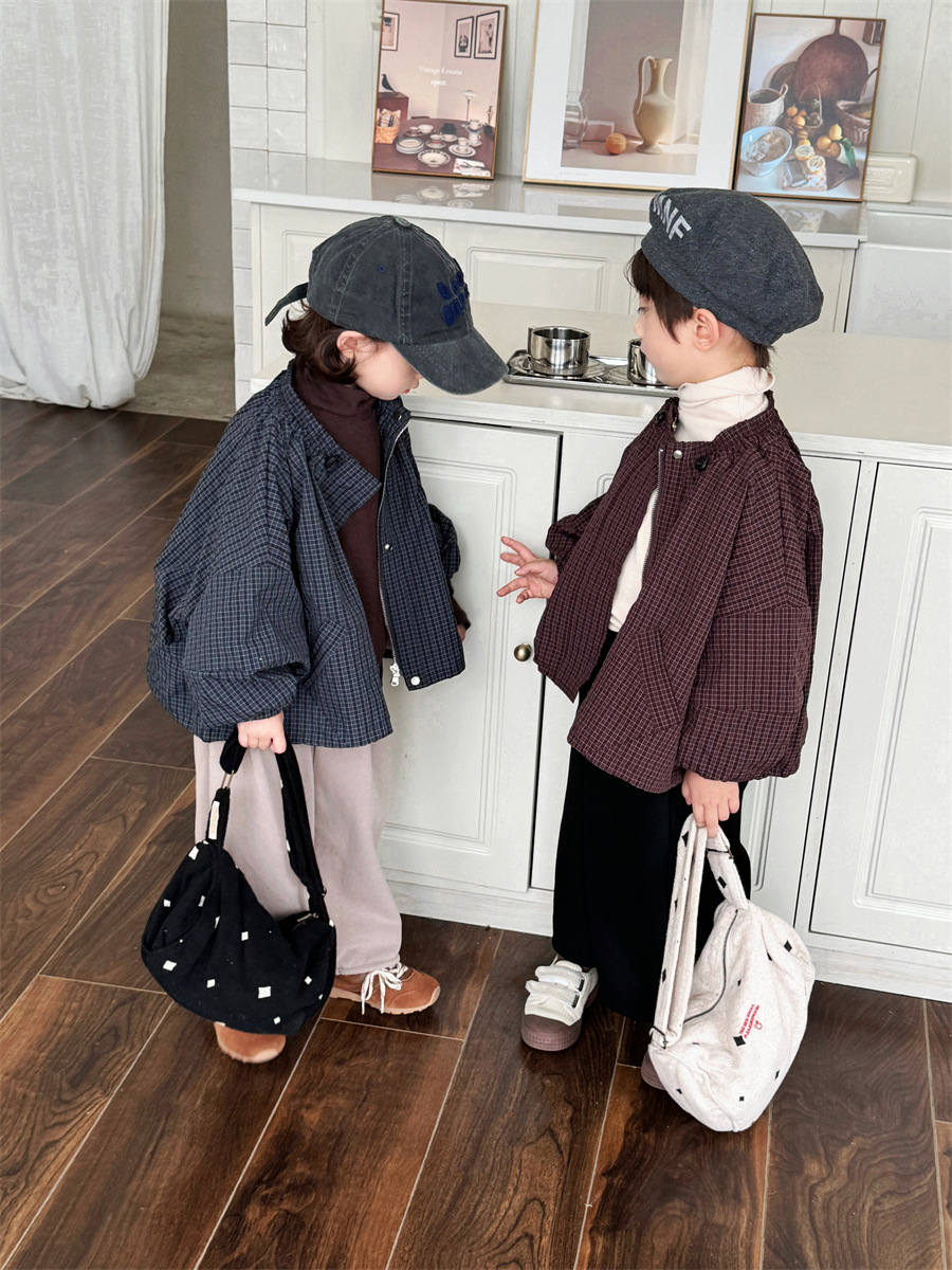 Jiaye Children's Products 2025 어린이 가을 새로운 느슨한 격자 무늬 재킷 남성과 여성의 아기 짧은 빵 재킷스토어 가기