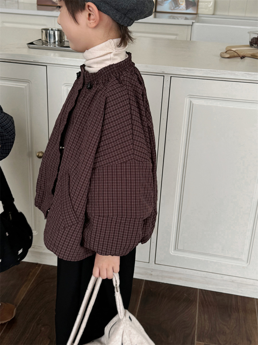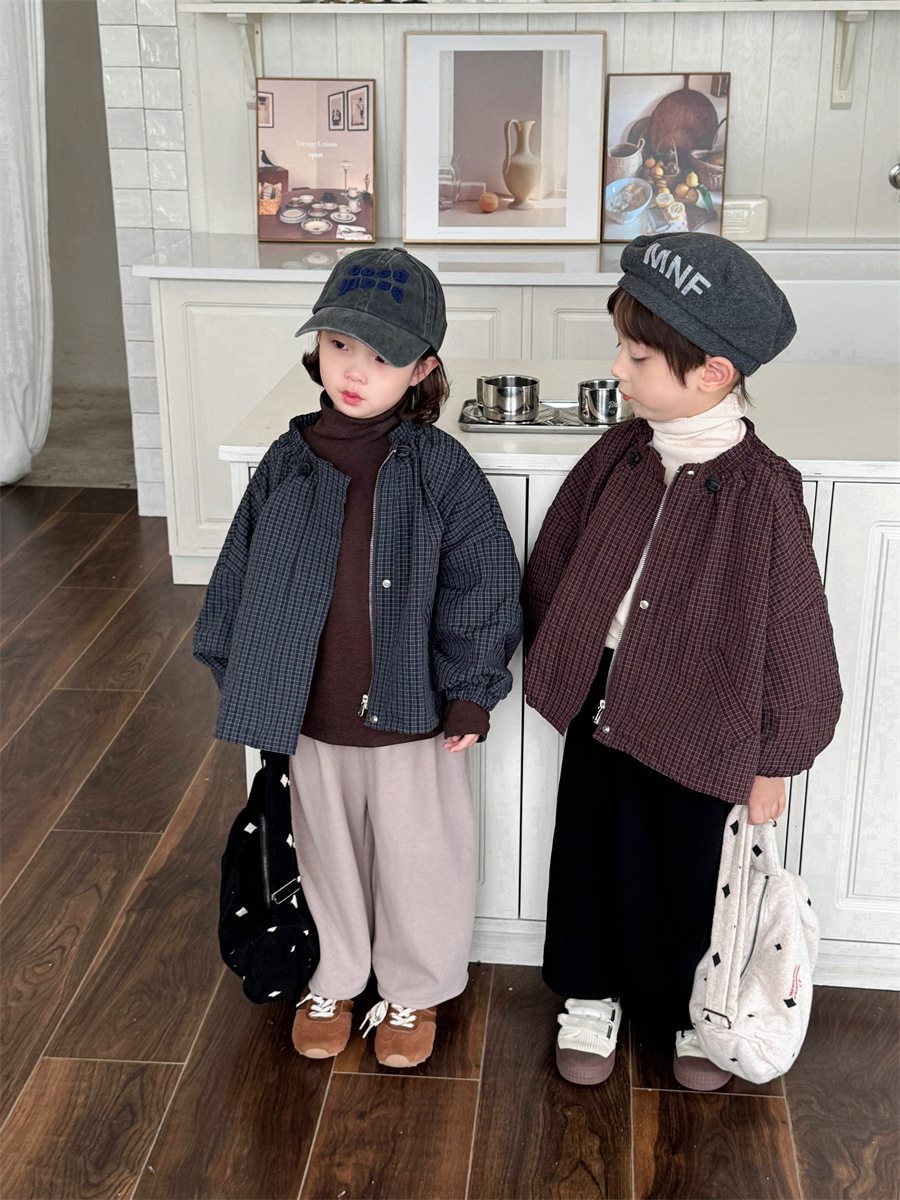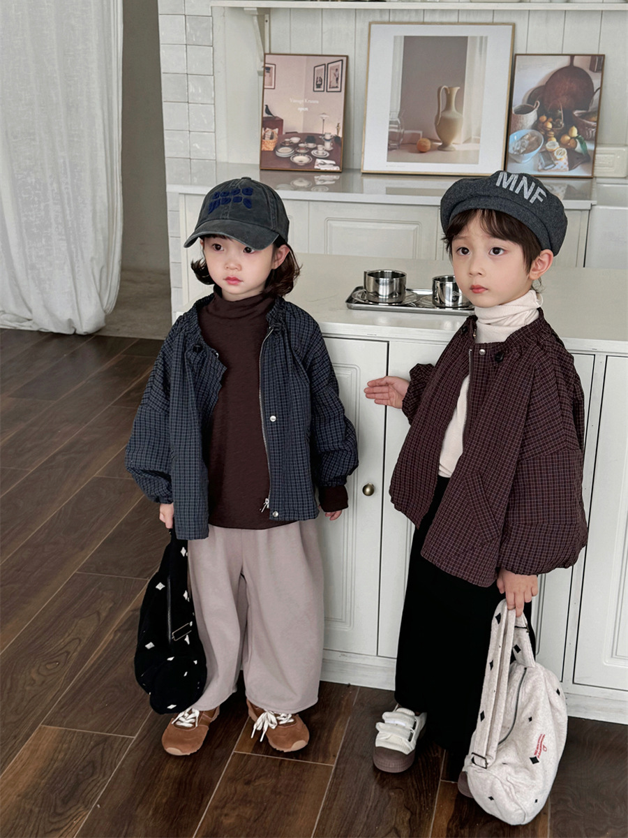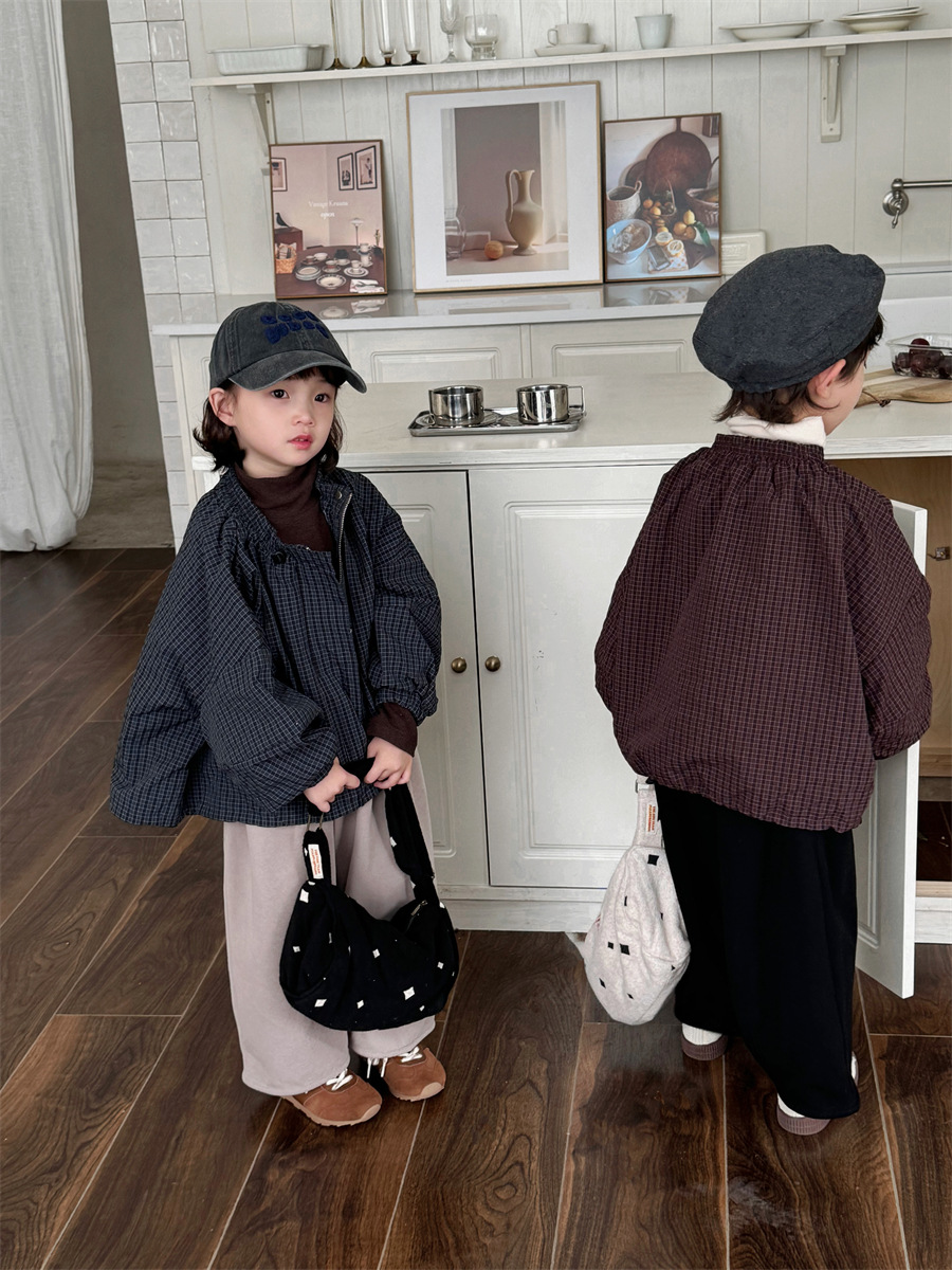 Jiaye Children's Products 2025 어린이 가을 새로운 느슨한 격자 무늬 재킷 남성과 여성의 아기 짧은 빵 재킷스토어 가기