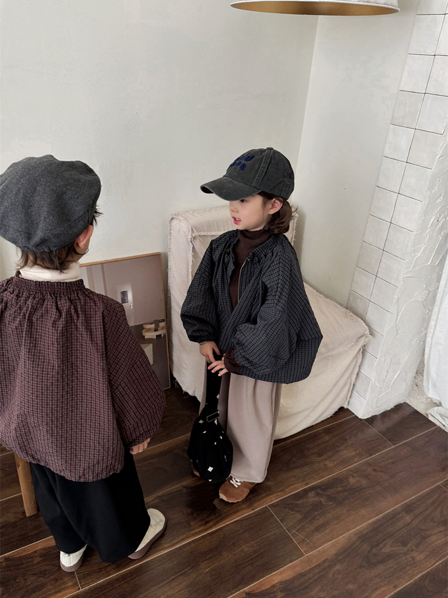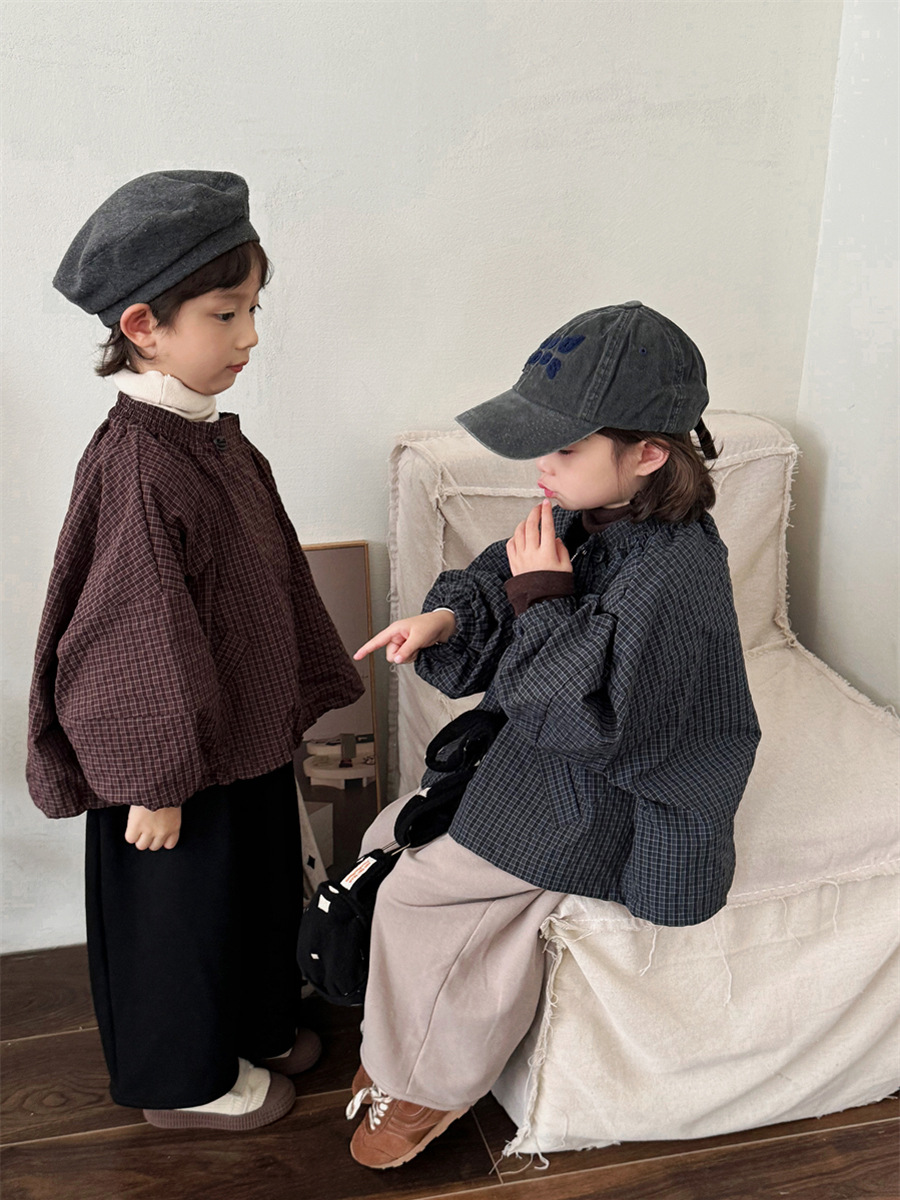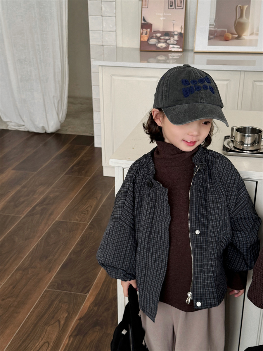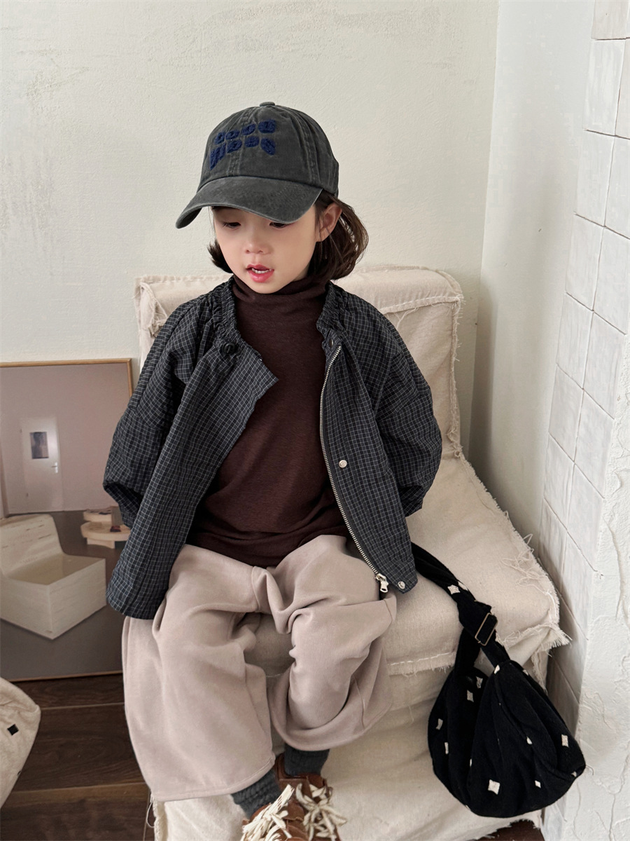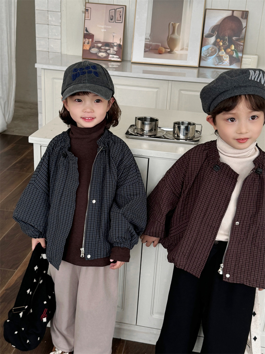 Jiaye Children's Products 2025 어린이 가을 새로운 느슨한 격자 무늬 재킷 남성과 여성의 아기 짧은 빵 재킷스토어 가기