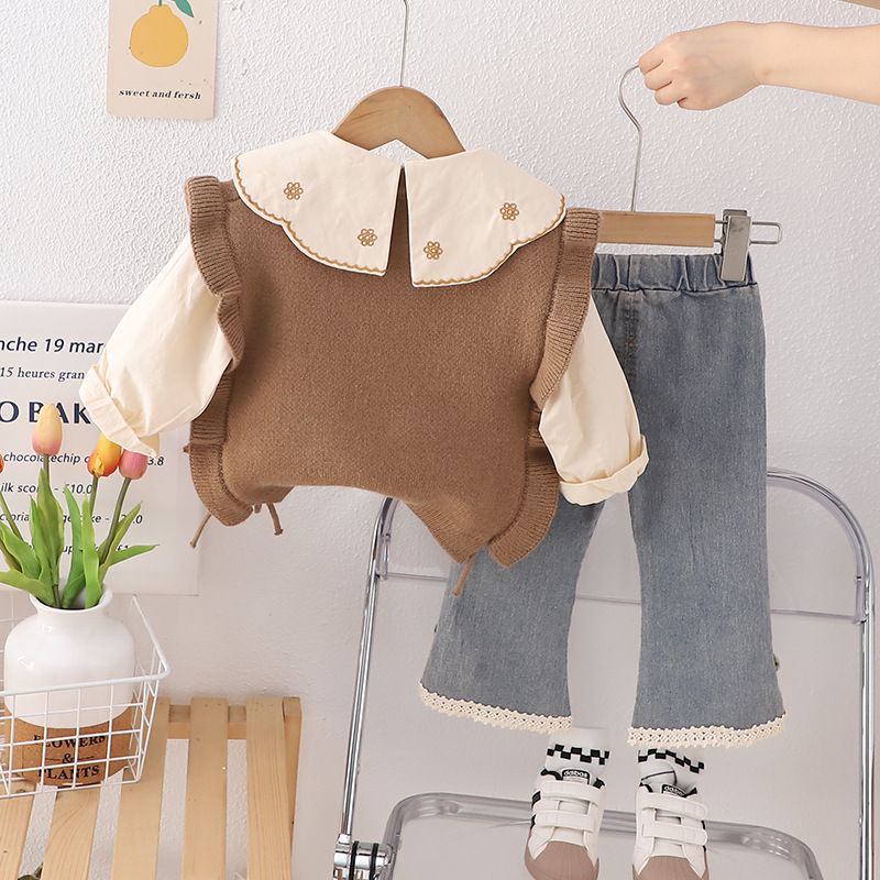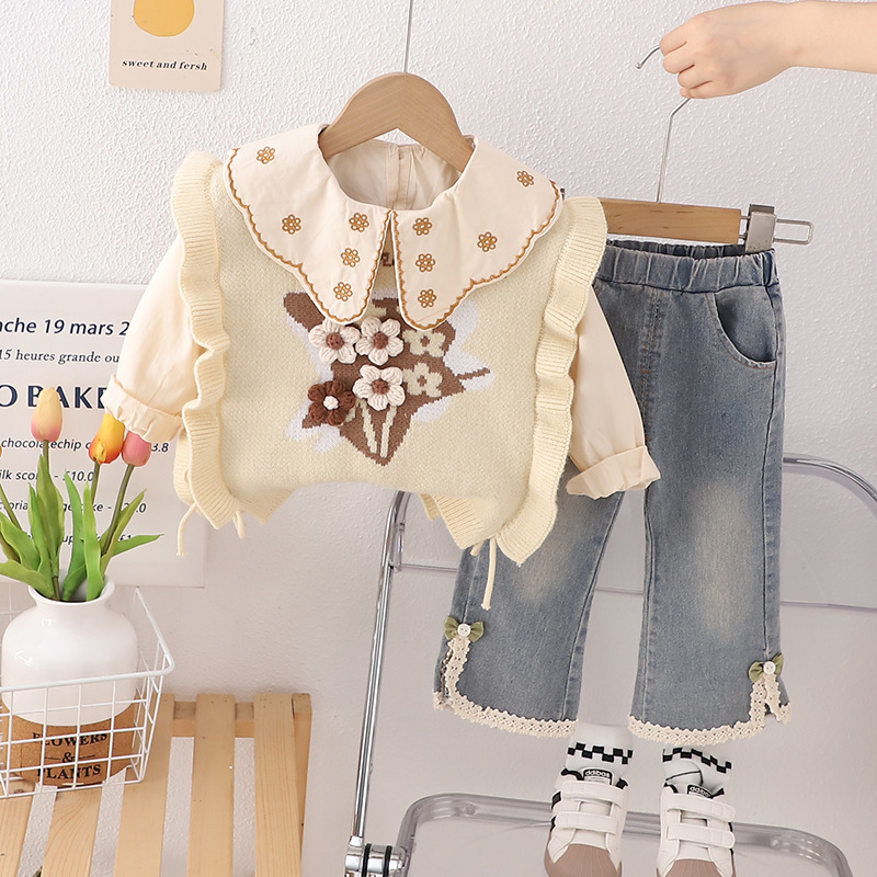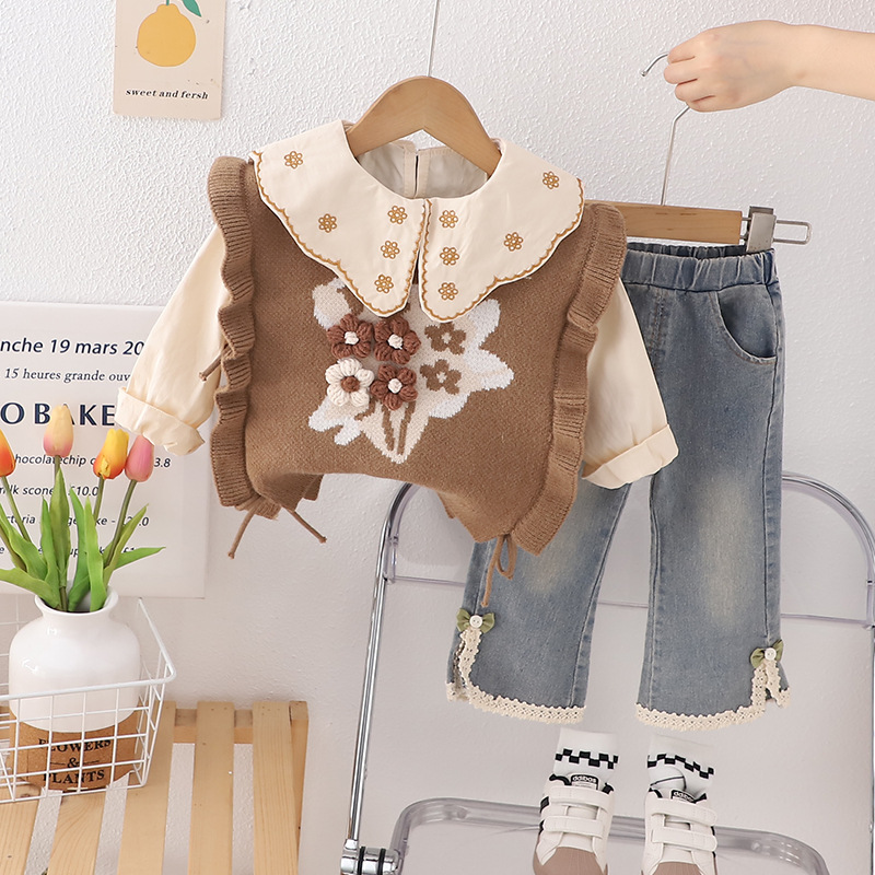 2024 여자 스웨터 조끼 레이스 대형 옷깃 코트 스트레이트 튜브 데님 바지 3 피스 공장 도매스토어 가기