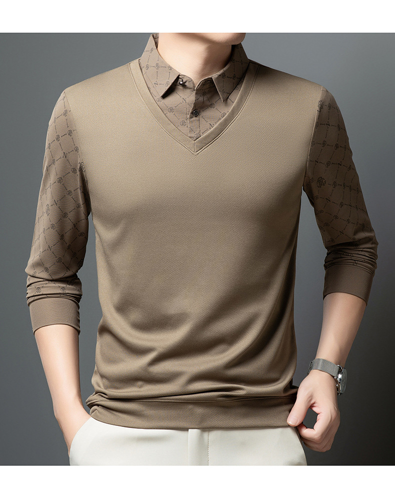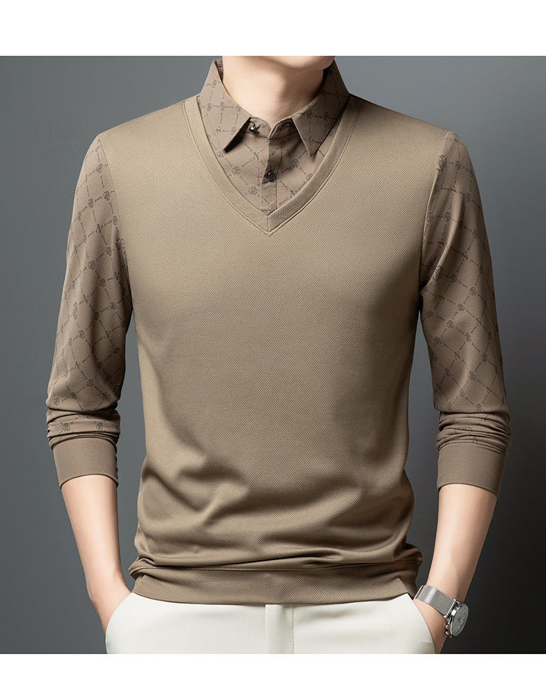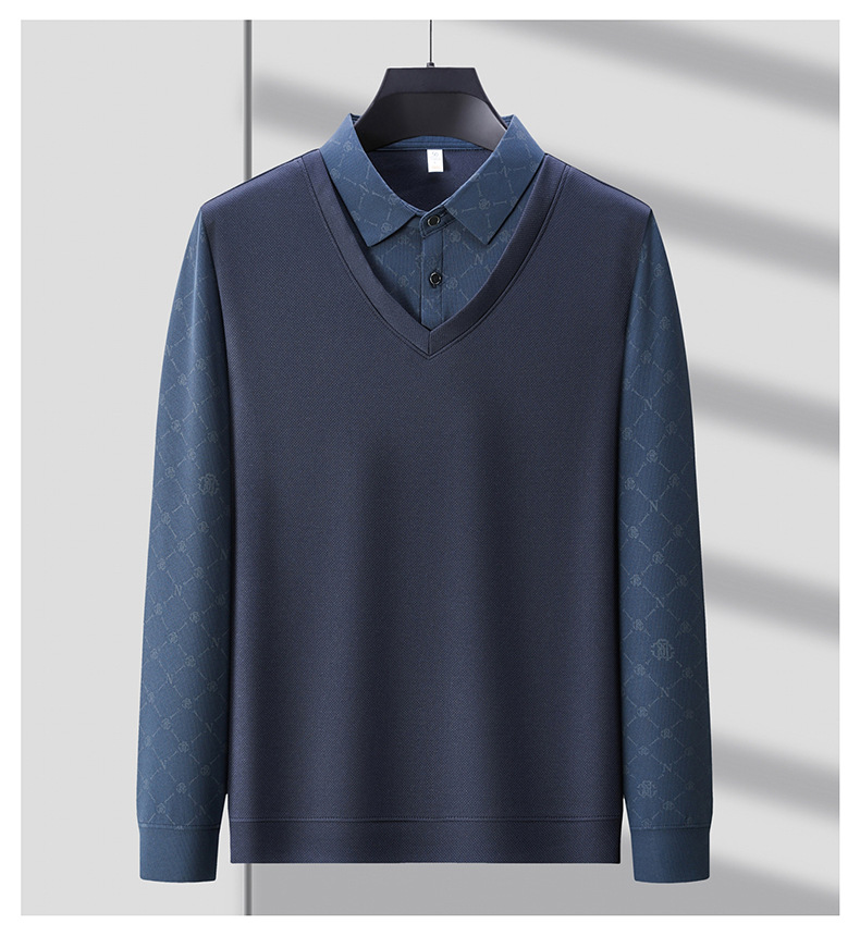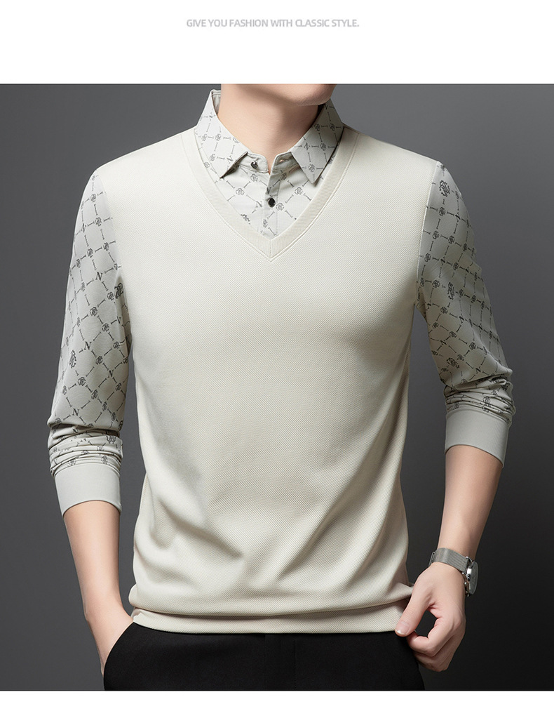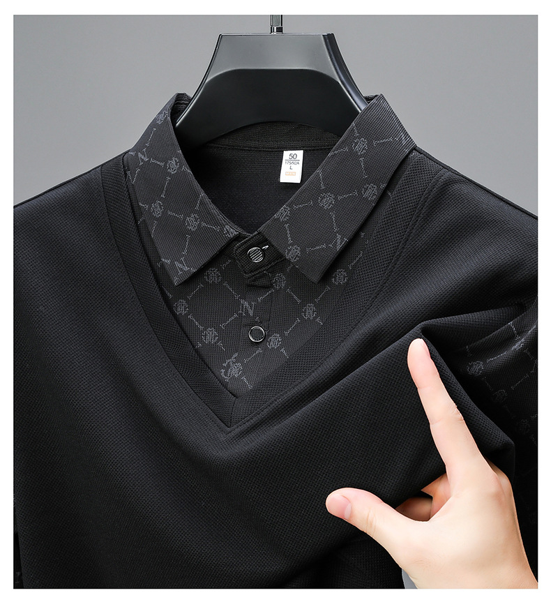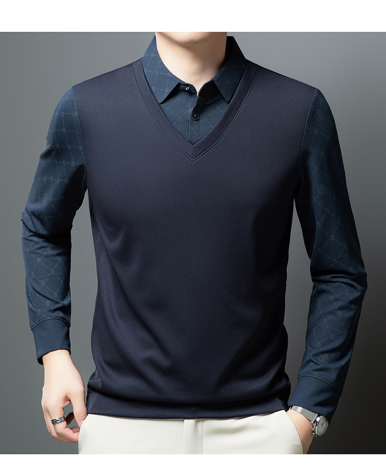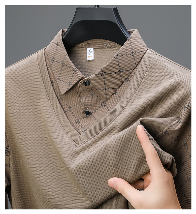 중년 및 노인을위한 남성 봄과 가을 새로운 인쇄 옷깃 가짜 투피스 긴팔 셔츠 올 매치 폴로 셔츠 유행 아빠 셔츠