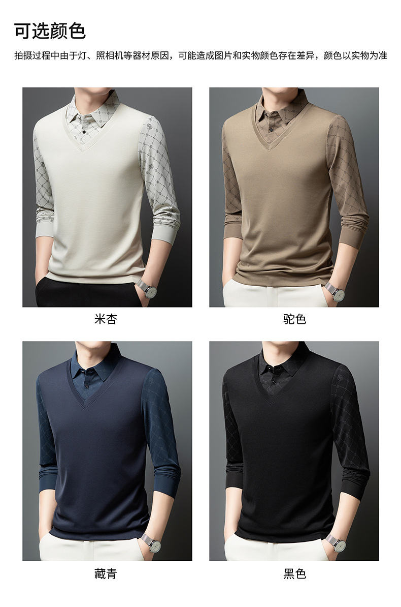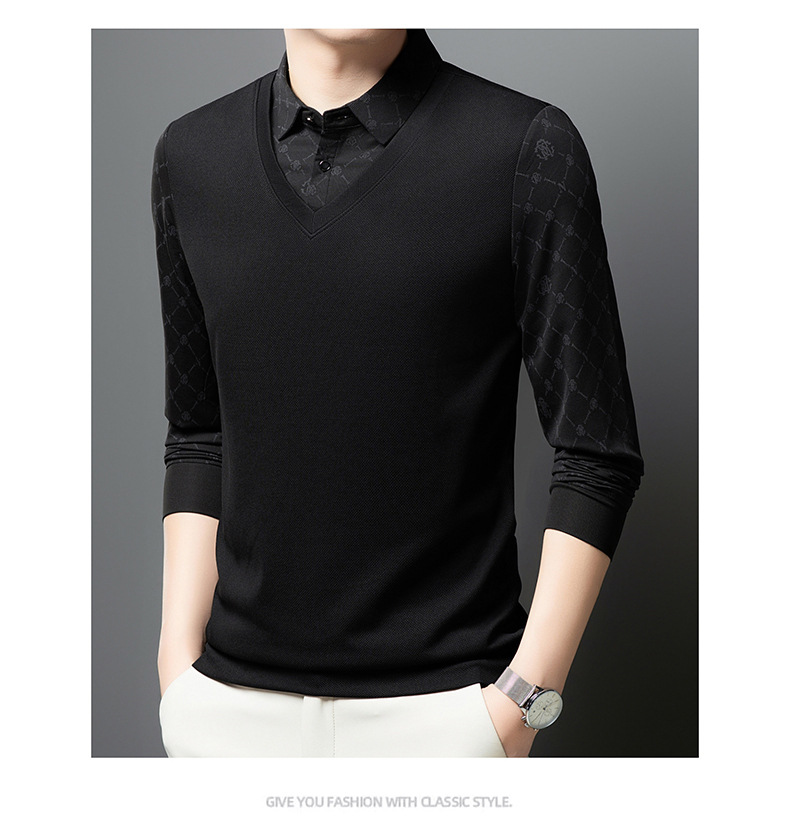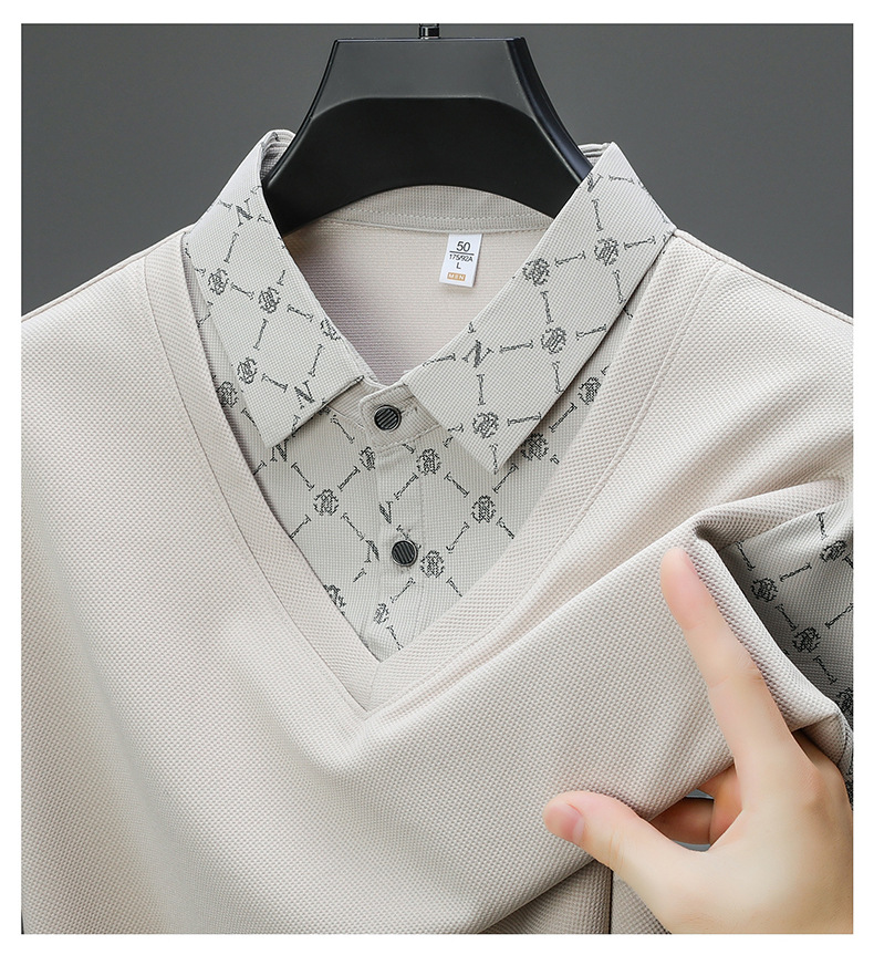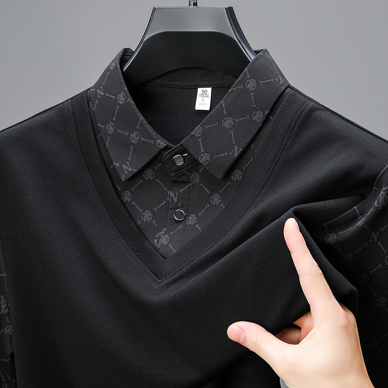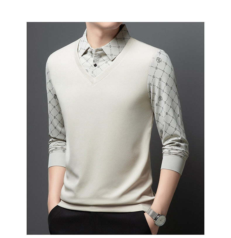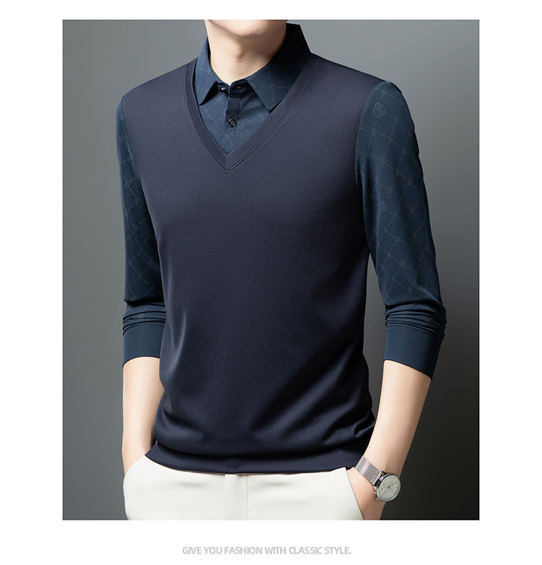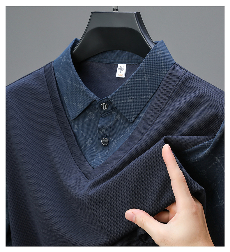 중년 및 노인을위한 남성 봄과 가을 새로운 인쇄 옷깃 가짜 투피스 긴팔 셔츠 올 매치 폴로 셔츠 유행 아빠 셔츠
